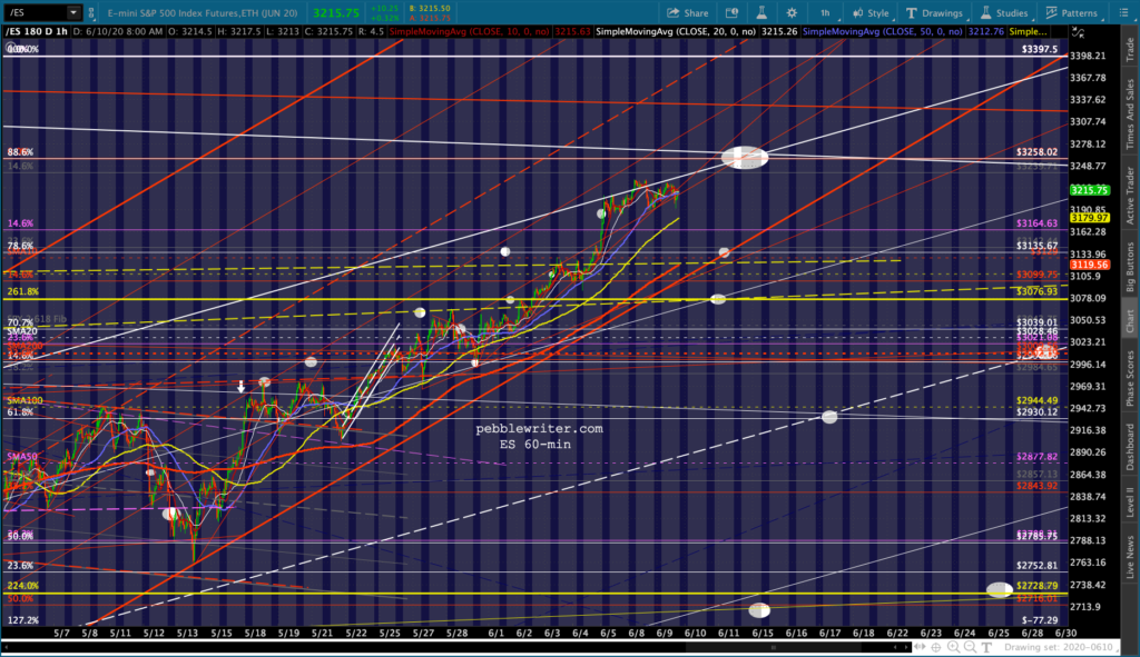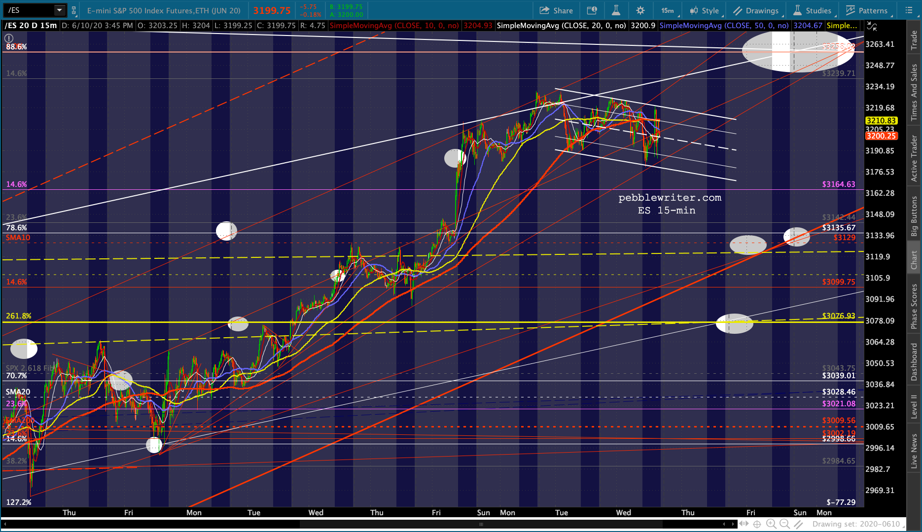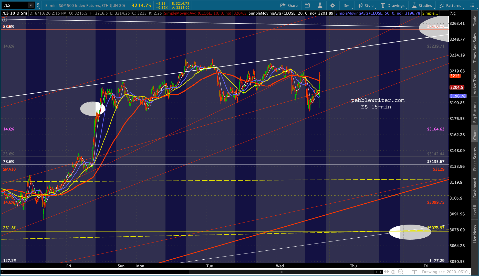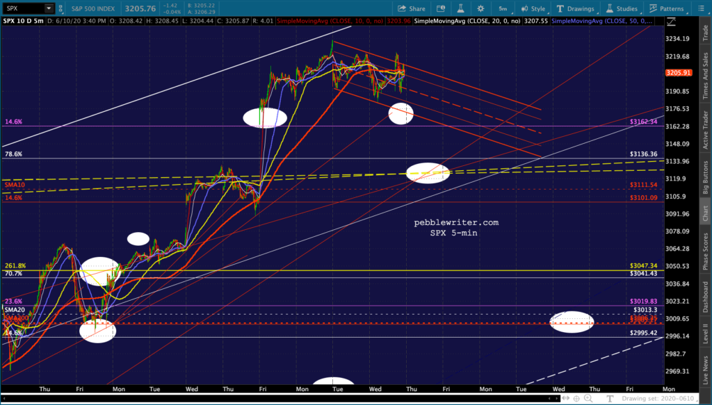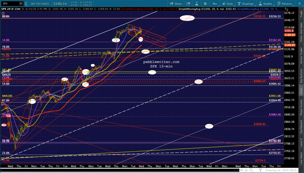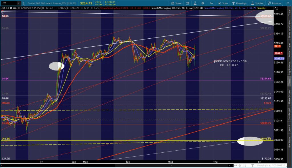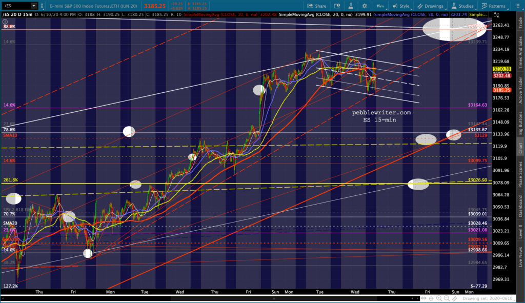 I’m leaning toward a correction beginning today, but am unsure whether the channel bottoms at ES 3076 and 3122-3135 will hold or not. It depends a great deal on what Powell says later today.