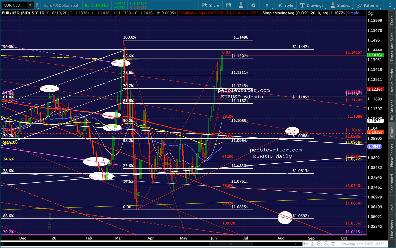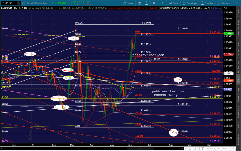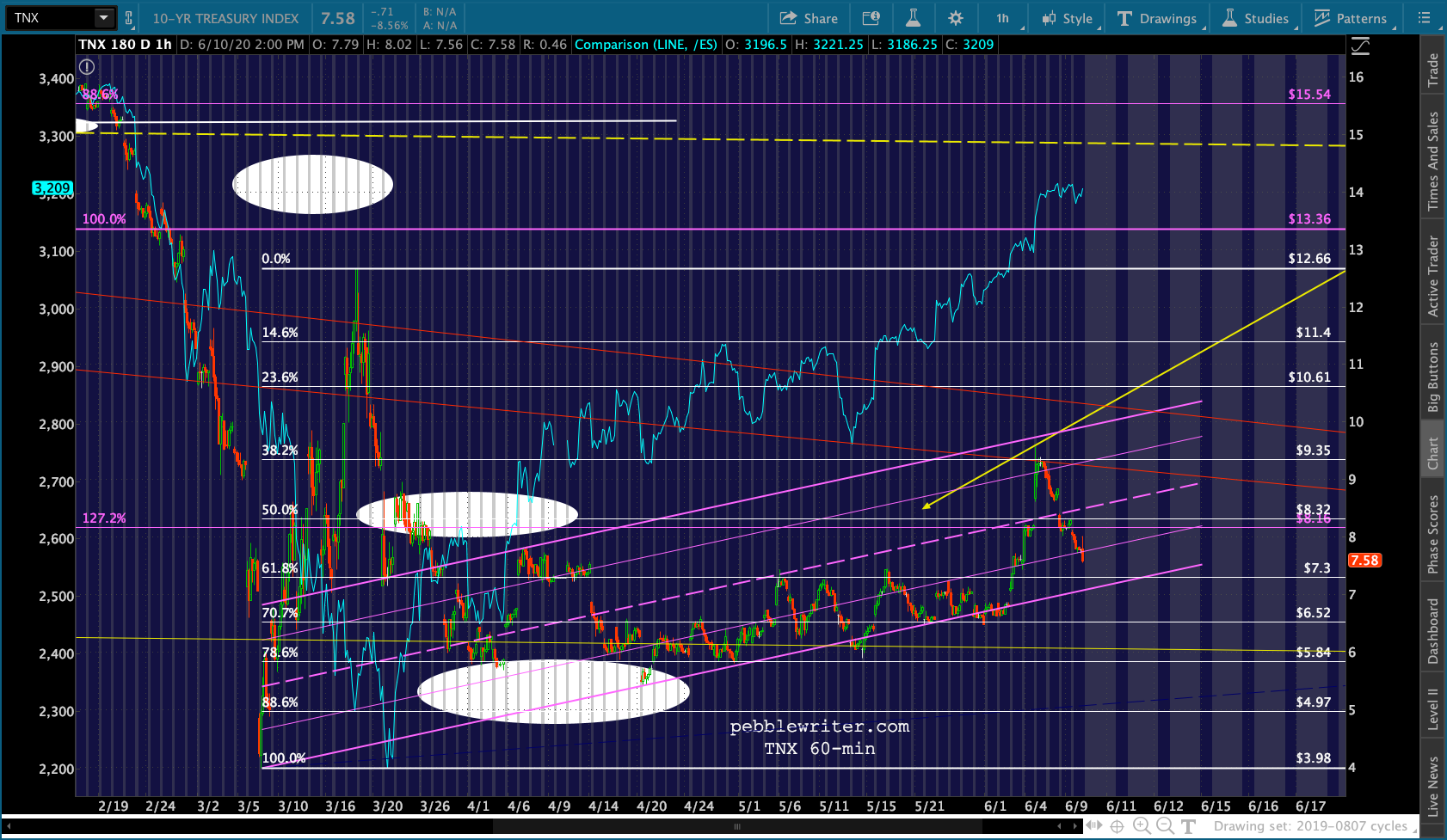 I see two bullish scenarios and one bearish. Bullish: we get a sell off (perhaps to the .786 at ES 3135) following today’s Fed action followed by a rebound into the end of the quarter; or, we see stocks continue to inch higher toward the .886 and then hang around for another two weeks until the end of Q2. Bearish: the market pukes here at or near the .886 and resumes a long, deep correction.