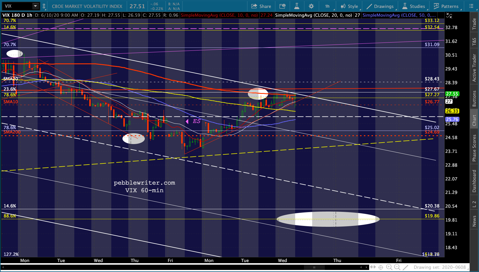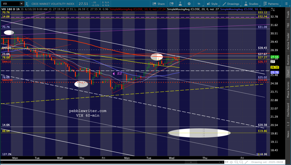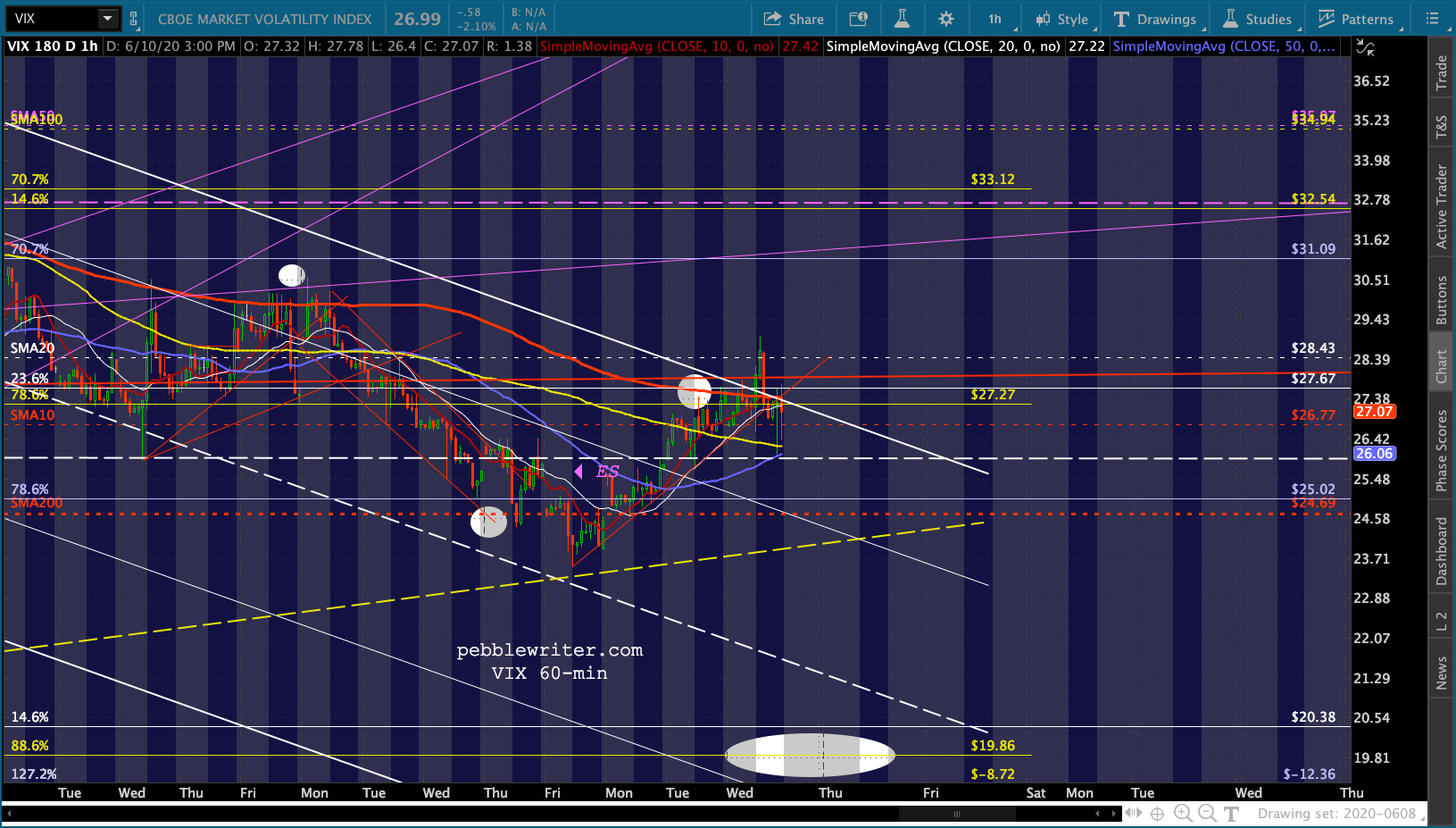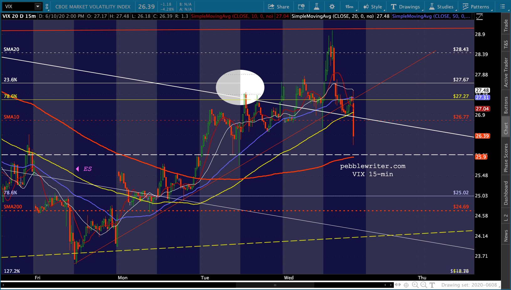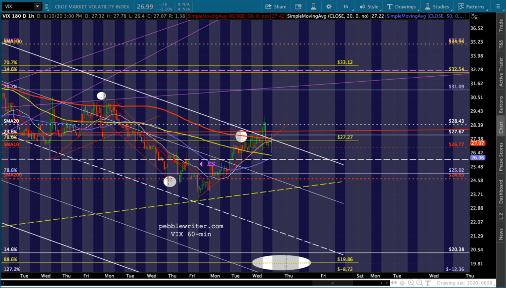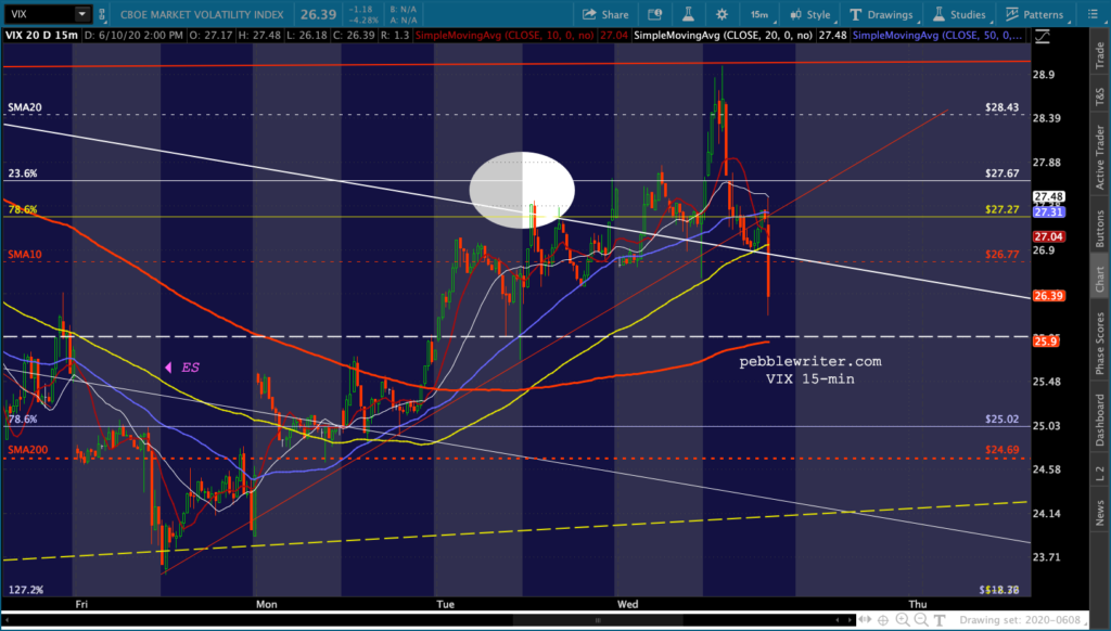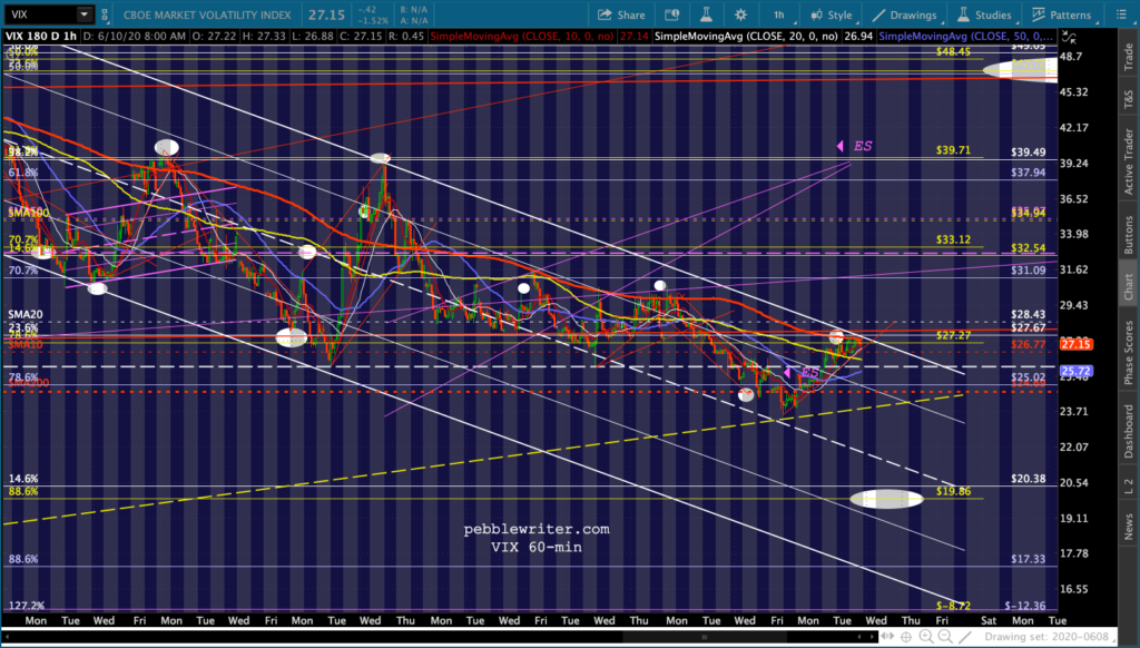 In terms of managing the rally/breakdown, the usual suspects are in play. VIX will either break out of the falling white channel or break down below the little red TL, the SMA200 and, ultimately, the larger yellow TL.