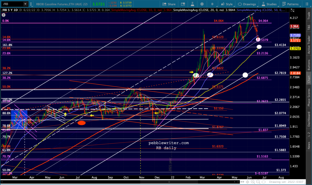 Since then, it’s seen a series of fits and starts, holding an internal trend line and flirting with reentering the white channel. It’s flirting no more. Against the backdrop of a gas tax holiday and significant demand destruction, it has dropped through the channel top and the 100-day moving average.