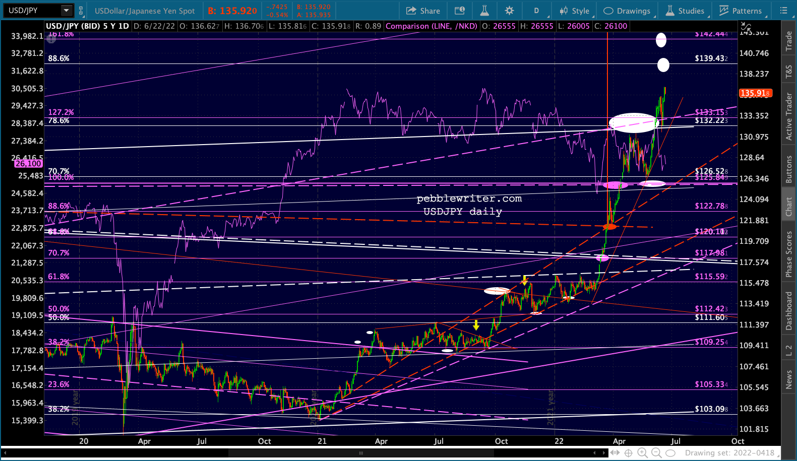 WTI spent May 2020 through Feb 2022 in a fairly well-defined channel (below, in white) as it recovered from its pandemic lows. It broke out on Mar 1, however, topping 100 and taking only 5 sessions to reach our 130 target which wasn’t schedule to happen until December.