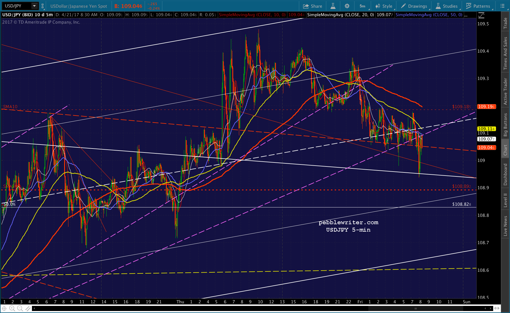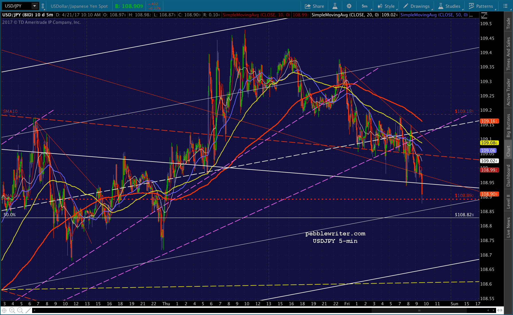 SPX backtesting the SMA5 20 here. I’d revert to short with very tight stops, as VIX is pushing higher, CL hasn’t bounced, and USDJPY stopped at a backtest of the purple TL and red neckline.