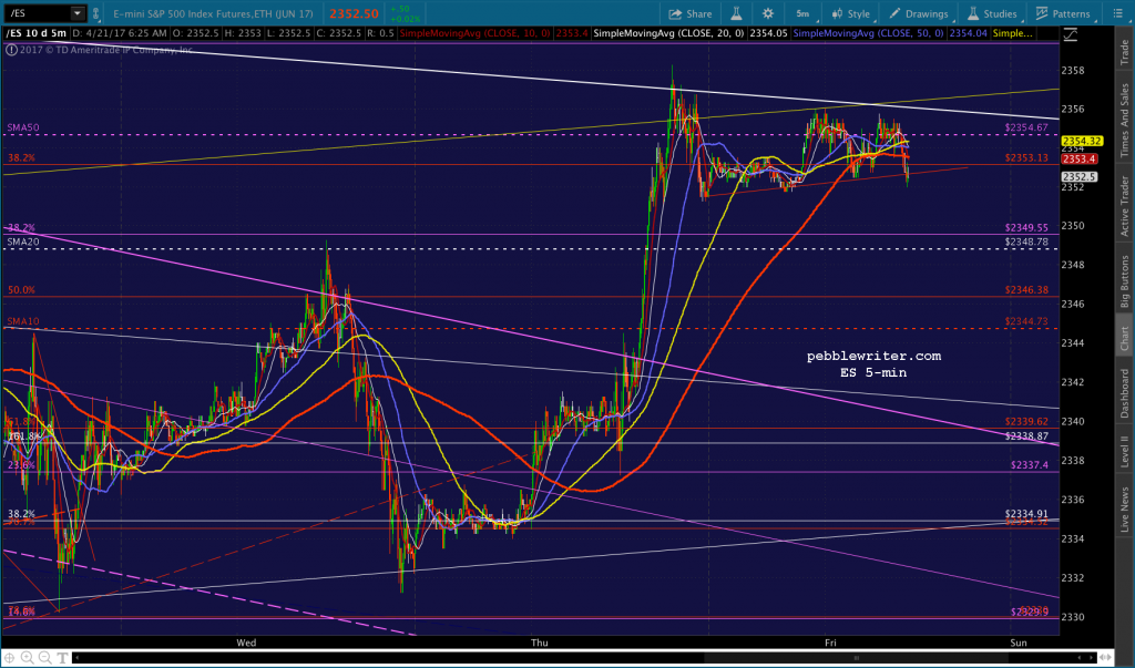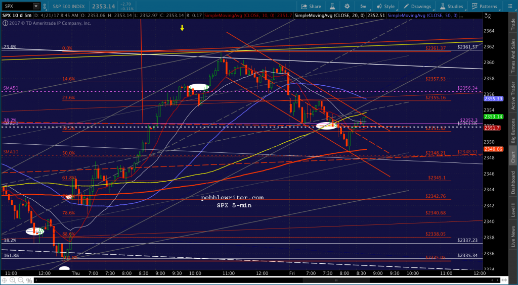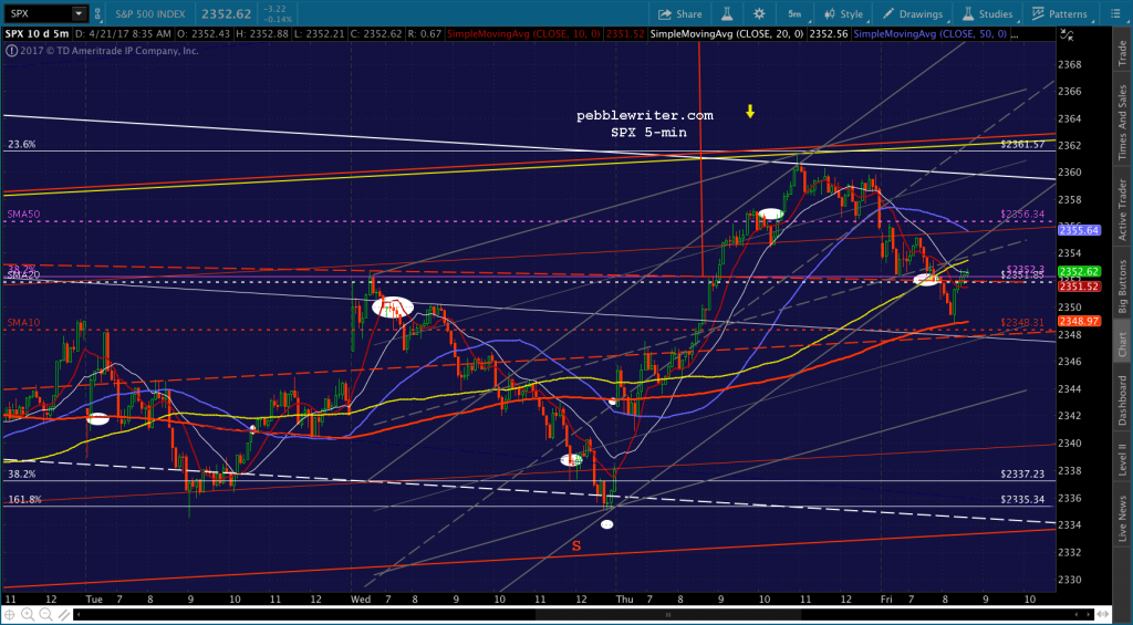 I did a little fine tuning on SPX’s IH&S, which points to the white .146 at 2376.57. The neckline is at about the SMA20 at 2351.85. The yellow SMA5 100 will be there shortly (10.35ish), so we’ll look at that as the first level of support to worry about.