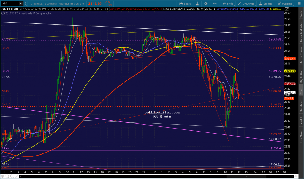 Very close to covering here as VIX is about to drop through its SMA10 and we’re getting the SMA5 10/20 cross. But, we’re also coming up on 12:00, so it might fade. Keep an eye on VIX to see if it bounces off 14.60. If it does, SPX has potential down to the SMA10 at 2348.21, and after that to 2345.10 (provided, of course, it can drop through the neckline — which is where a big VIx bounce would really help.)