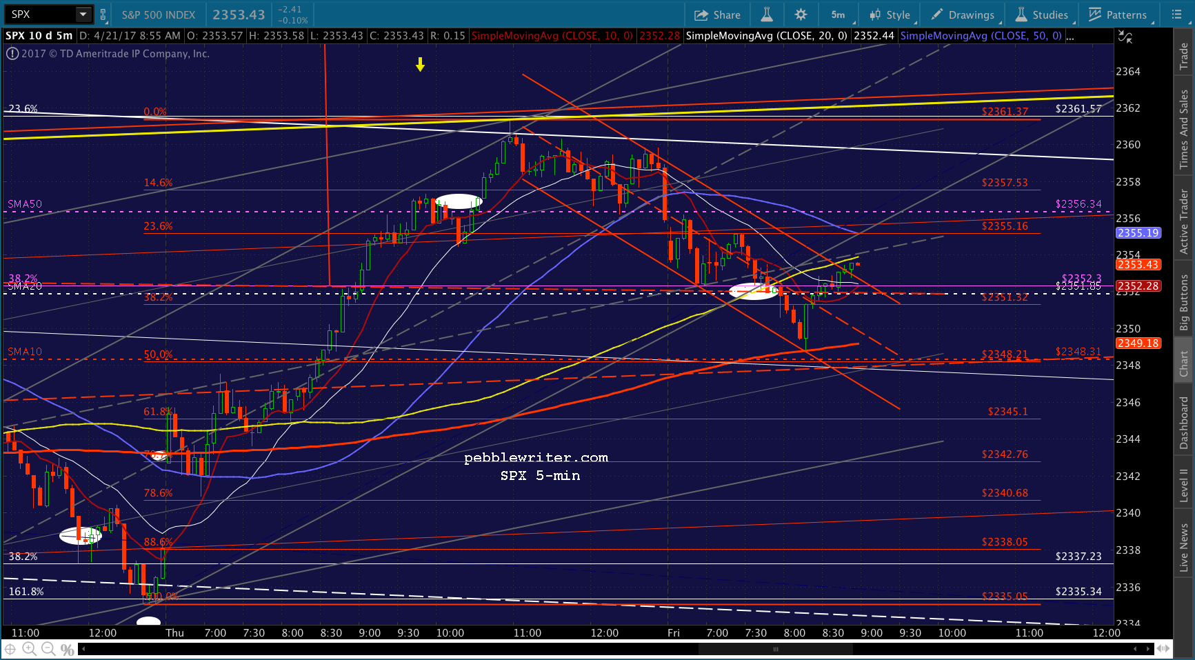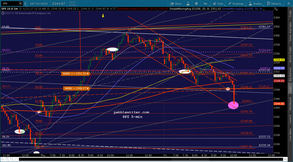VIX’s SMA5 10 has caught up with it, providing an opportunity for VIX to break down or bounce. USDJPY is stuck between the neckline and TL. And, CL has bounced back above the .618. Watch your stops. Remember, SPX’s red neckline is right here at 2351.9, so there’s much at stake for the bulls.