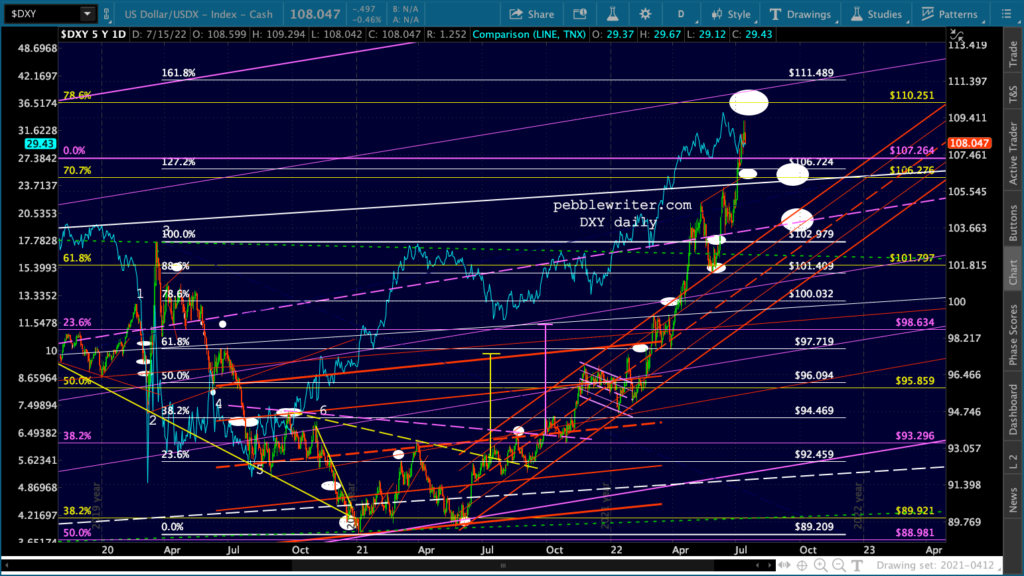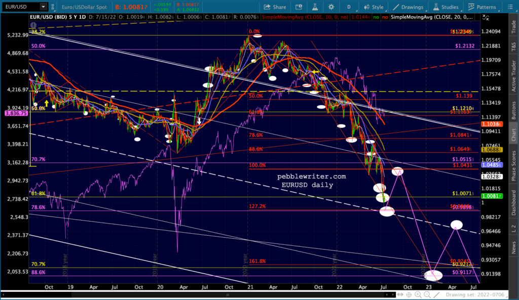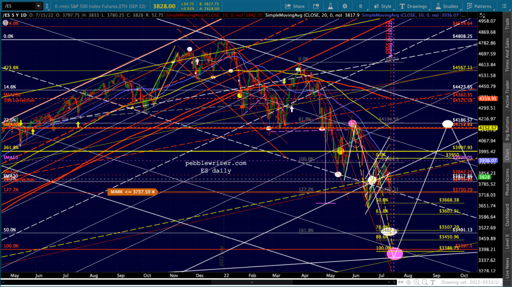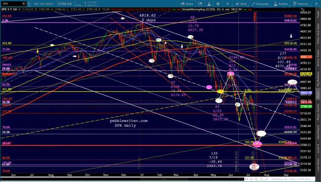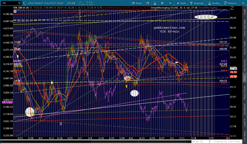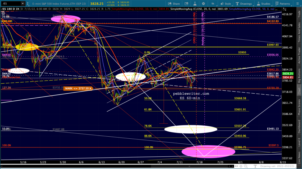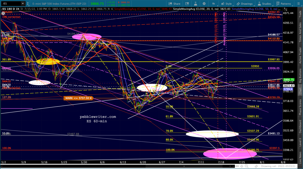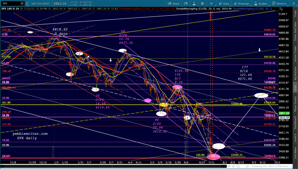 It’s not easy to remain bearish on a day like today. But, then again, that’s the whole point of day’s like today: to convince bears to give up their shorts/puts and bet instead on a rally. Note the falling purple channels are very well defined for both ES and SPX.