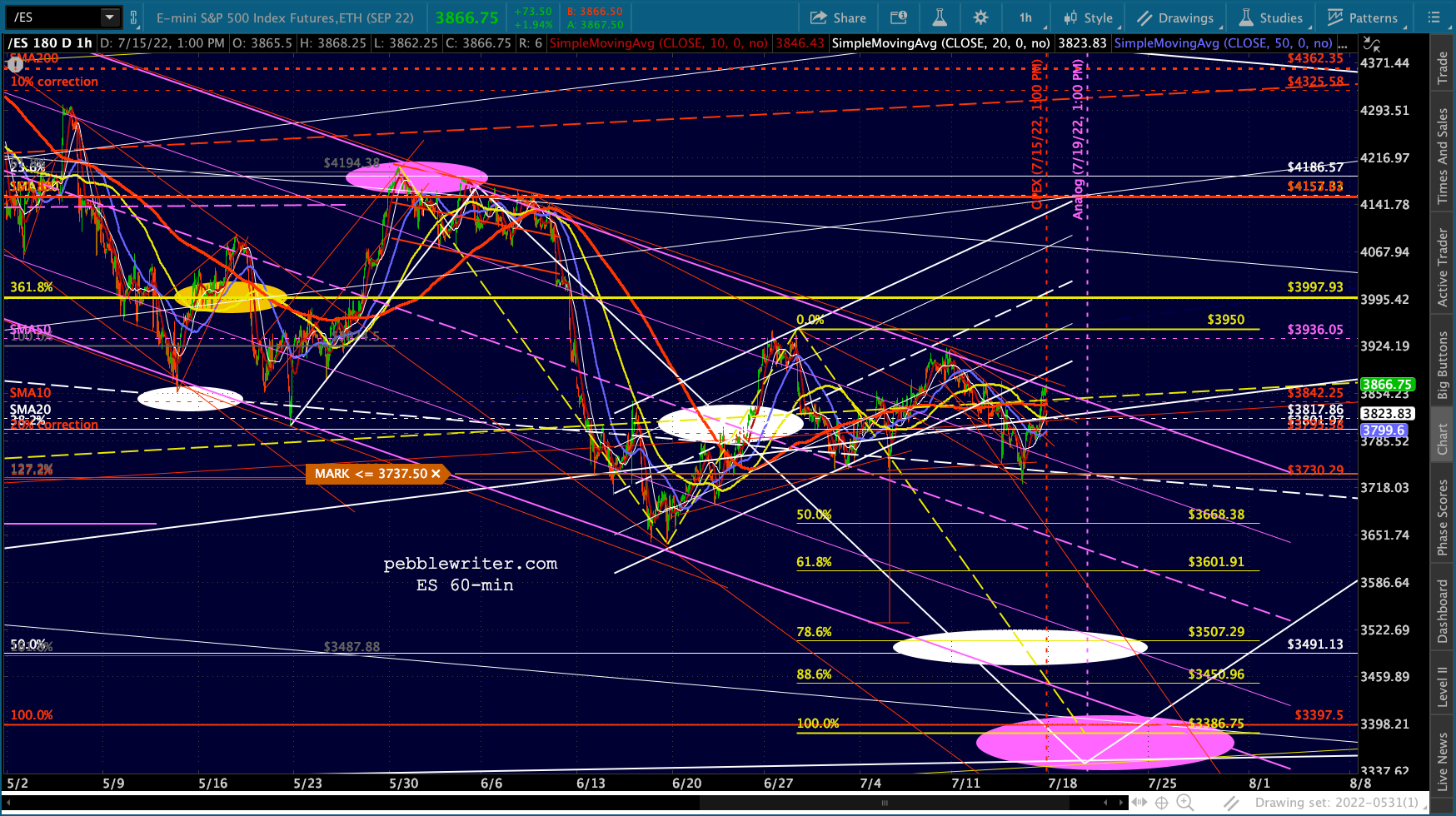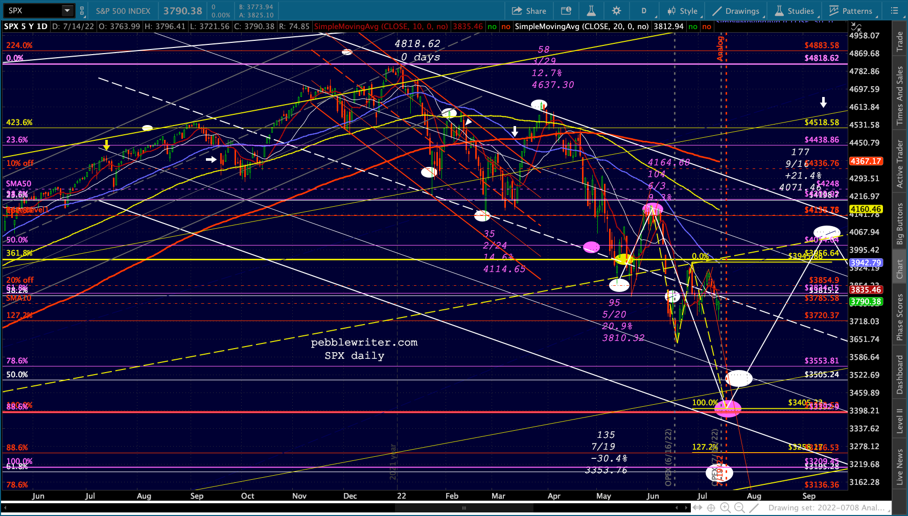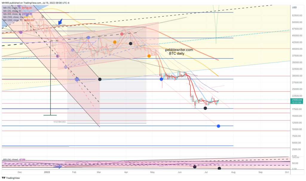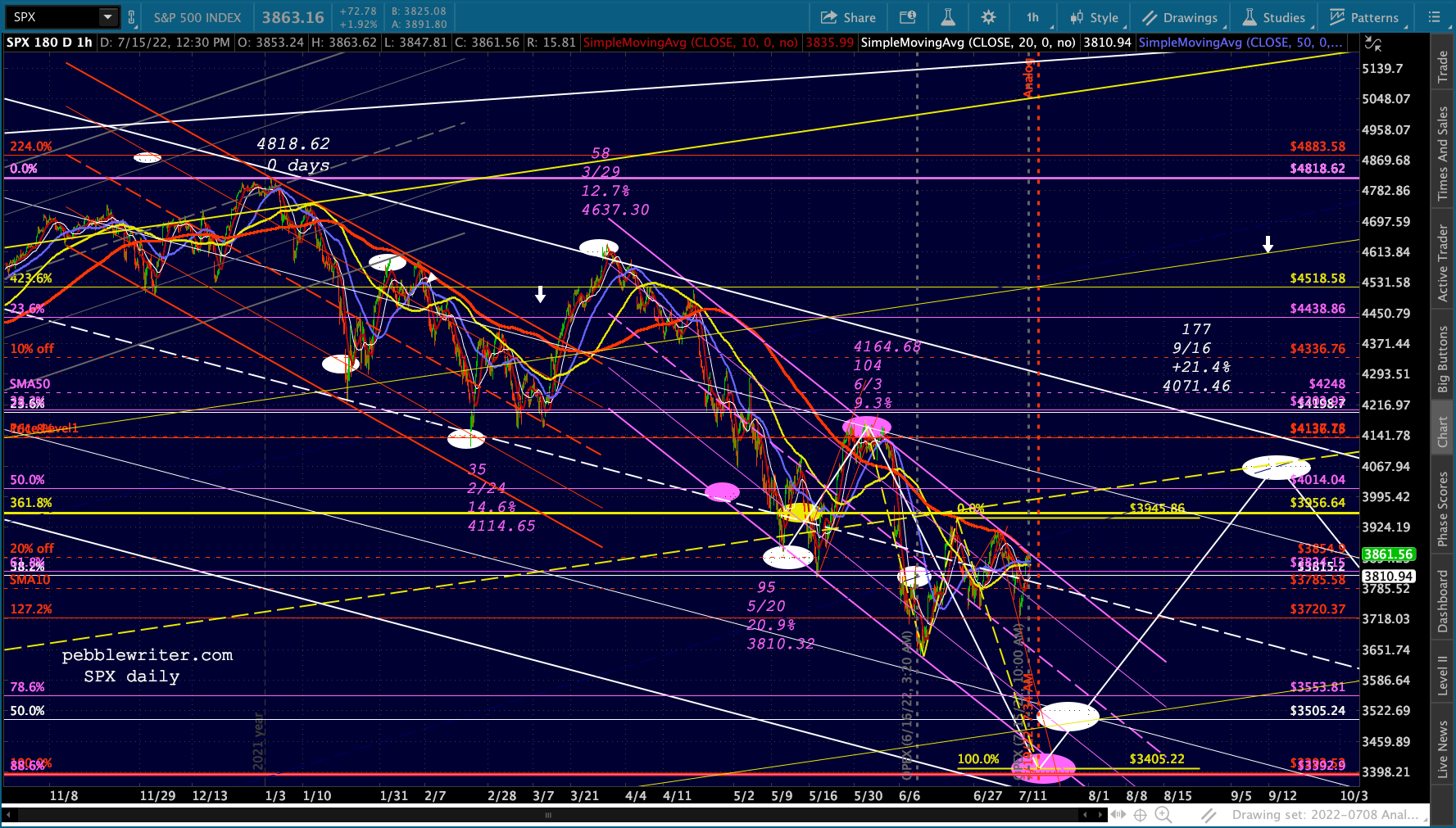 It’s not easy to remain bearish on a day like today. But, then again, that’s the whole point of day’s like today: to convince bears to give up their shorts/puts and bet instead on a rally. Note the falling purple channels are very well defined for both ES and SPX.