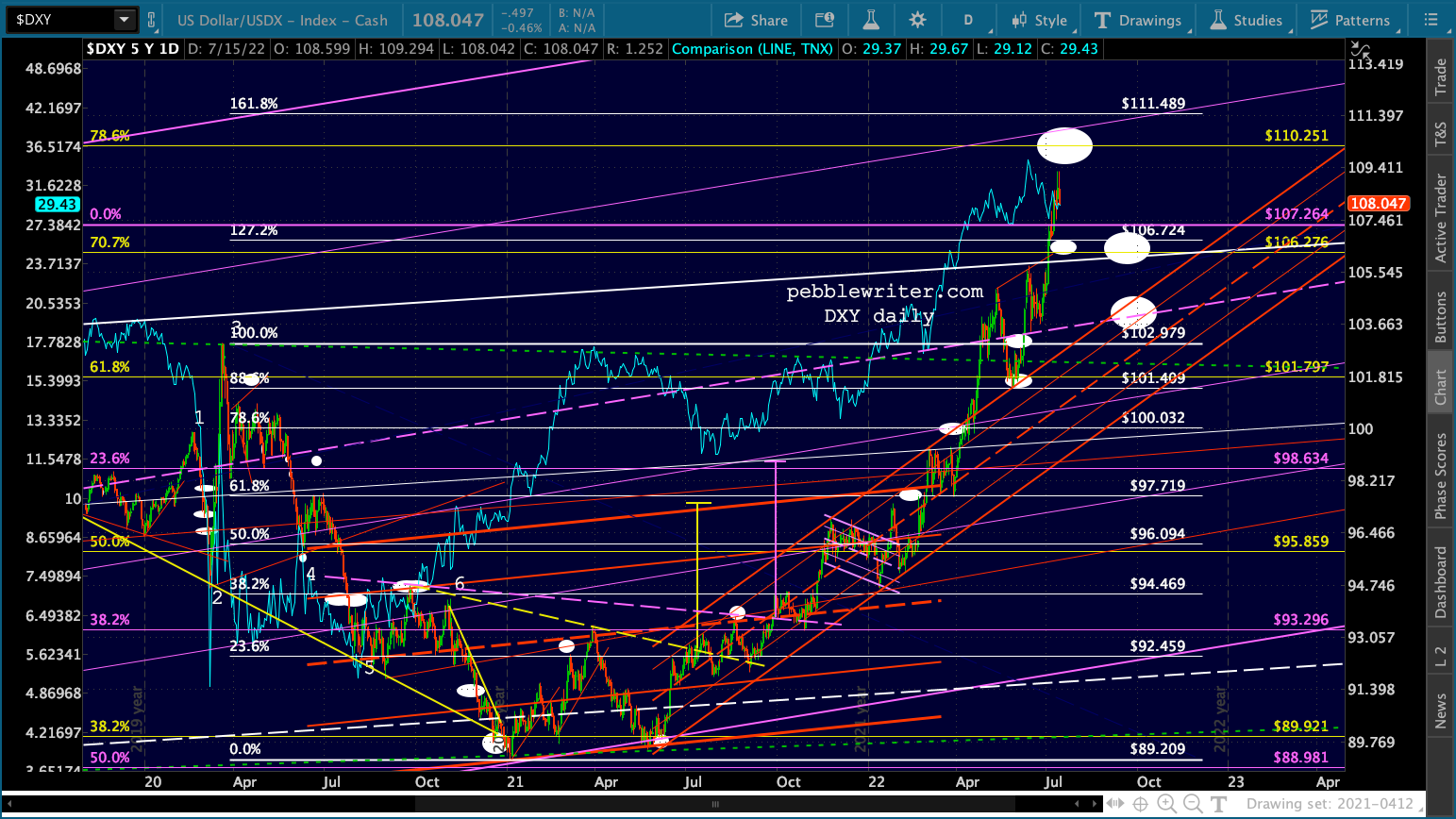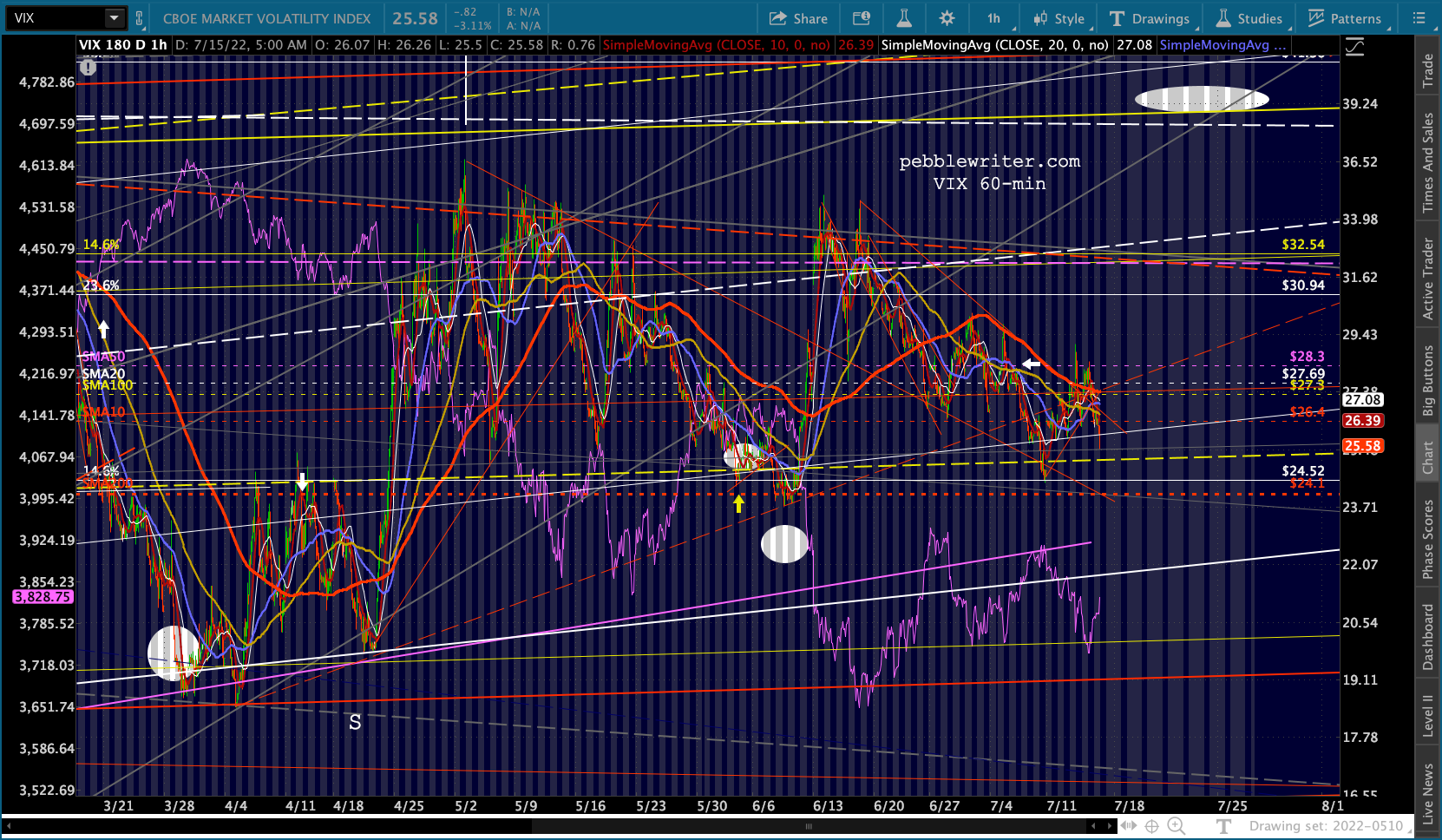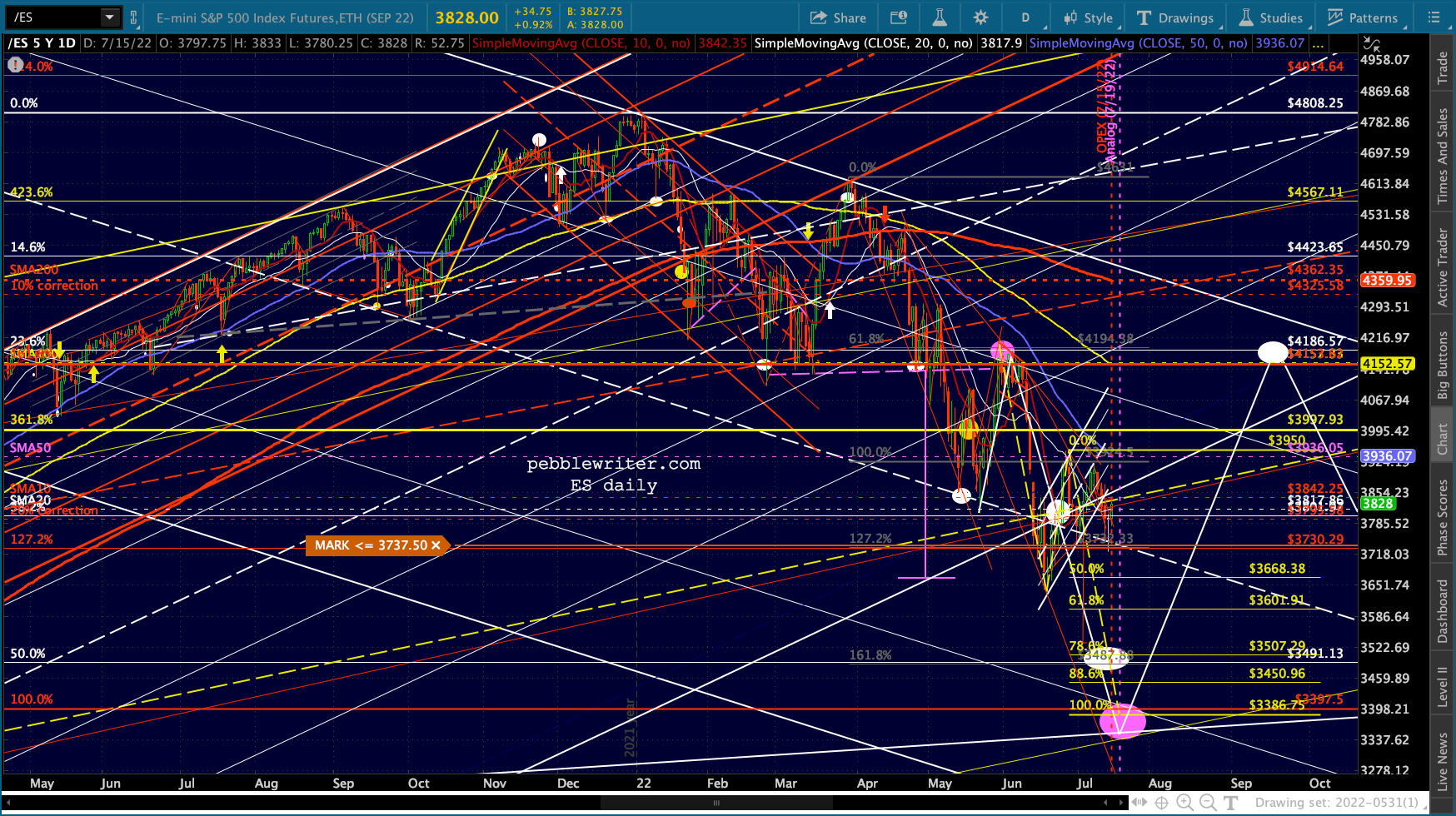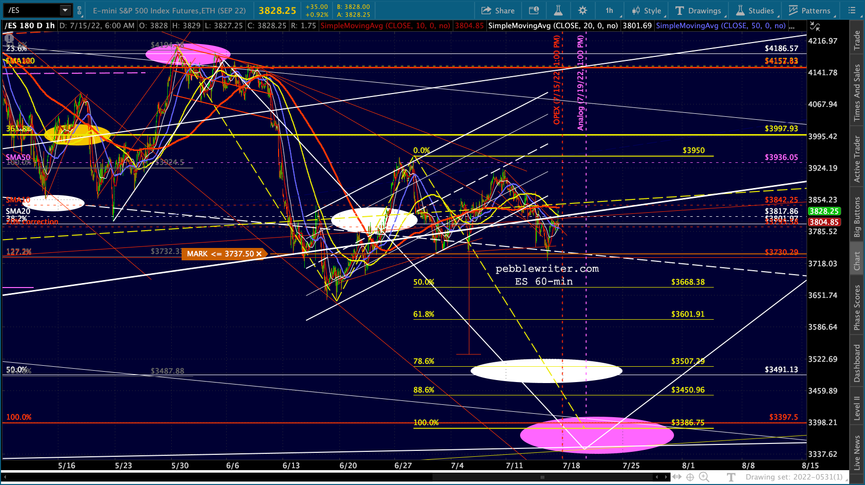 It’s not easy to remain bearish on a day like today. But, then again, that’s the whole point of day’s like today: to convince bears to give up their shorts/puts and bet instead on a rally. Note the falling purple channels are very well defined for both ES and SPX.