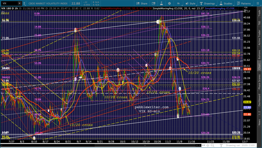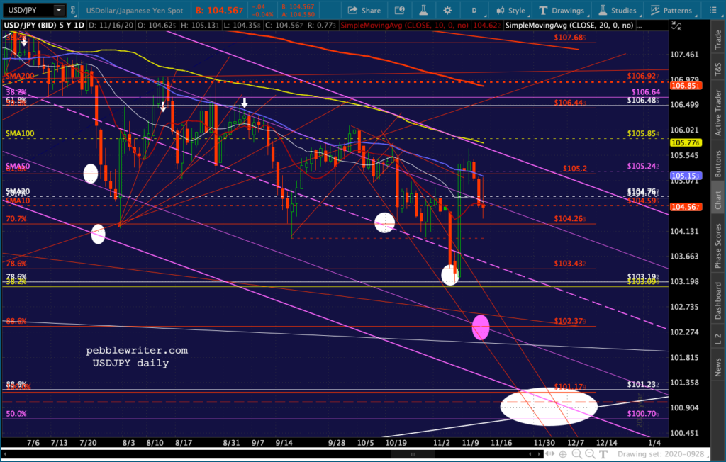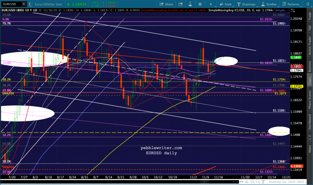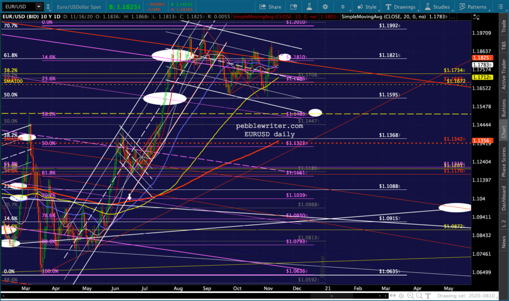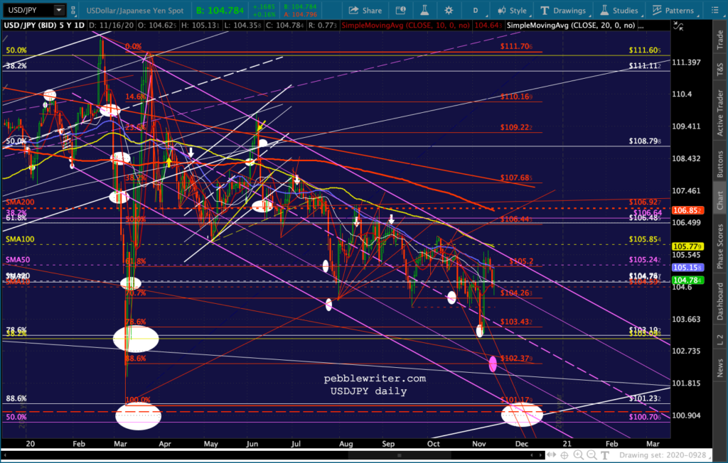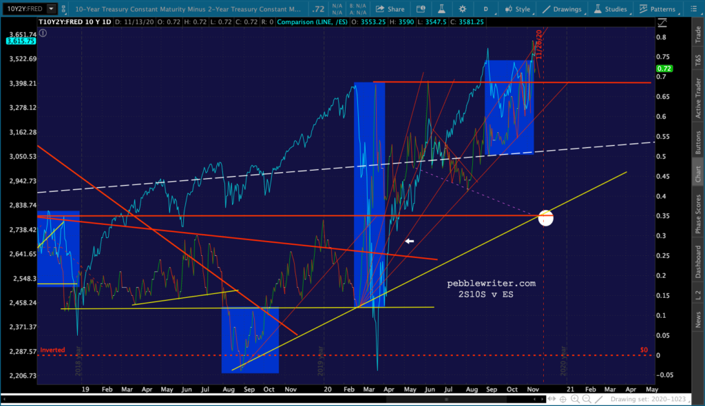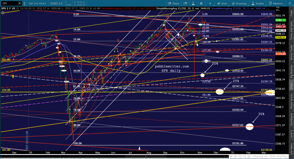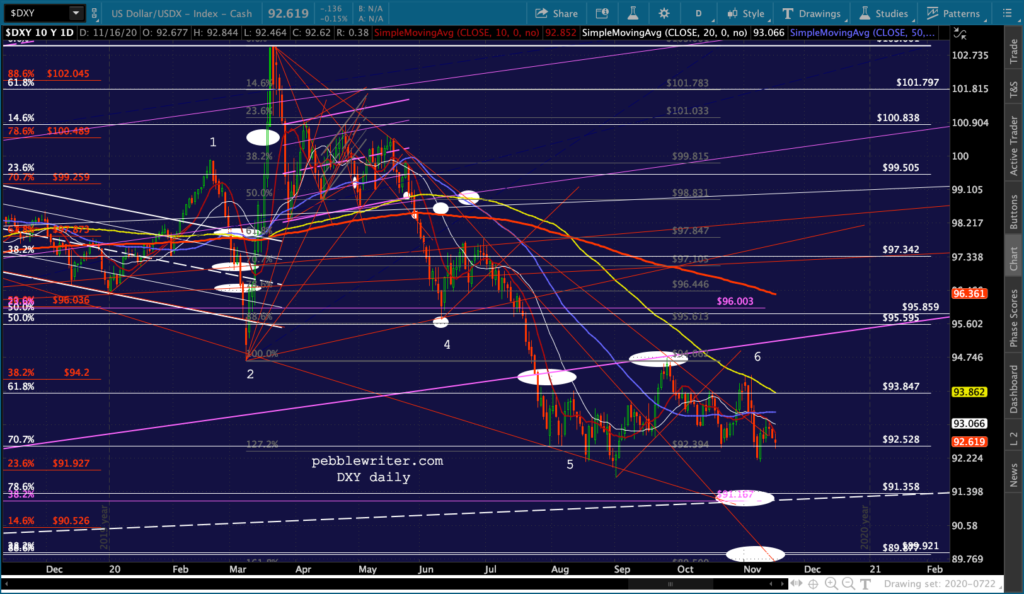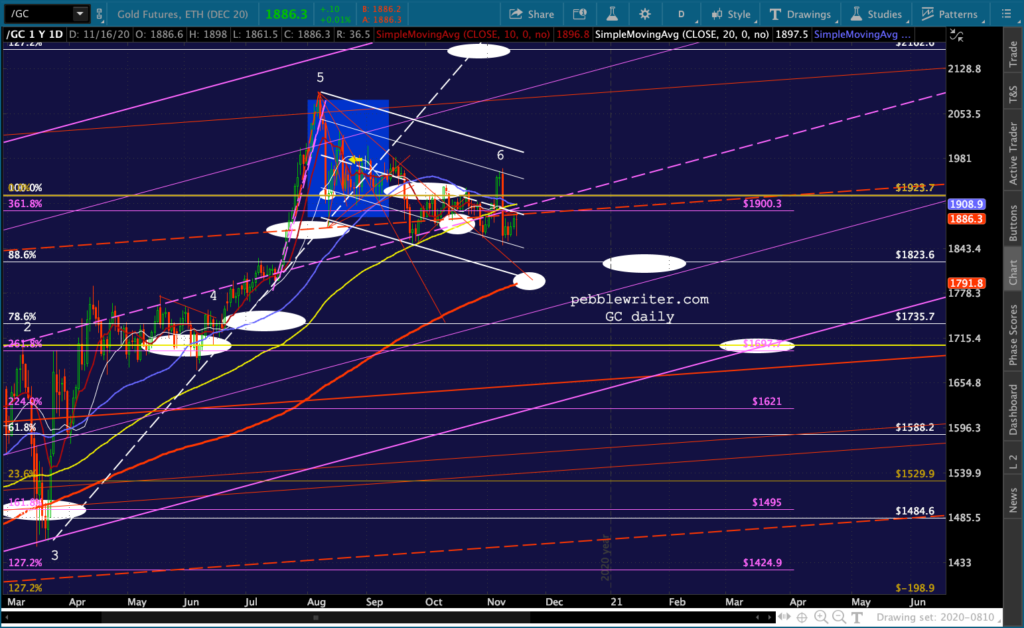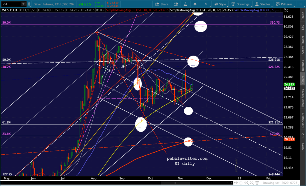 And, the triangle playing out in GC and SI suggest a denouement sometime around Nov 27 – the Friday after Thanksgiving when markets are open but volume is so low that equity prices could easily be “managed.”