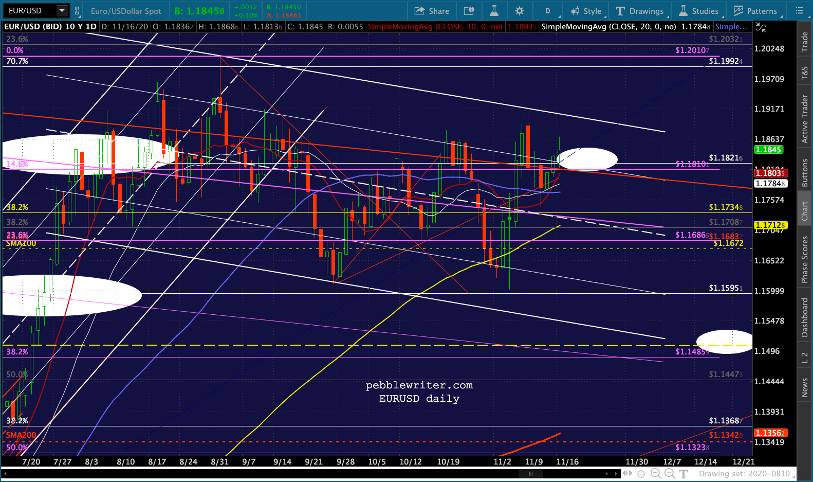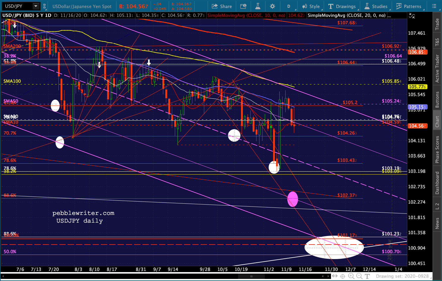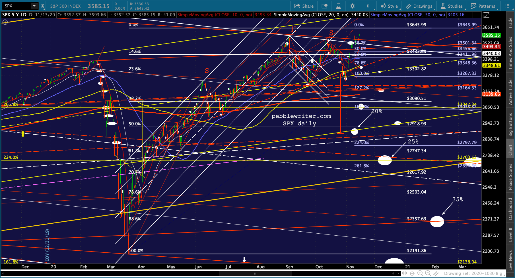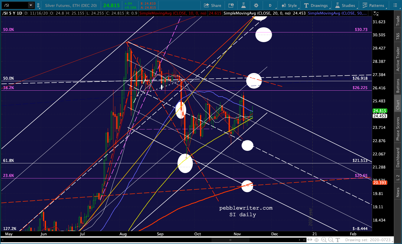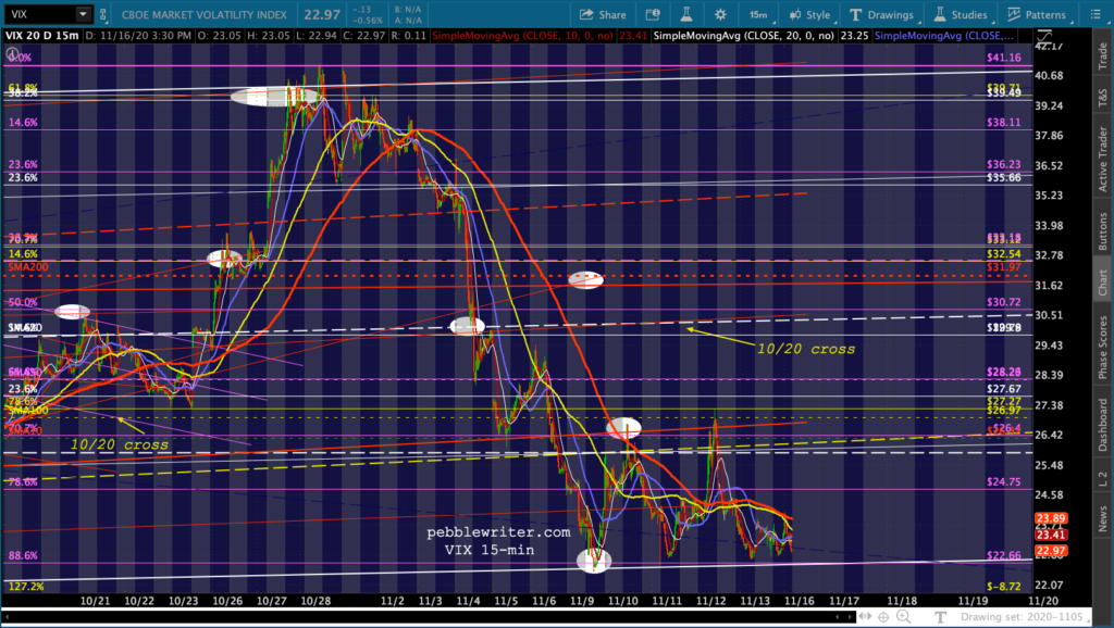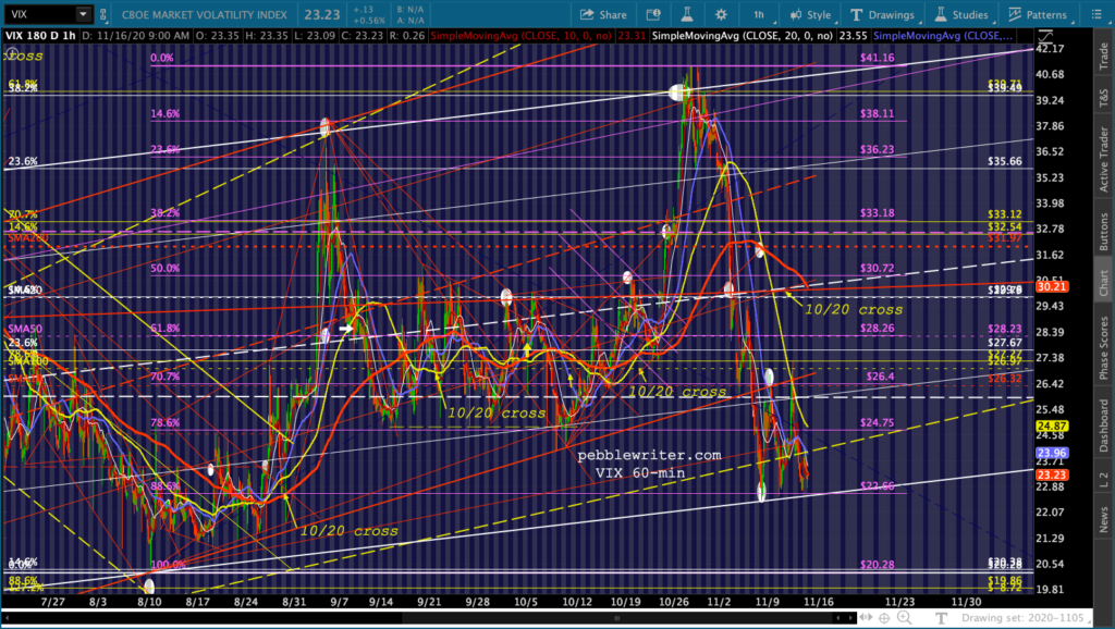 And, the triangle playing out in GC and SI suggest a denouement sometime around Nov 27 – the Friday after Thanksgiving when markets are open but volume is so low that equity prices could easily be “managed.”