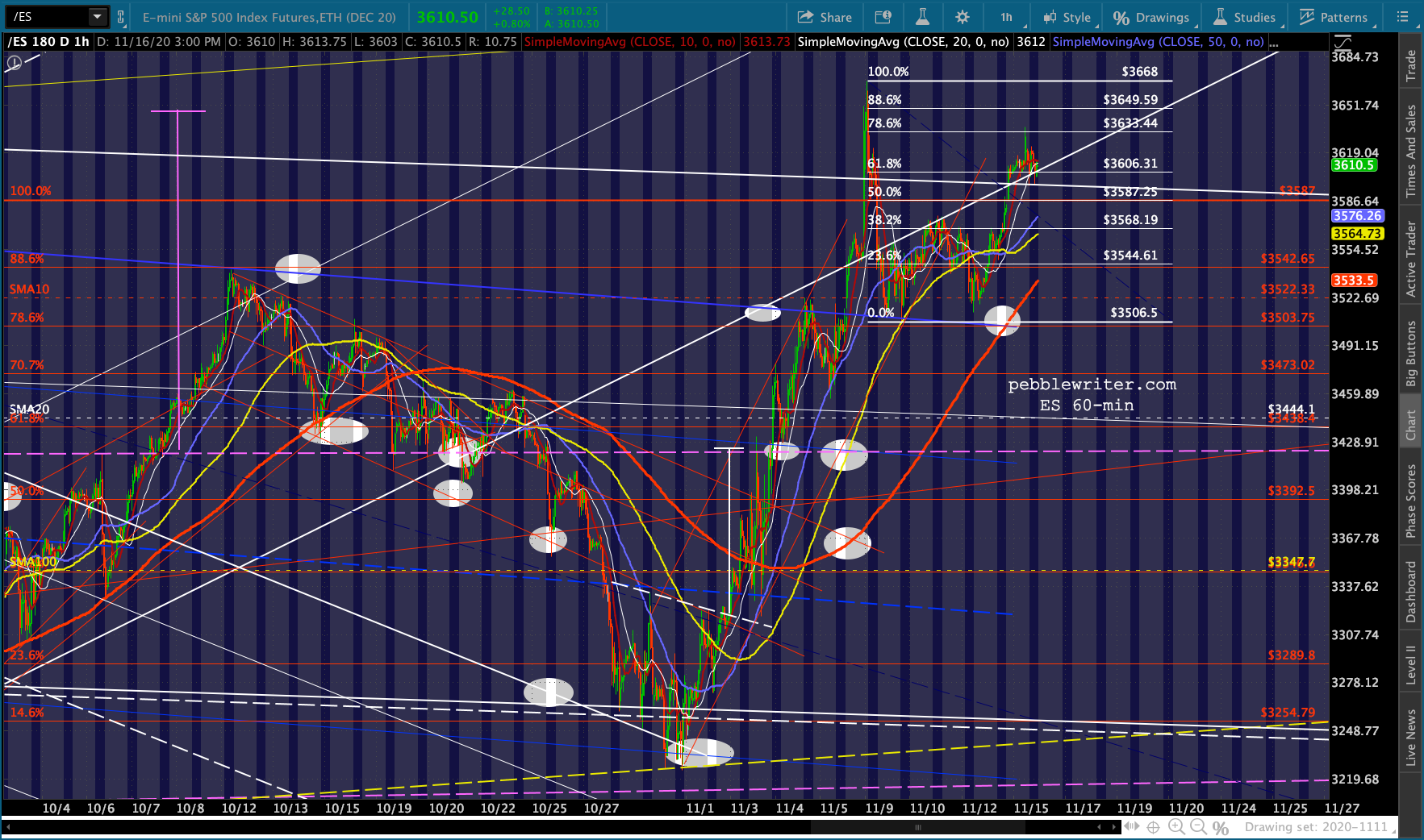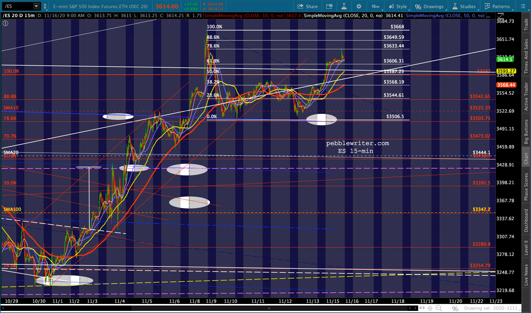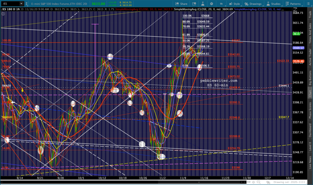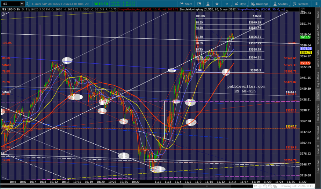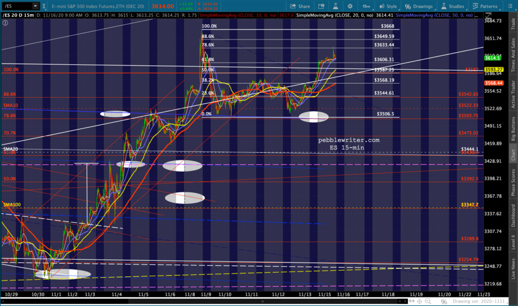 This has enabled ES to continue backtesting the bottom of the broken white channel and, despite breaking down again, enabling a .786 retracement of the all-time high registered on Nov 9.