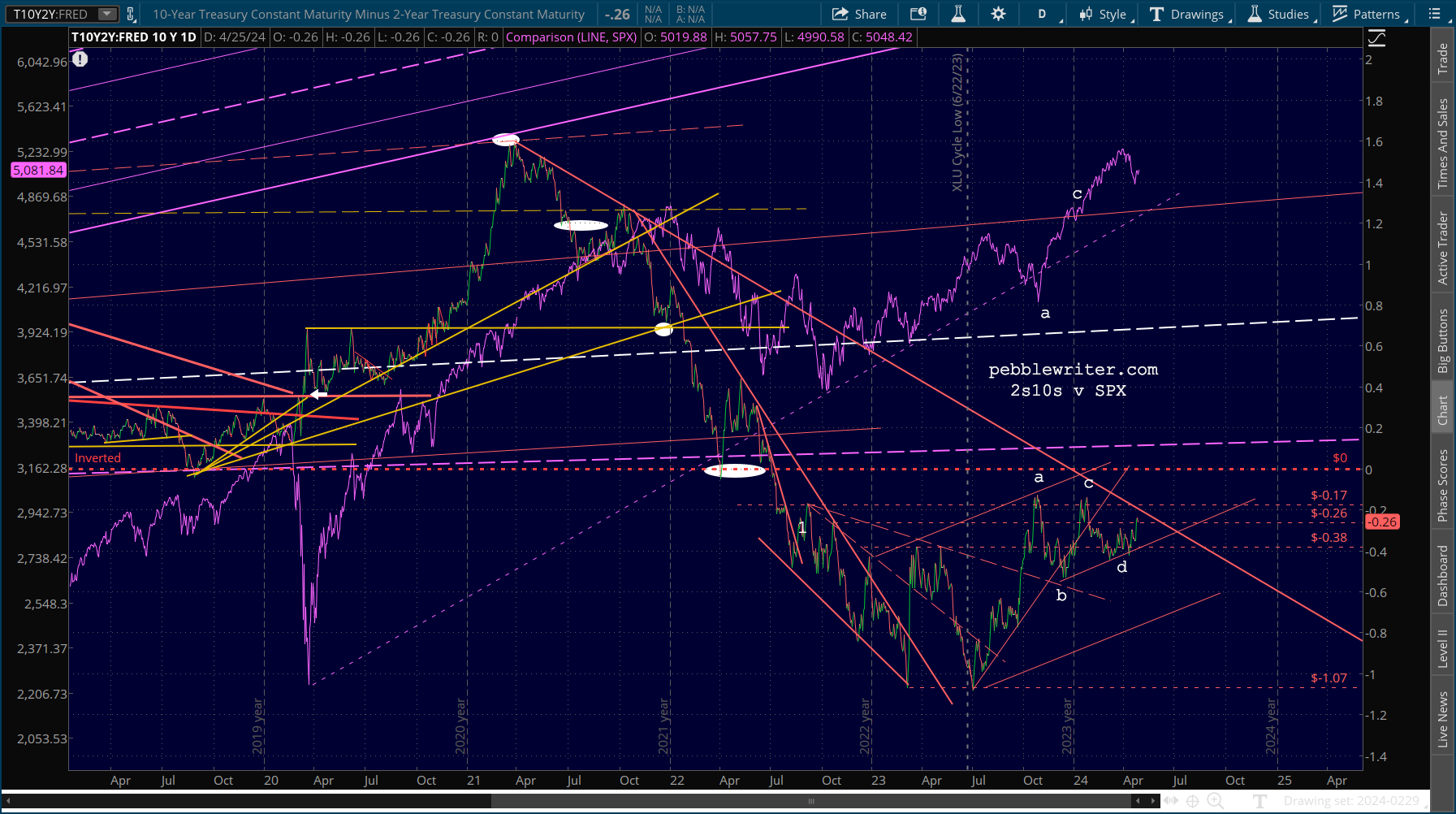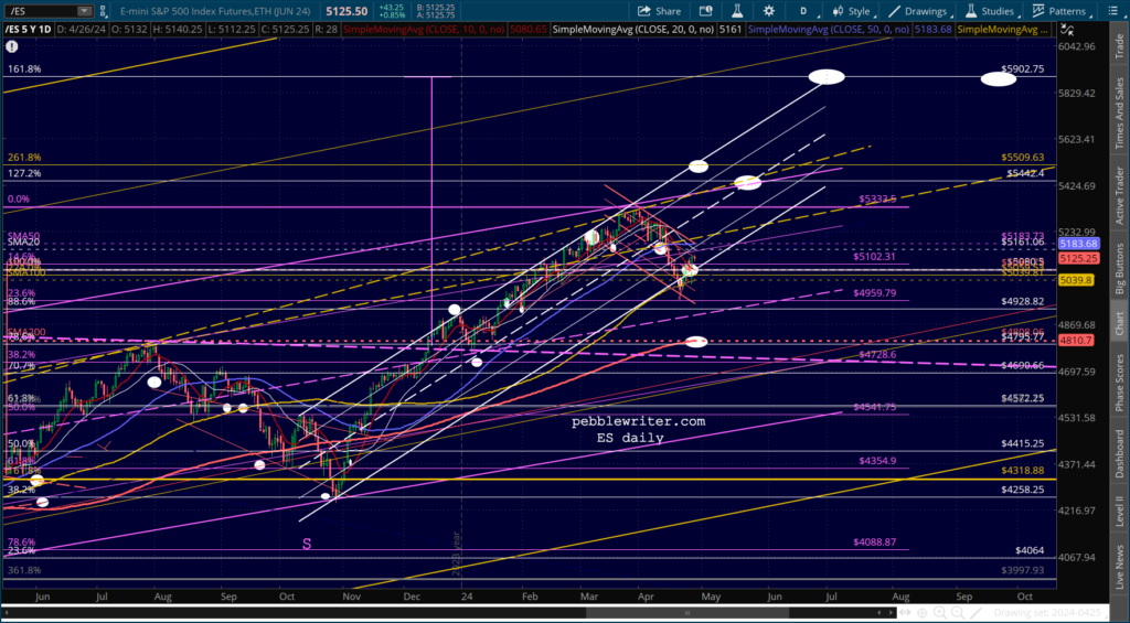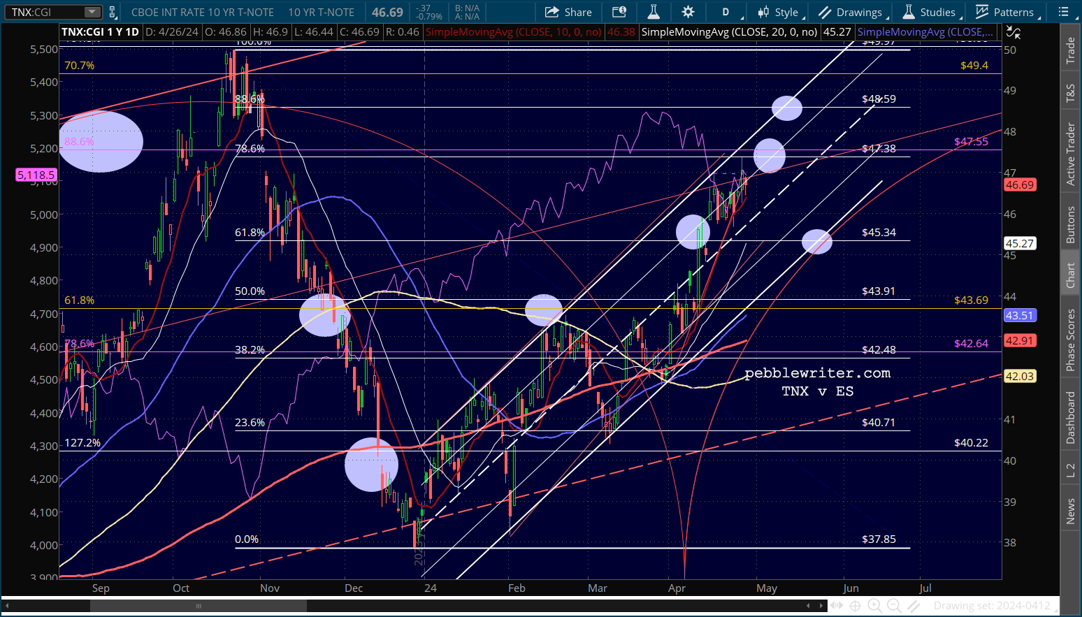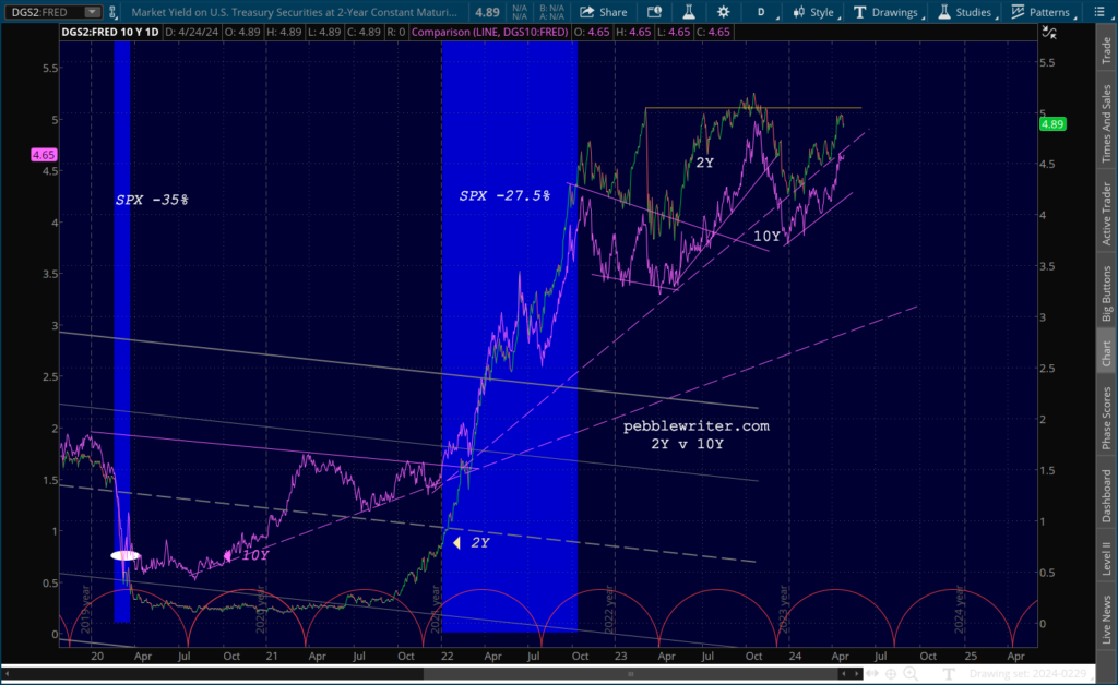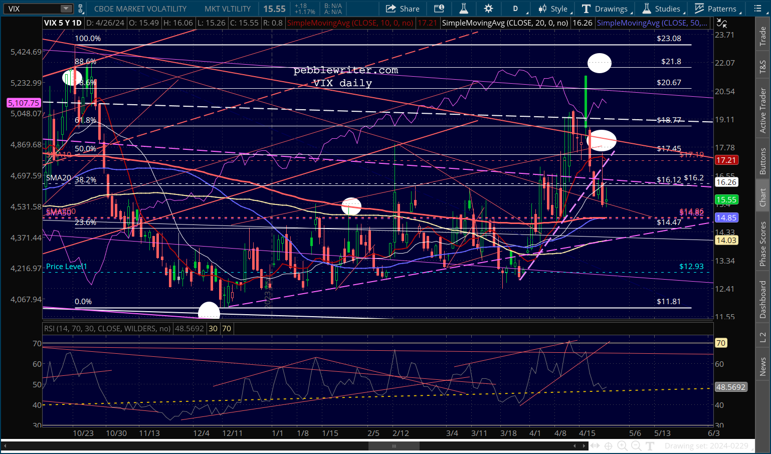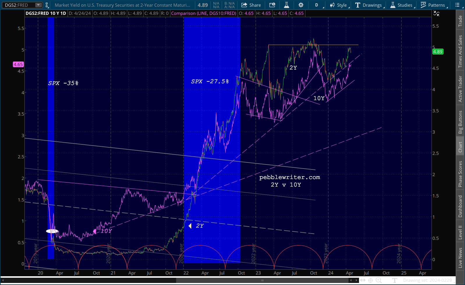 As long as SPX and ES can remain in their rising channels, the 10Y doesn’t top 4.74% and the 2Y doesn’t top 5%, and oil and gas prices don’t rally, the improbable equity rally will probably continue. At some point, it will require that VIX drop through its SMA50 and SMA200 (both at 14.85) and even the purple TL at 14.