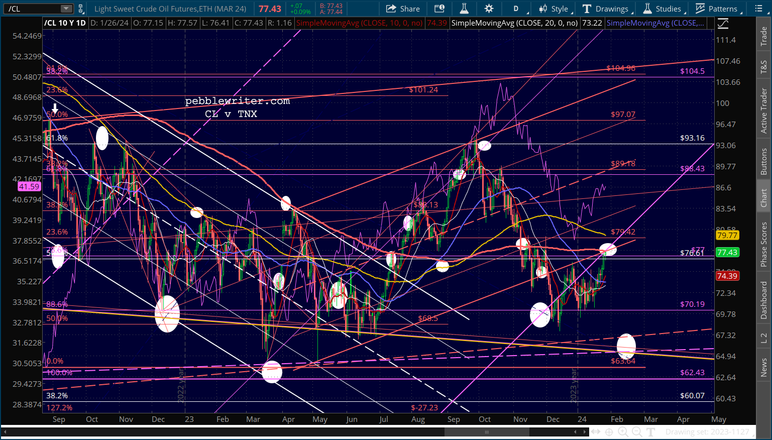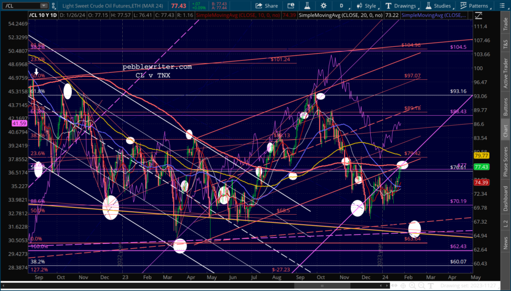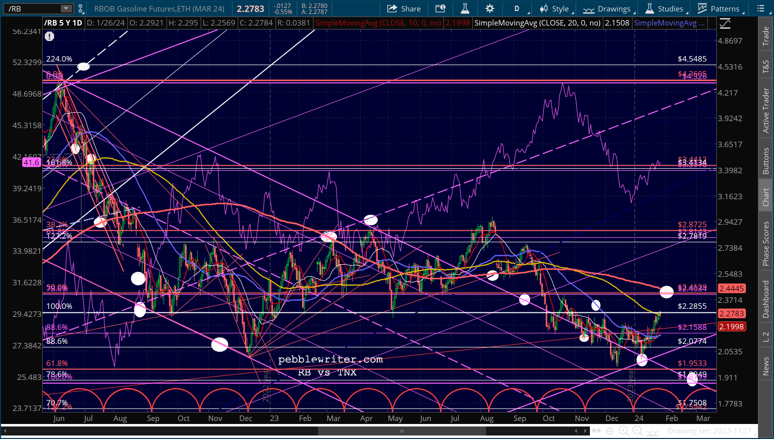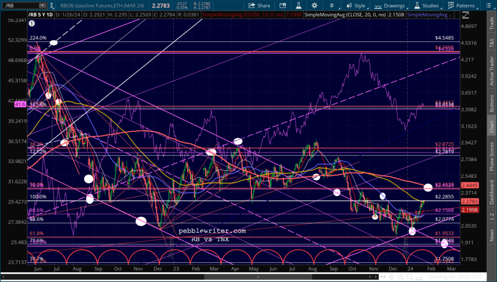 CL has officially reached its SMA200, so could be expected to pull back here. RB is still some way away from its SMA200, but has reached a level of some horizontal resistance.