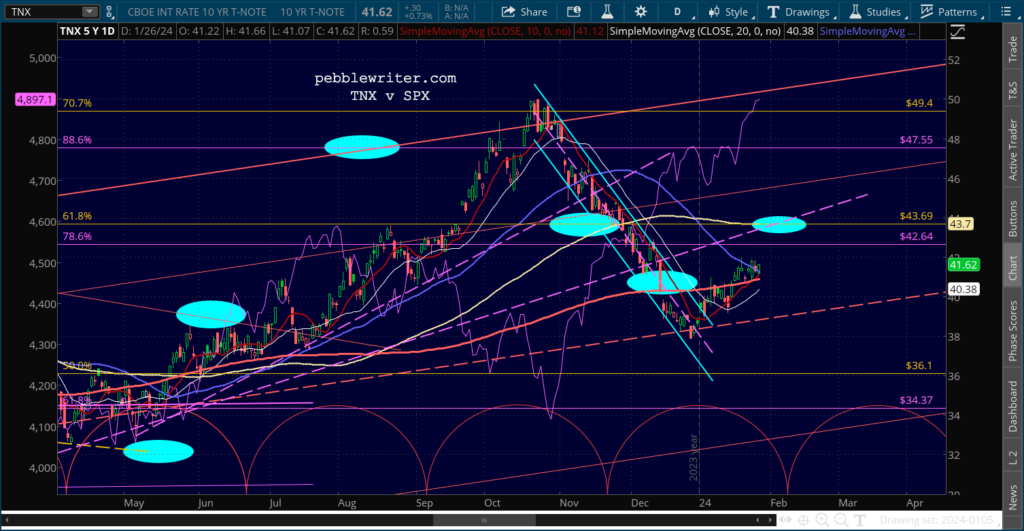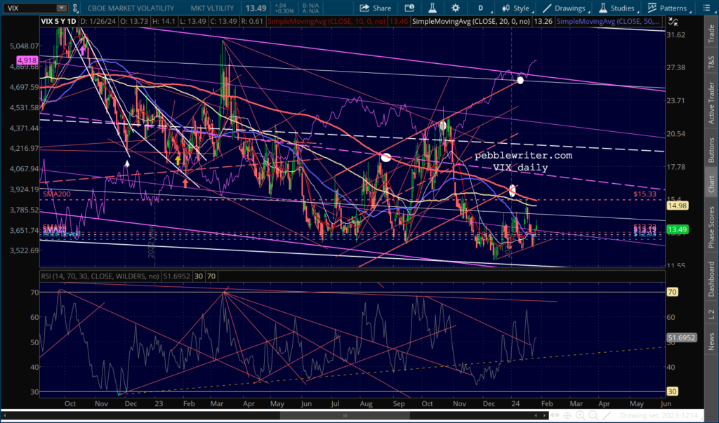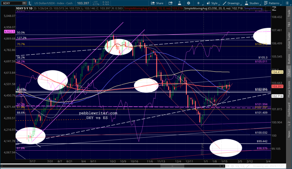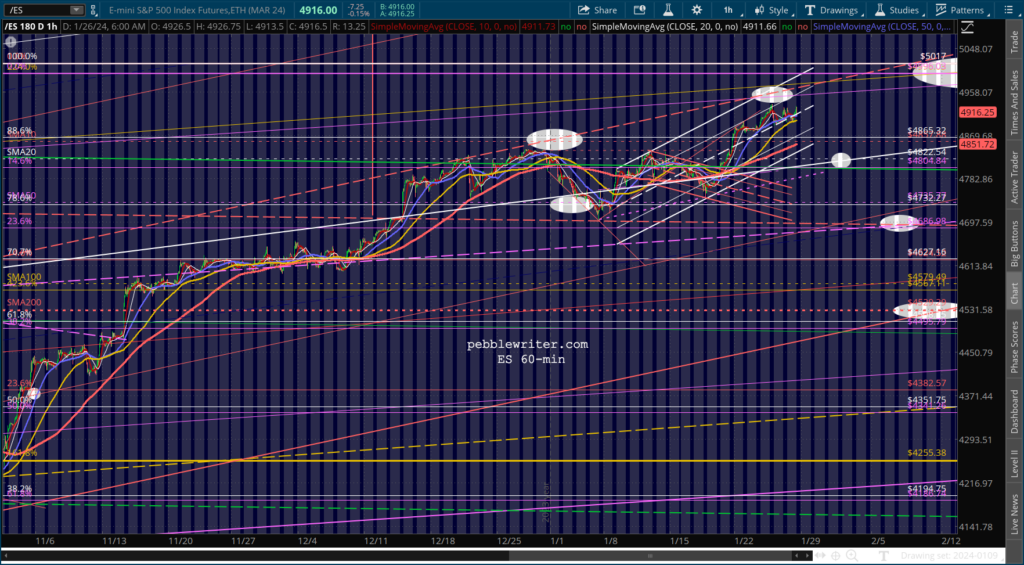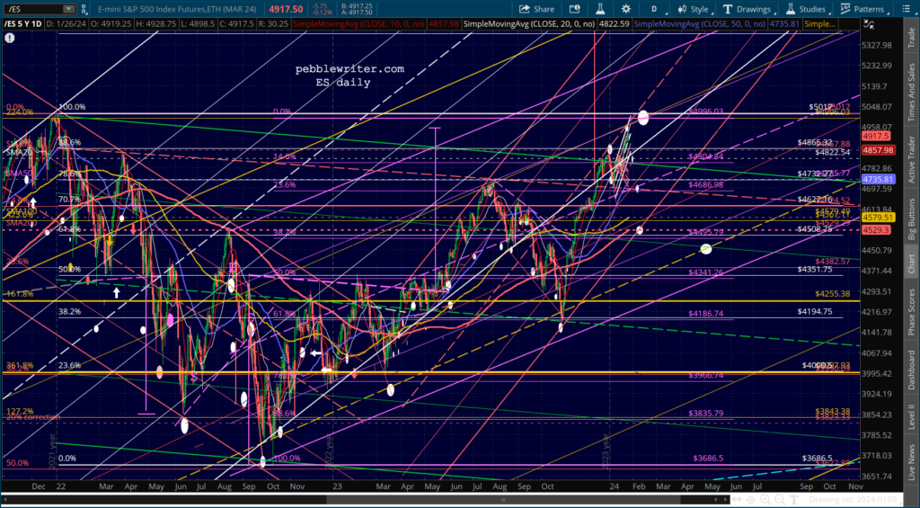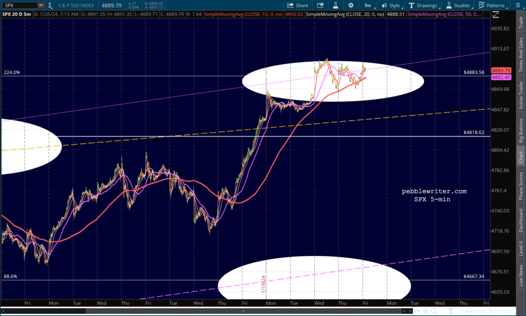 SPX continues to dance around its 2.24 Fib, leaving traders confused as to next moves. For a correction to get underway, it needs to break down below 4883. It has done so twice so far, but has rebounded both times.