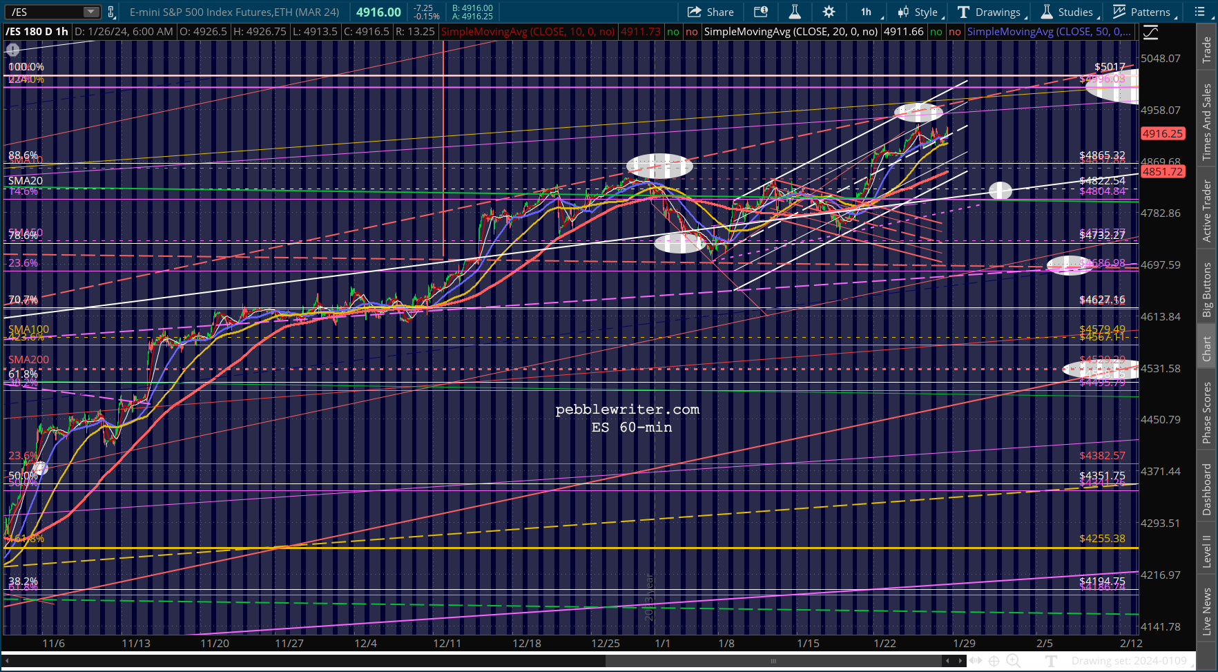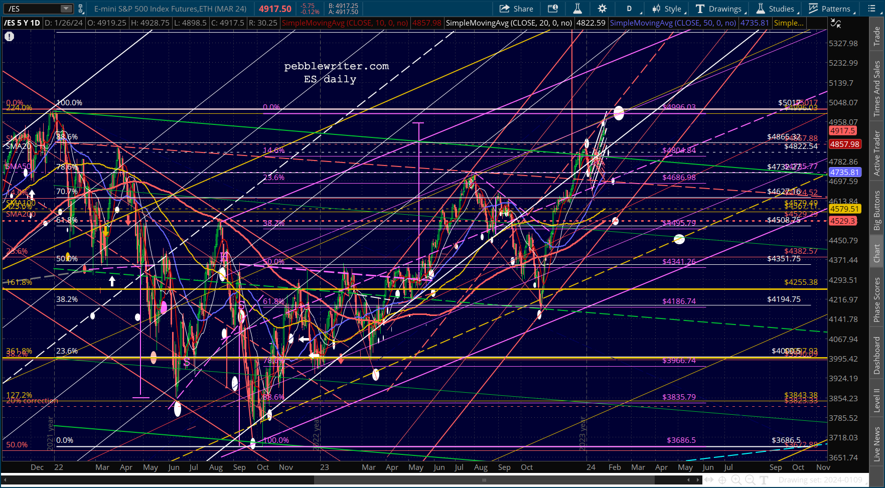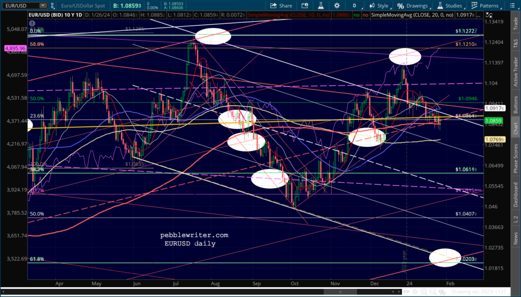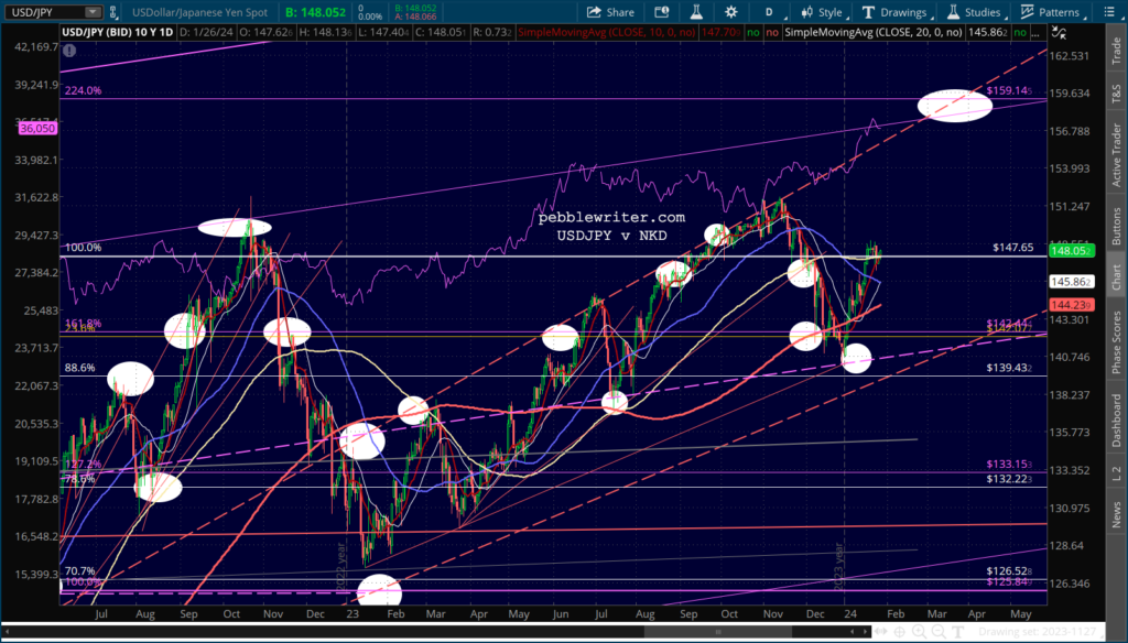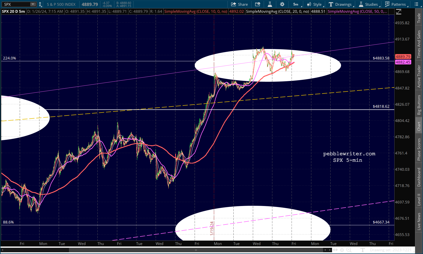 SPX continues to dance around its 2.24 Fib, leaving traders confused as to next moves. For a correction to get underway, it needs to break down below 4883. It has done so twice so far, but has rebounded both times.