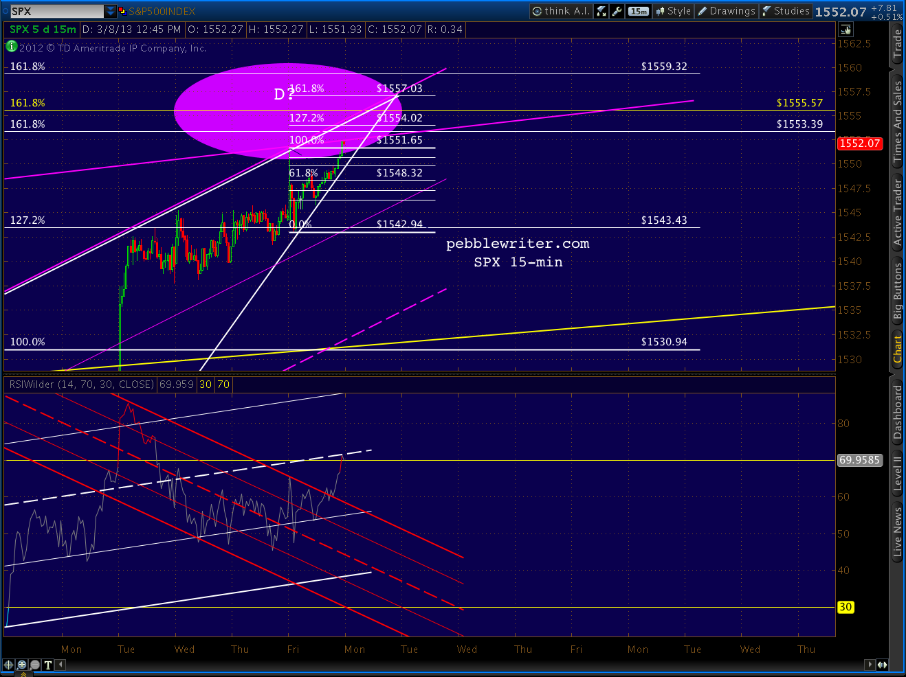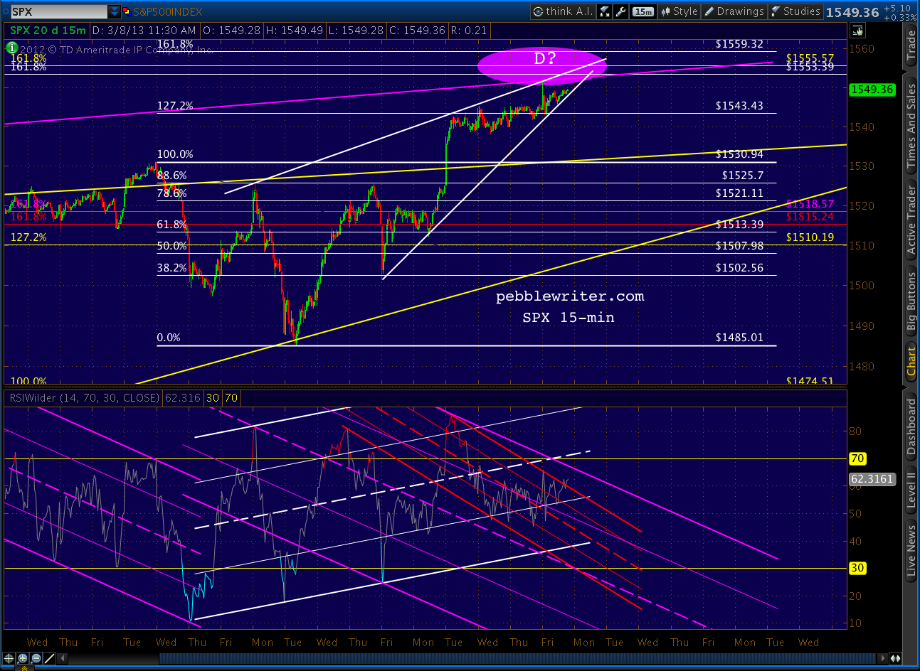 Just tagged the purple TL again with SPX at 1552.44. The 15-min RSI has reached the midline we discussed earlier and looks like it wants to reverse.