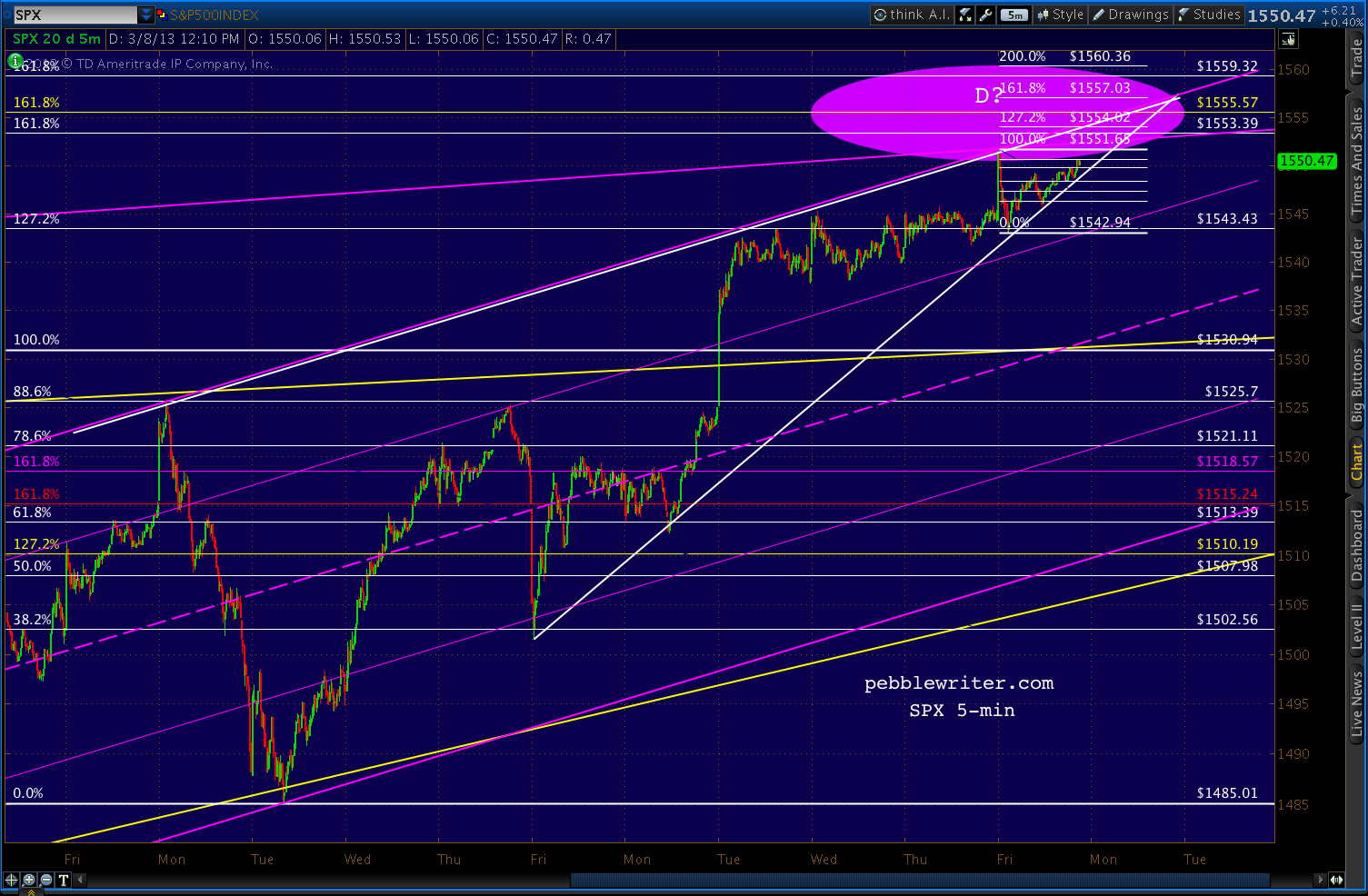 If SPX is going to bounce higher, it should do so by 1543 — the 1.272 Fib on the small white harmonic grid and the bottom of the tiny channel SPX hung out in for the past several days. For anyone who missed the last six points because of the gap open, this is your second chance.