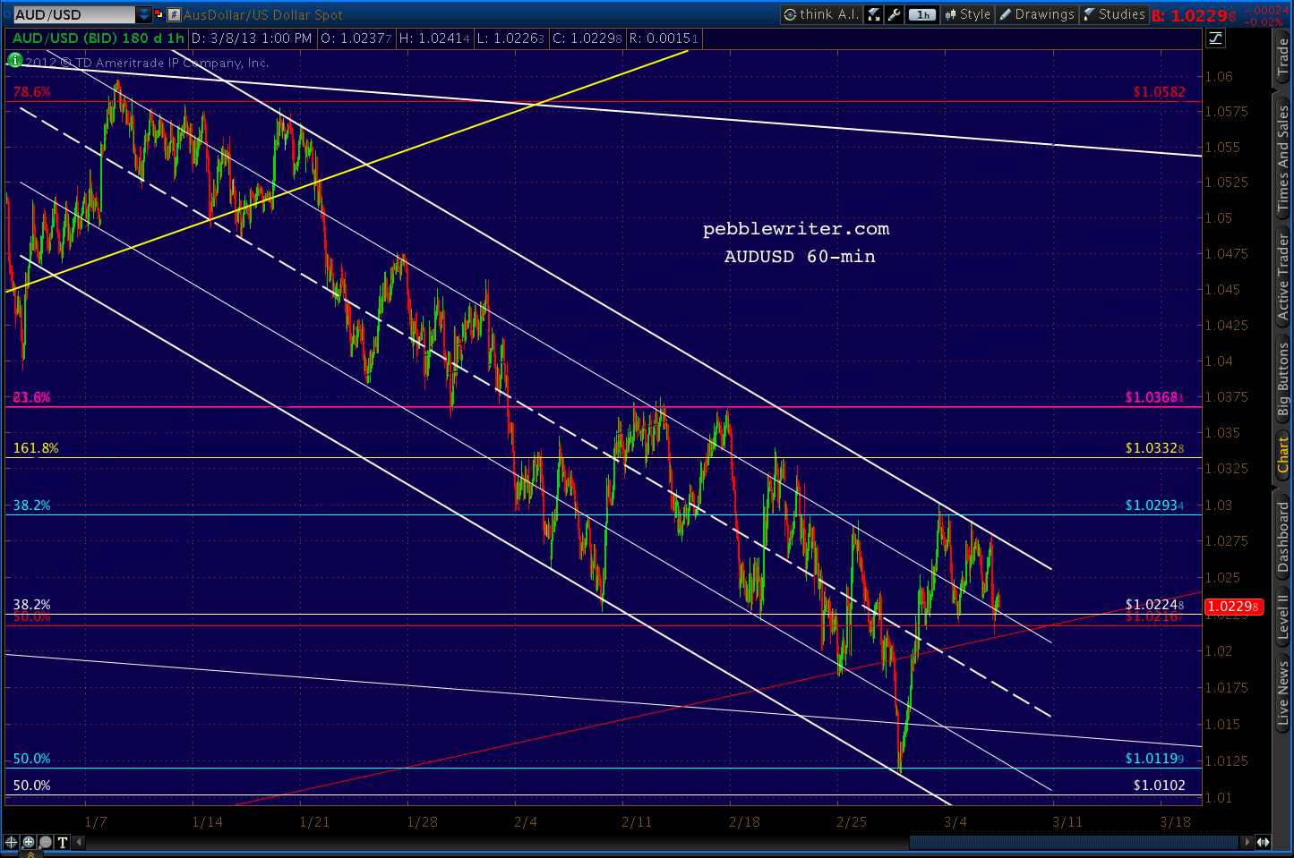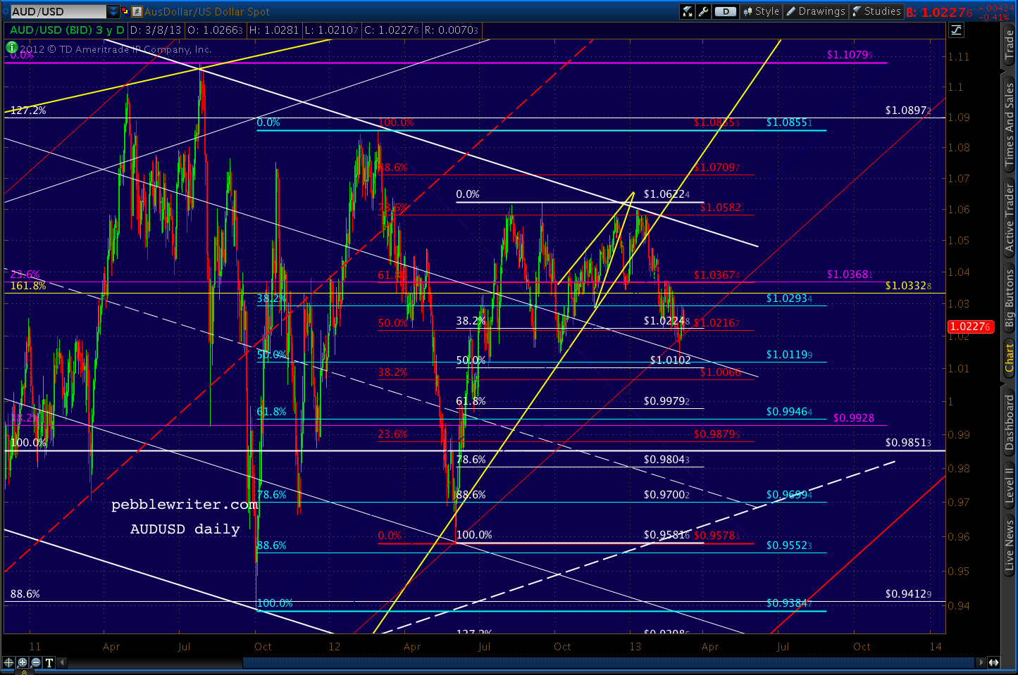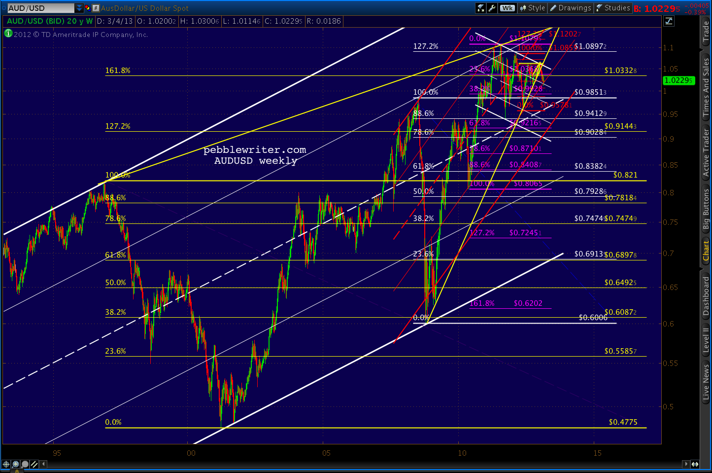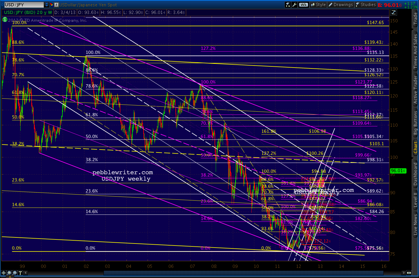The USDJPY has spurted up past the .886 Fibs I thought would provide more resistance than it did. While we could get a reaction here at a double top to the May 2010 high, I think the more important chart feature is the intersection of the white channel top and yellow channel midline at around the large scale .382 at 98.31.
