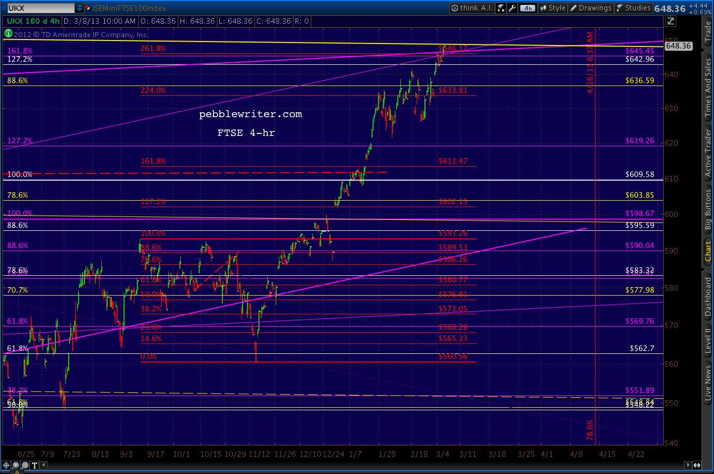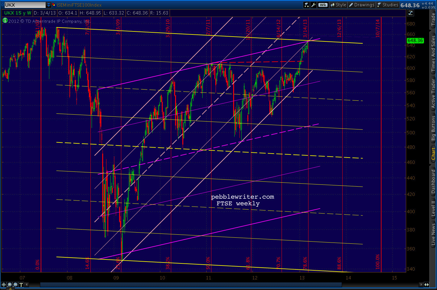 The FTSE (UKX) has tagged the top of two channels and another internal channel line at the completion of several harmonic patterns.