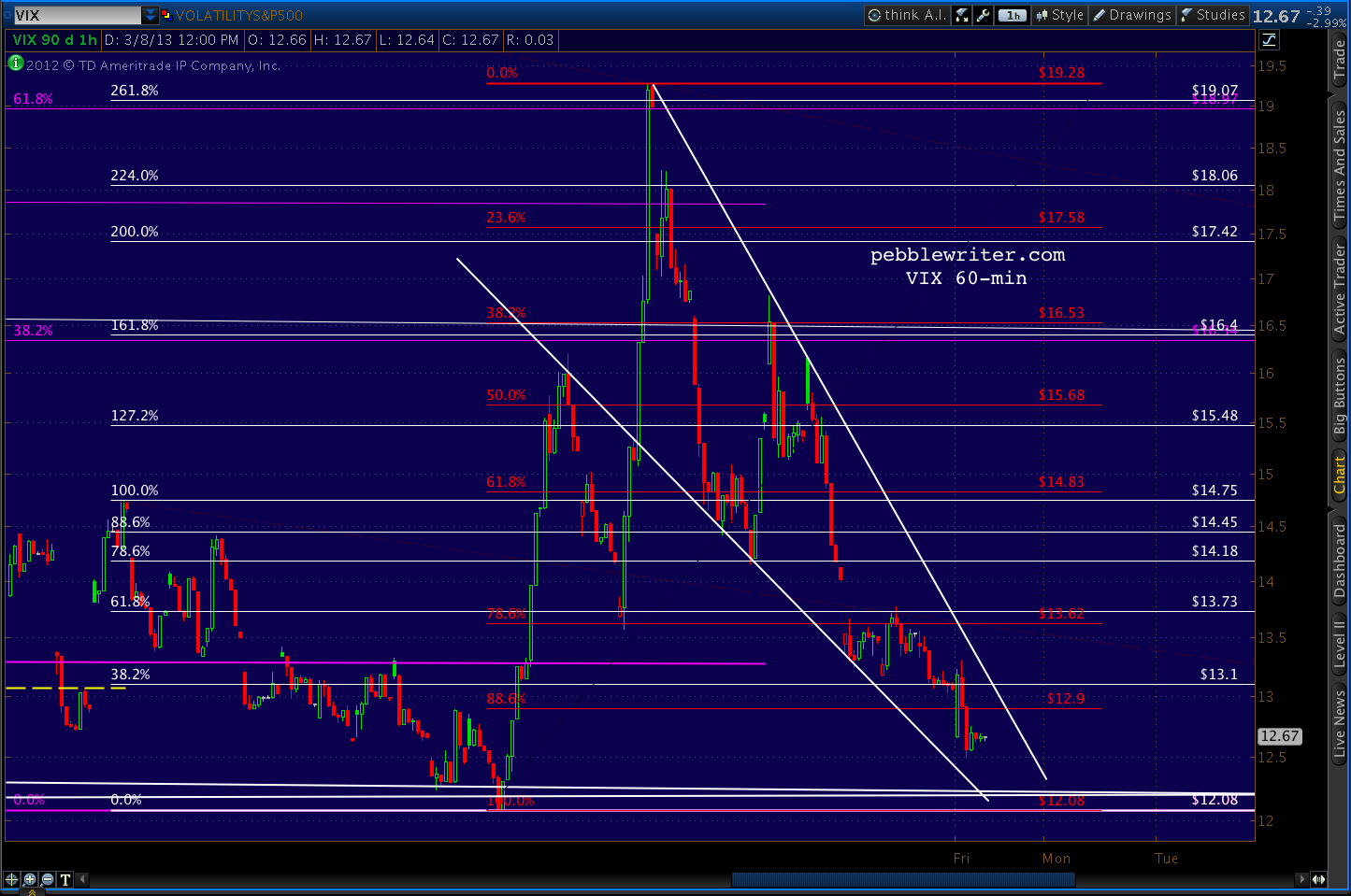 My reservation was that it reversed at the .707 Fib level rather than the more common .618, .786 or .886. The .707 is the red-headed stepchild of the Fibonacci ratios. It’s the square root of .500, which itself doesn’t get much respect as a Fib ratio. Geeks and wannabe’s CLICK HERE for details…