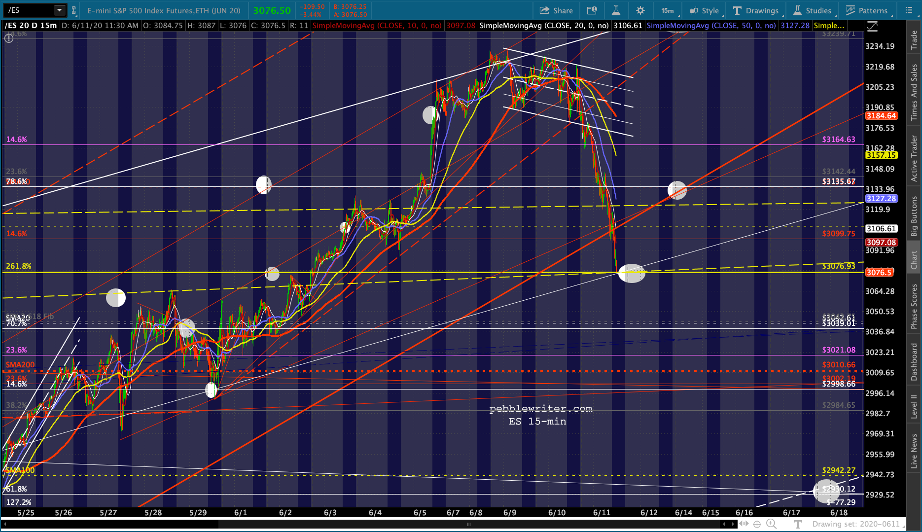 At the end of the day, the most important criteria is whether or not ES’ red channel breaks down. Its bottom is at 3100ish, so a bounce at 3076 back up to 3100, for instance, would leave it in limbo.