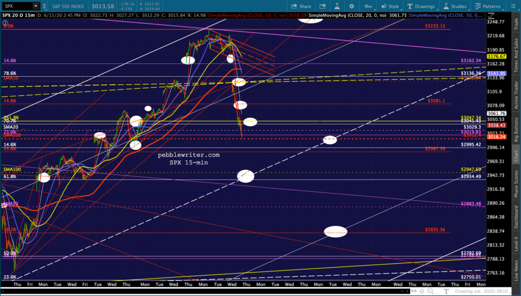 But, the more I look at it, the more I like SPX’s white channel midline at 2934-2950 where it intersects with the SMA100 and white .618. Referencing the daily SPX chart above, this would also be the .786 line of the new falling purple channel. Tomorrow would work just fine.