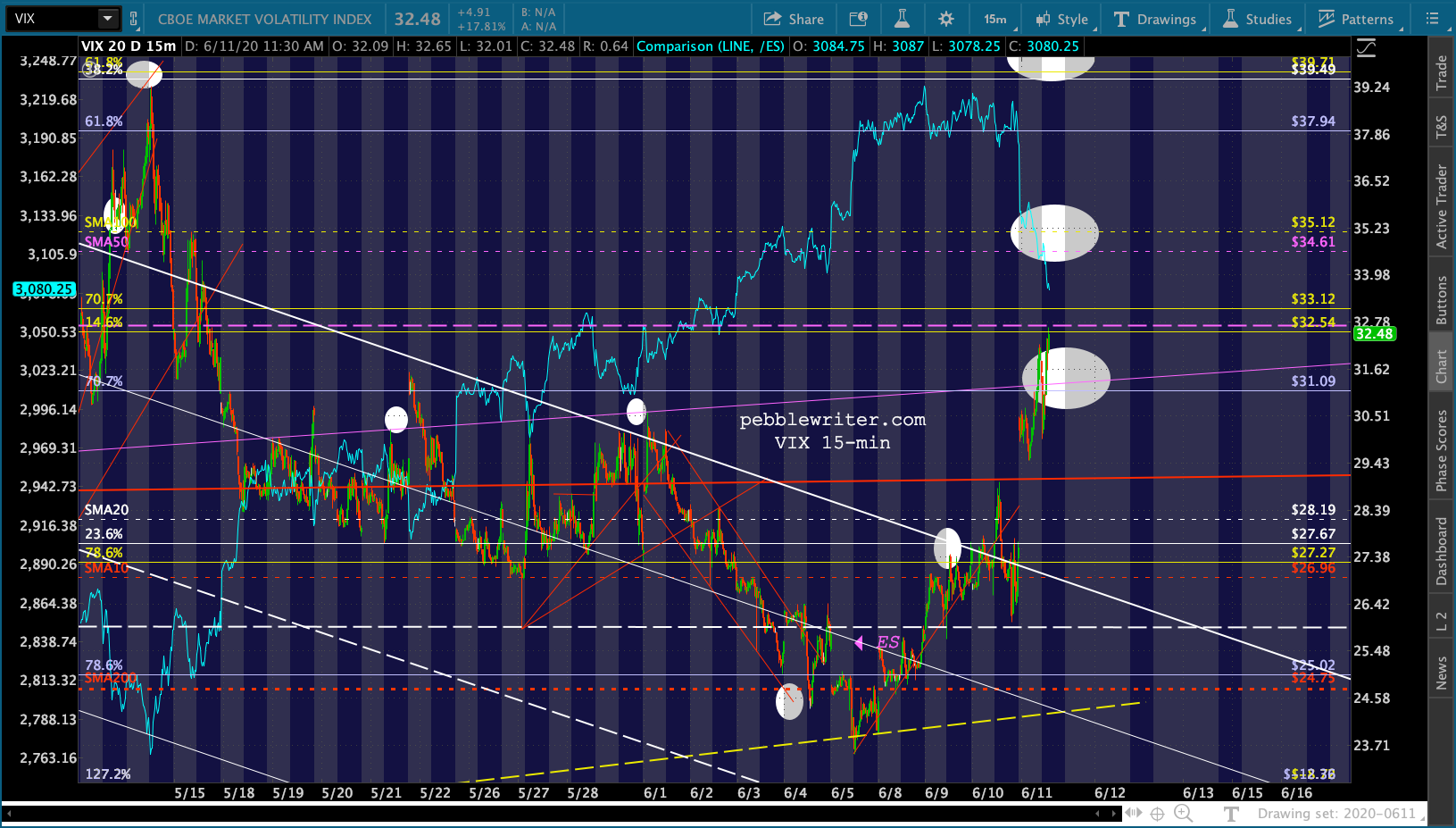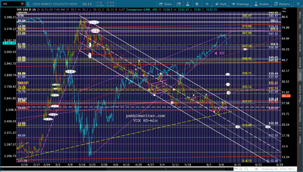 If we look carefully, we can see VIX has potential overhead resistance at 32.70ish – the purple channel midline and rising purple TL.