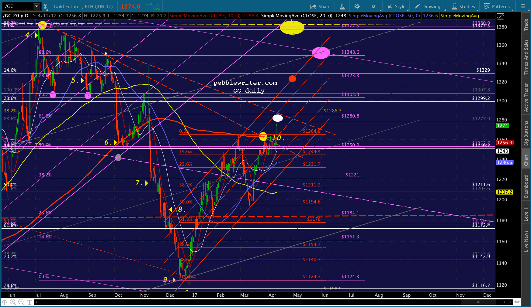 The purple .618 at 1280.80 was one of several upside targets suggested if GC were able to pop through the SMA200. It did so once on Apr 7, but quickly retreated below the red TL from last July. This breakout appears to have more staying power.