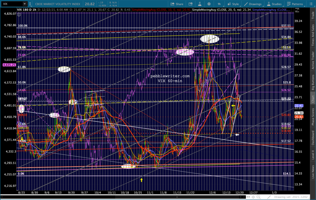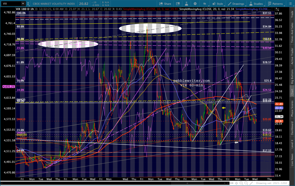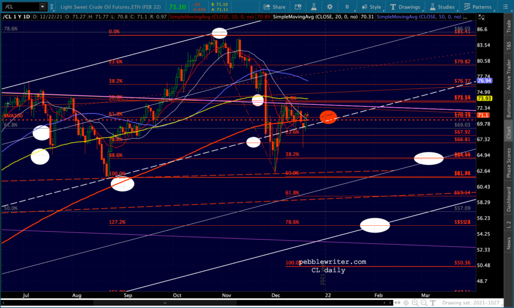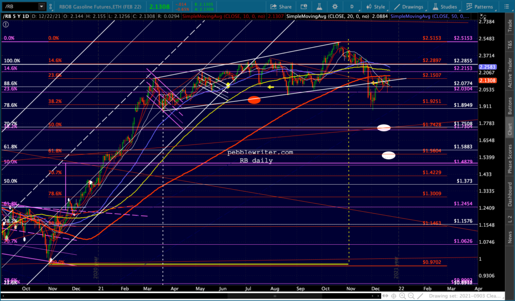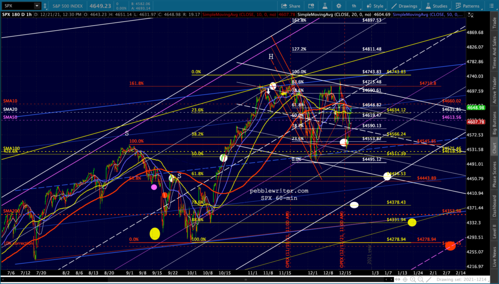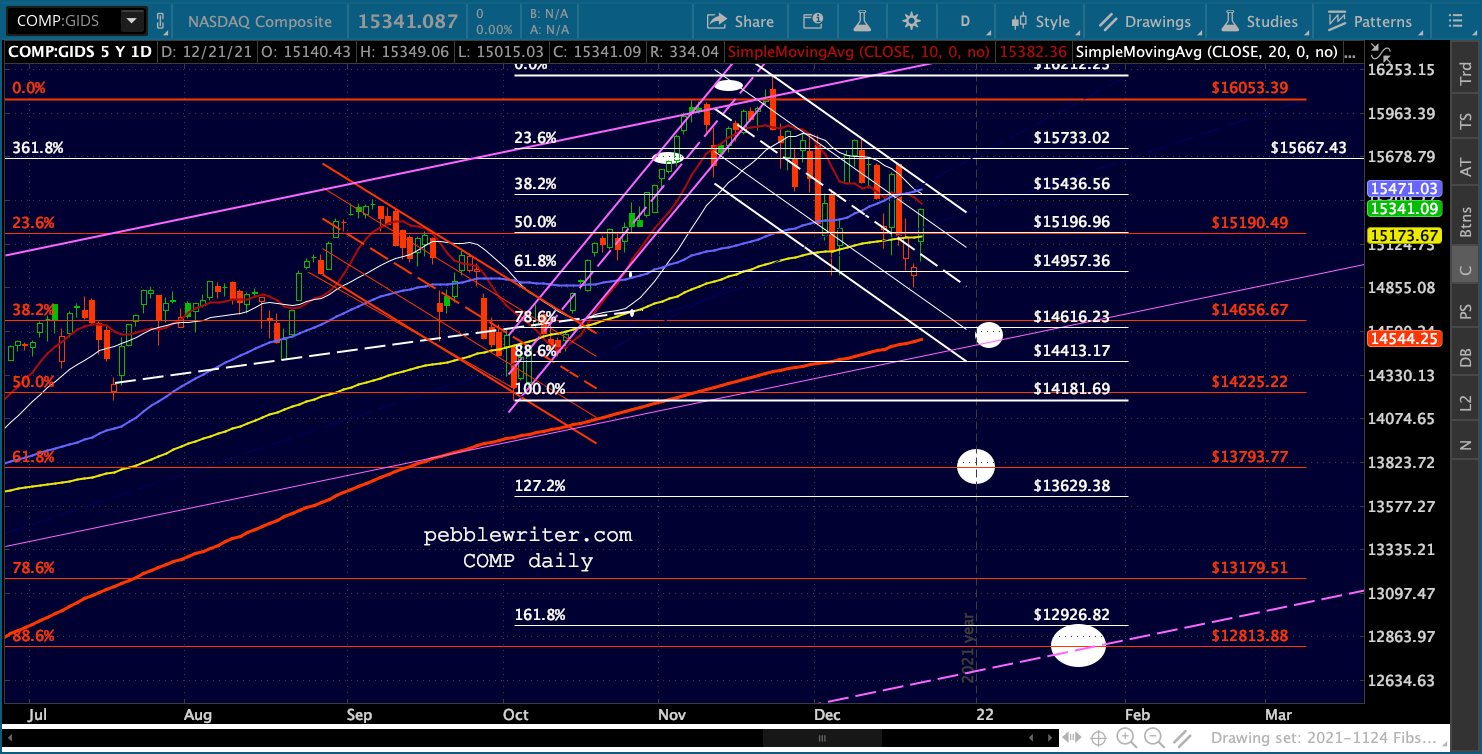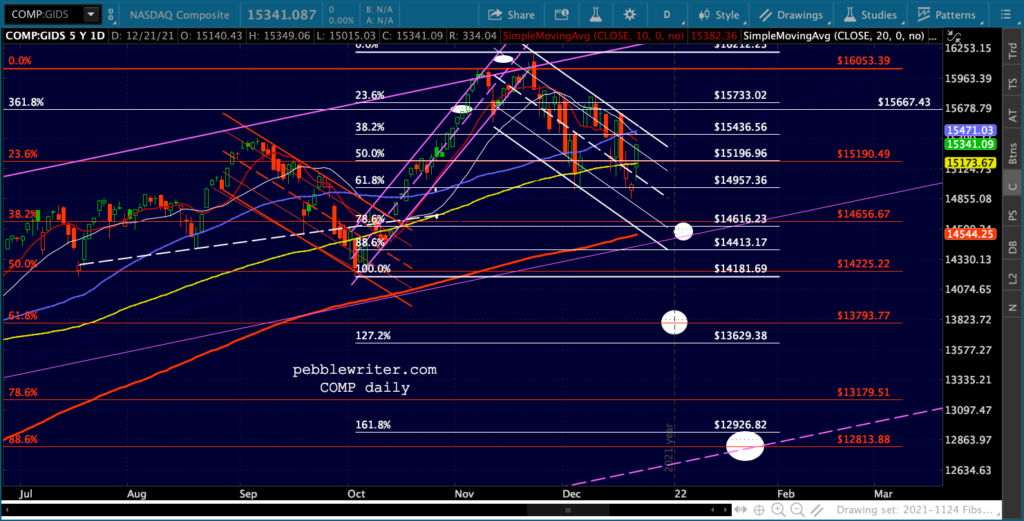 SPX’s rising white channel would allow a .786 and SMA200 backtest as long as it happened very quickly, as in the next session or two. Otherwise, the channel bottom would have to be breached or the downturn would have to be more limited – say, the .618 in mid-January.