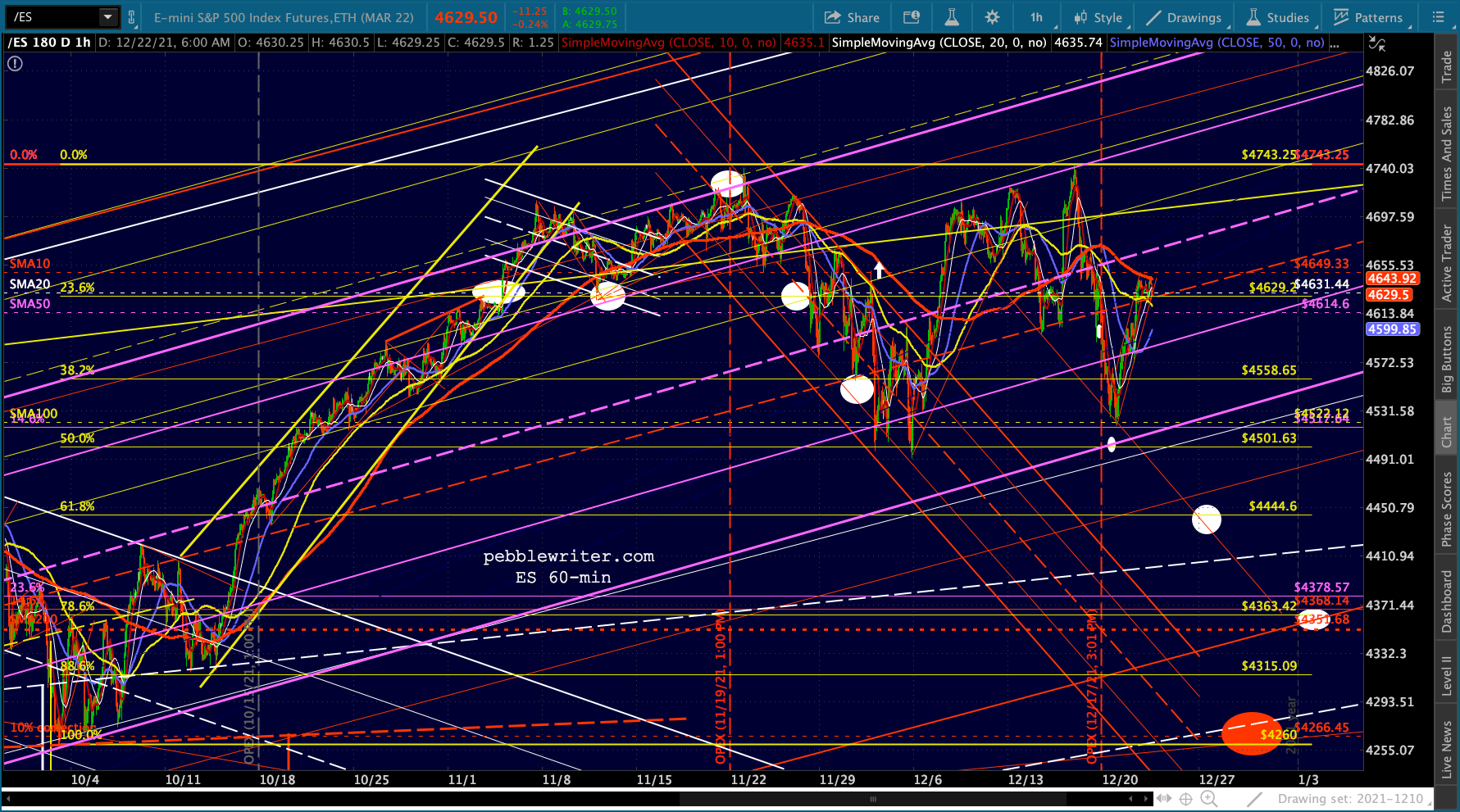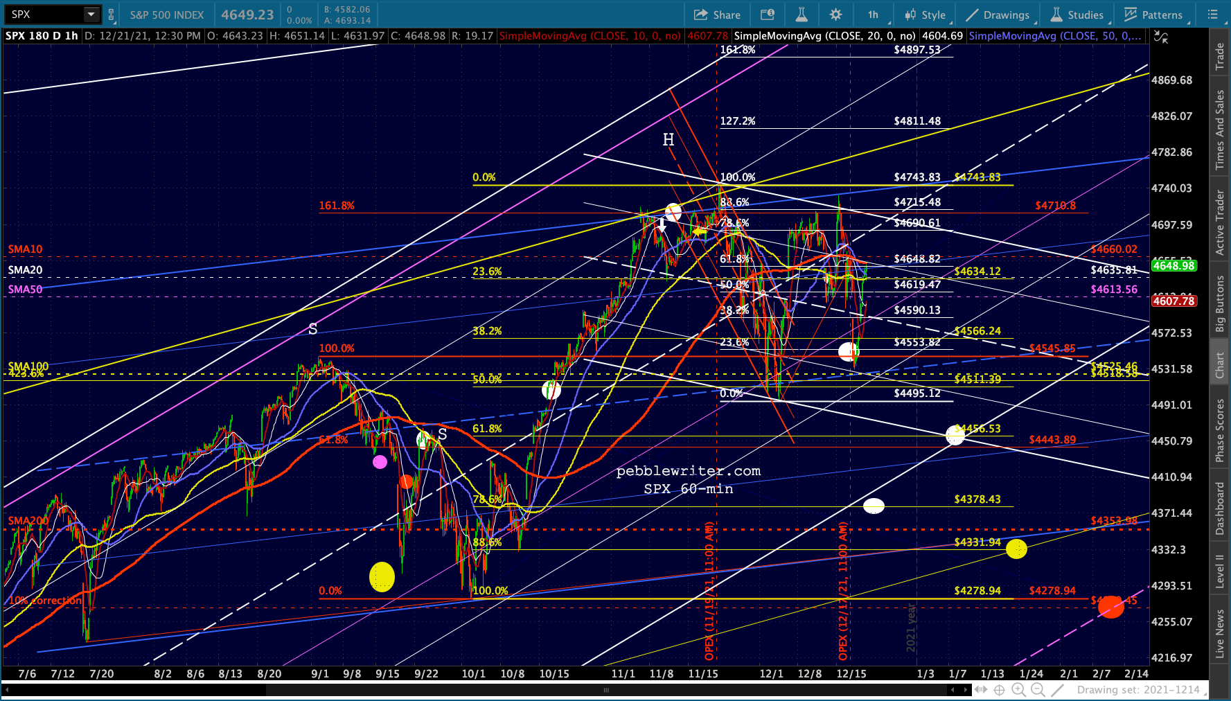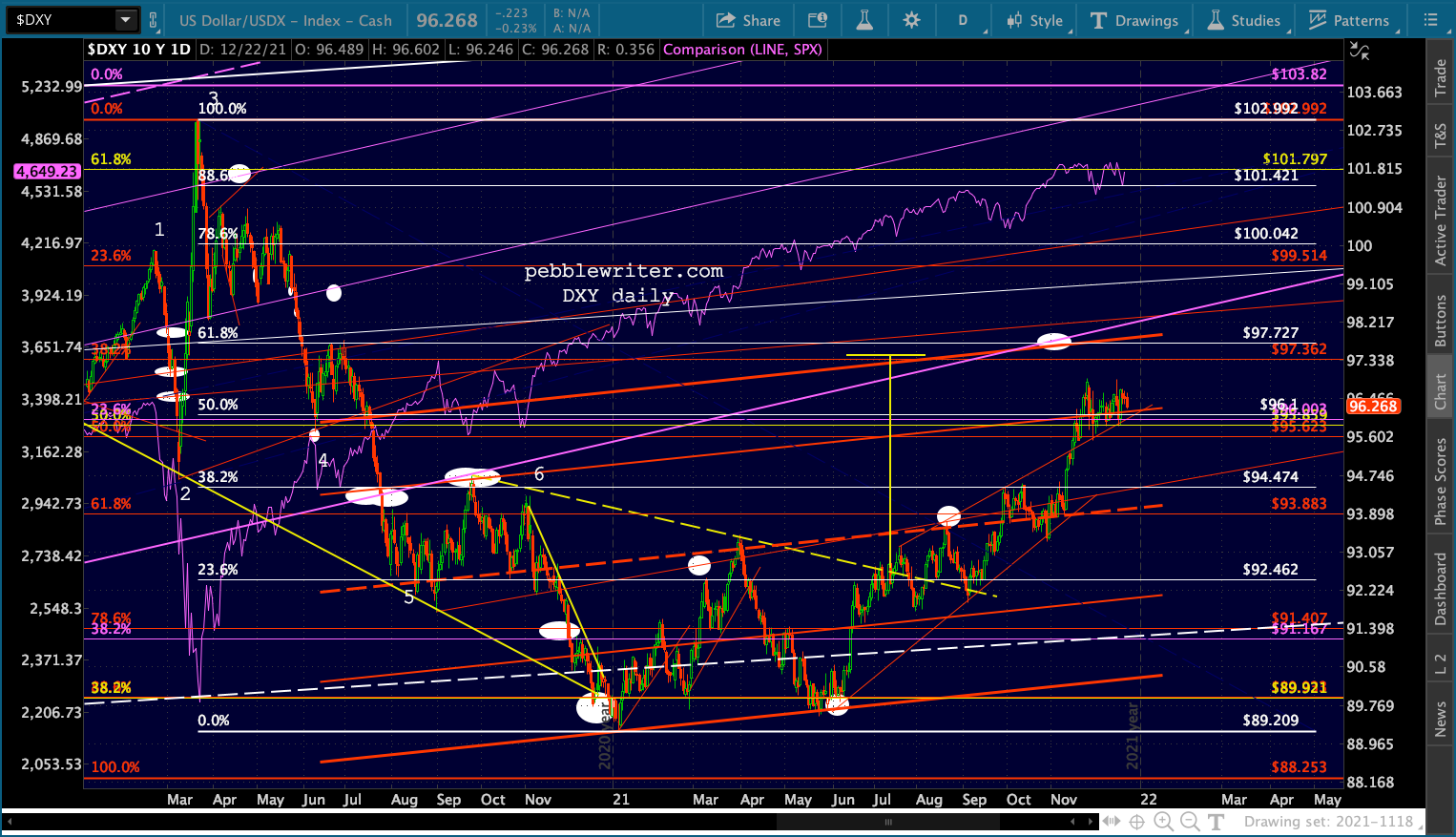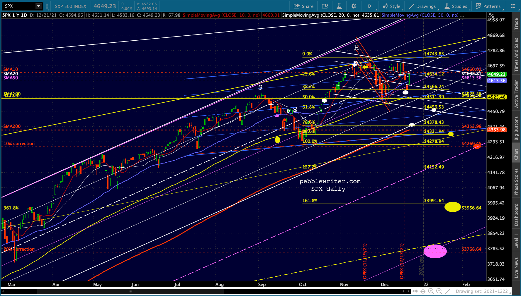 SPX’s rising white channel would allow a .786 and SMA200 backtest as long as it happened very quickly, as in the next session or two. Otherwise, the channel bottom would have to be breached or the downturn would have to be more limited – say, the .618 in mid-January.