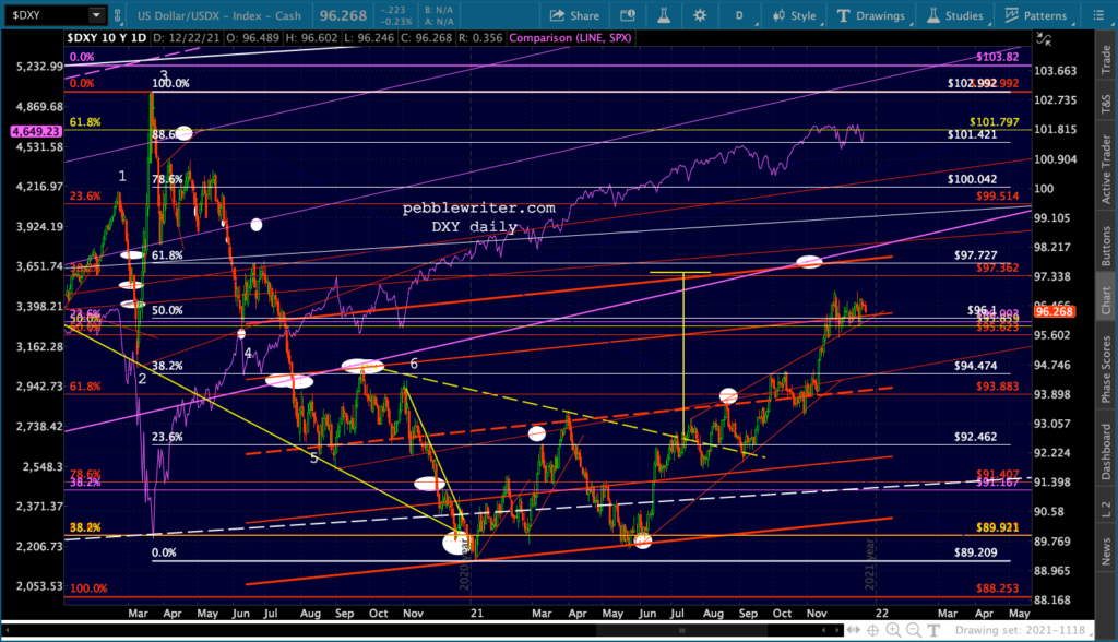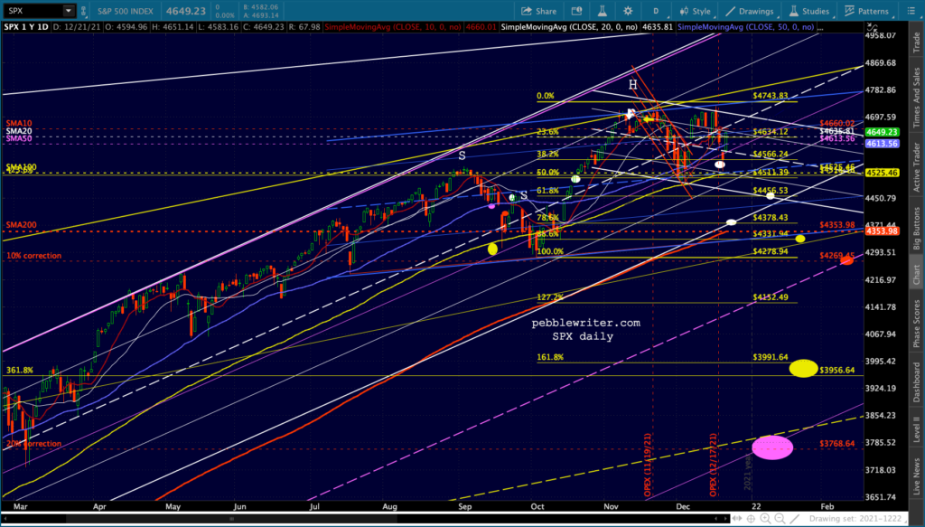 The equity picture: Charts argue for lower prices, but the question is “when?” As everyone knows, we usually get a “Santa Clause rally” the last week of the year. But, there have been notable exceptions such as 2018 when SPX finished off a 20% correction on Dec 26.