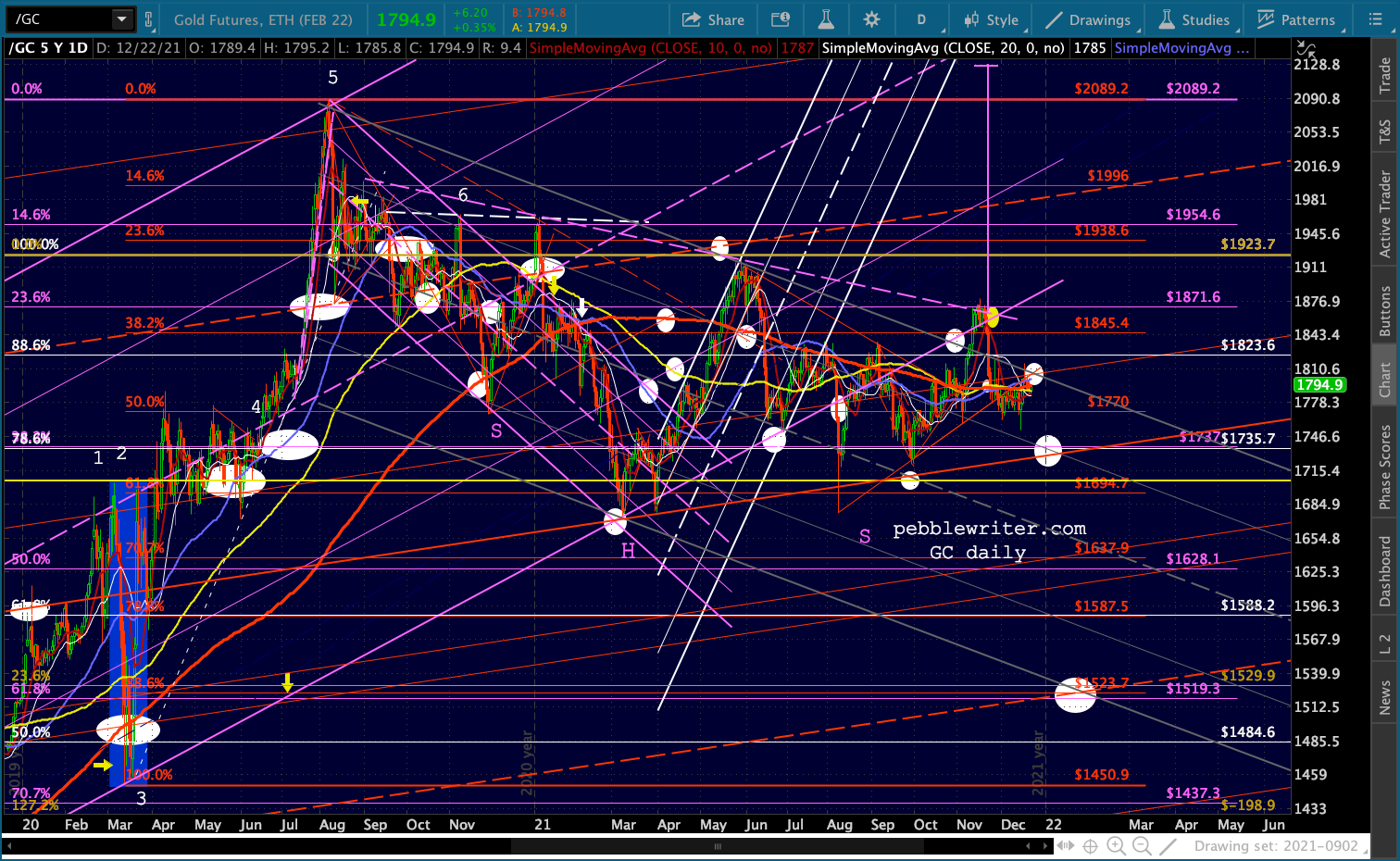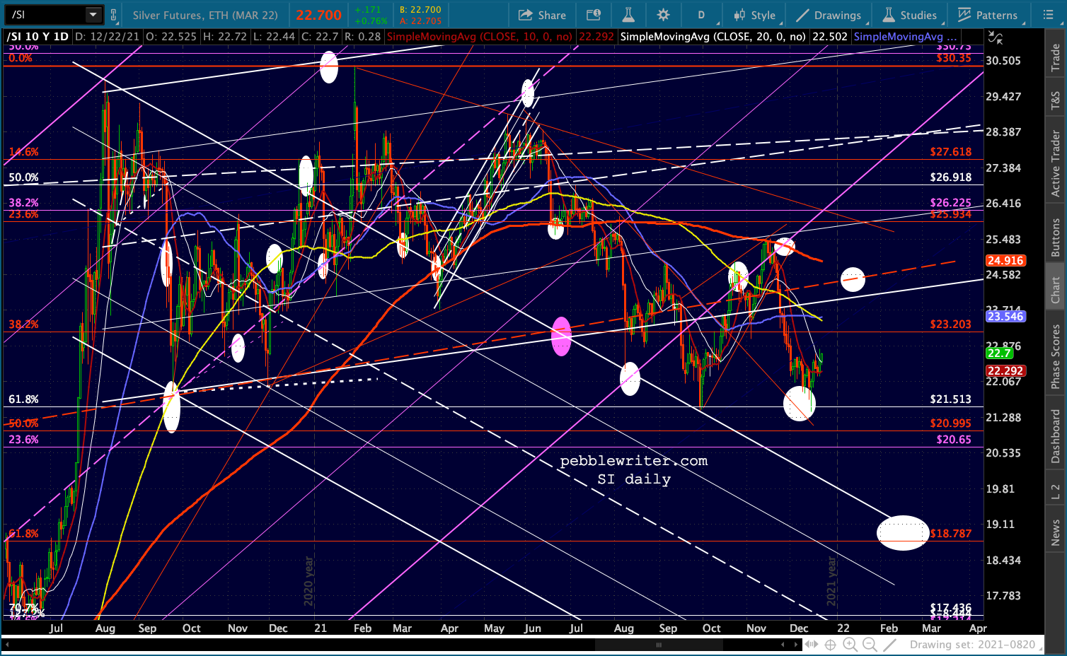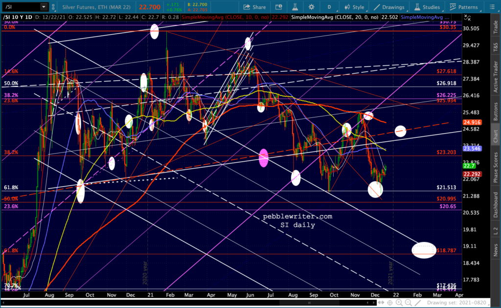 As long as the overall market is being propped up, SI and GC probably won’t decline much. SI, in particular, could easily bounce up to test its SMA200 all over again as it reaches the red fan line at around 24.45. I’ve added a target reflecting that possibility.
