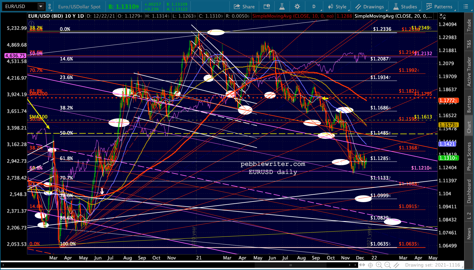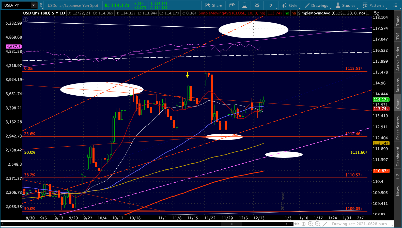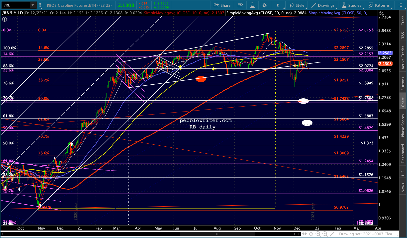 As long as the overall market is being propped up, SI and GC probably won’t decline much. SI, in particular, could easily bounce up to test its SMA200 all over again as it reaches the red fan line at around 24.45. I’ve added a target reflecting that possibility.
