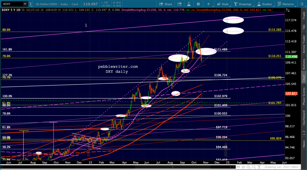 If the dollar strengthens from here, it will reinforce the idea of the 10Y yield bouncing off its purple TL from August (also, the purple channel midline.)