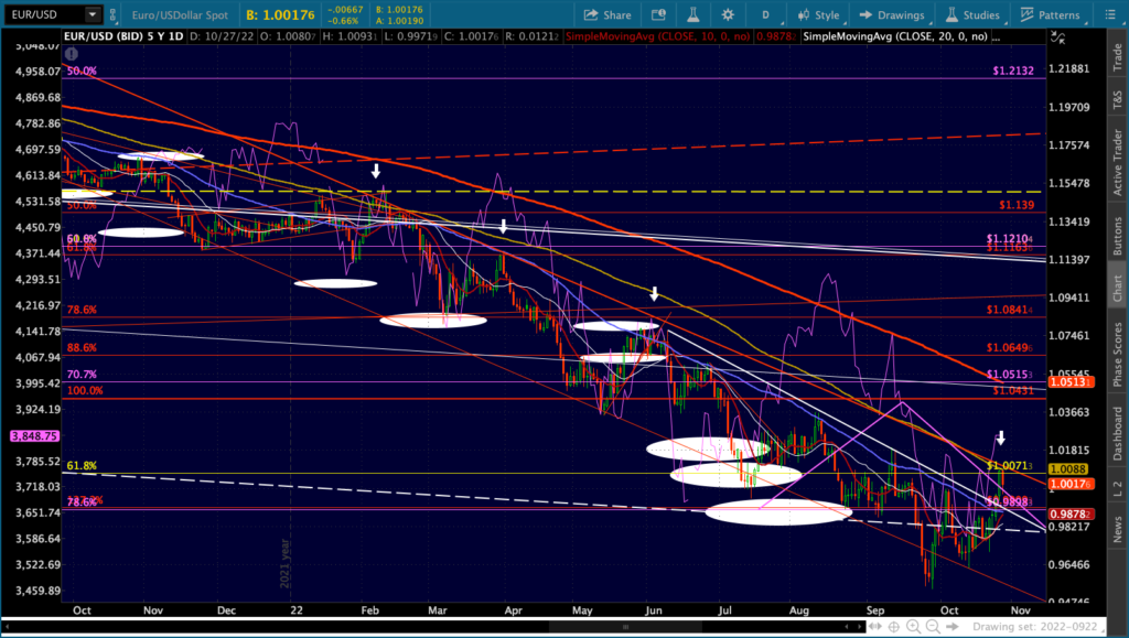 I want to point out an important phenomenon for EURUSD. Note that every single time EURUSD retreated from the red TL (the white arrows) SPX tumbled. It worked with the lower, white TL as well. This illustrates the importance but risk of the euro carry trade – all the more crucial as USDJPY was headed to the moon.