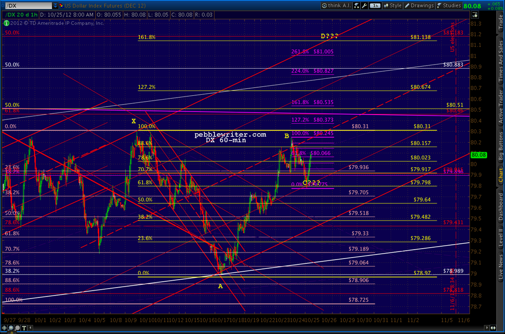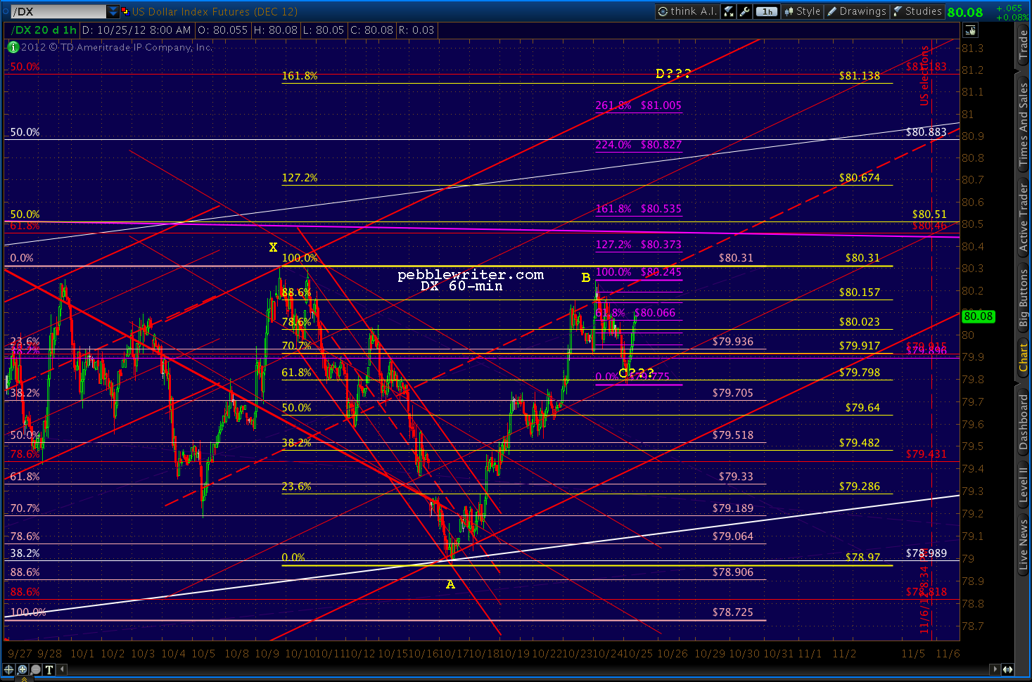 Yes. Seems like the dirty work (that would otherwise damage equities) is getting done after hours lately. So perhaps a 80.535 (small purple 1.618) or 80.674 (yellow 1.272) intra-day/overnight, followed by a reversal to accommodate an equities rise, followed by the 81.138 (yellow 1.618) after Nov 6?