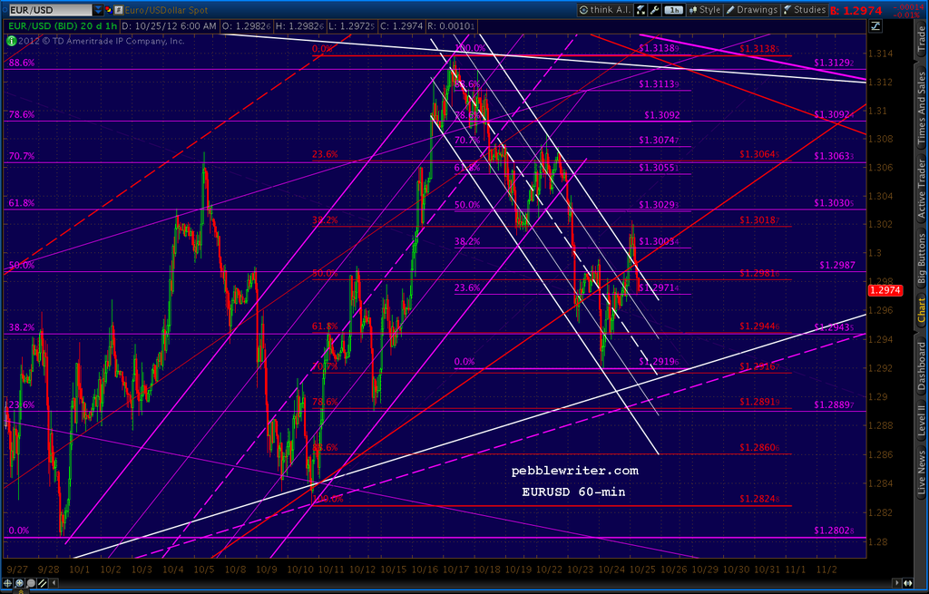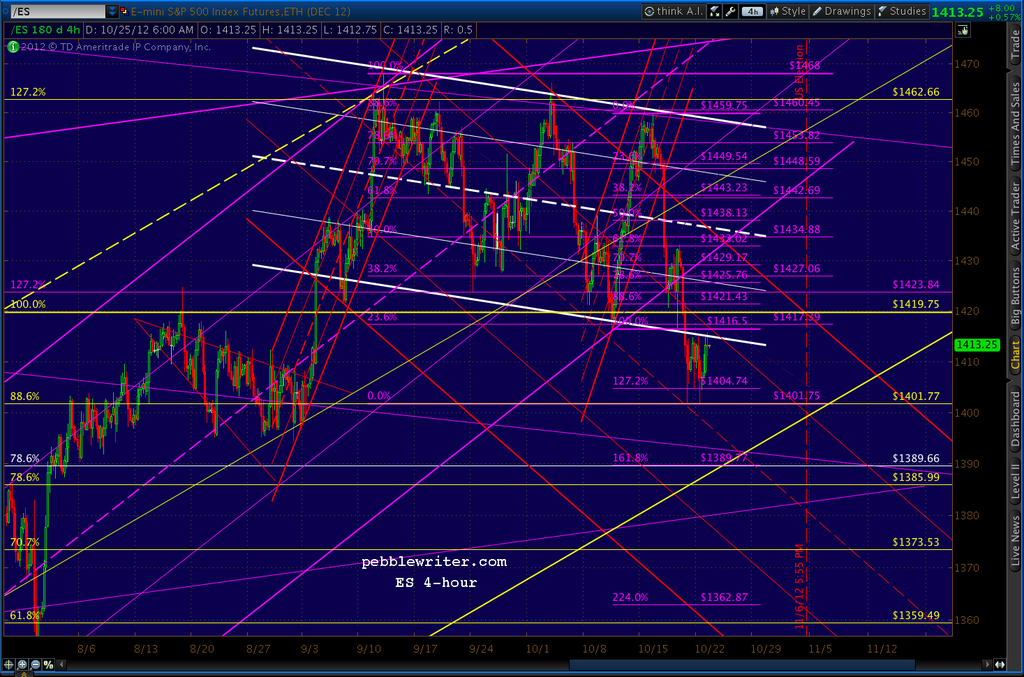 The eminis, despite a great bounce off the .886 of the April – June correction, appears to have stalled at the bottom of the white channel. And it did so without having reached its own harmonic target and without any positive divergence whatsoever.