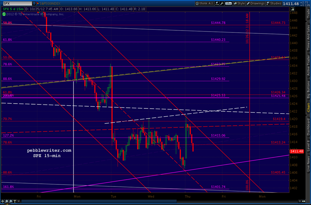 SPX is selling off nicely, but I’m keeping an eye on a possible threat to the downside case. With this morning’s push to 1421.12, the bulls might be trying to engineer an Inverse Head & Shoulders pattern that would target 1435. Set your stops accordingly.