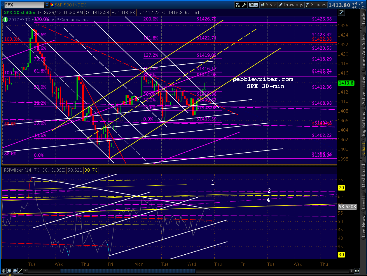 If the channel should break down for some reason, the immediate downside should be limited to the fan line down around 1405. The channel bottom and the red TL intersect around 1410 at 1230 EDT, so look for a breakout or breakdown before then.
