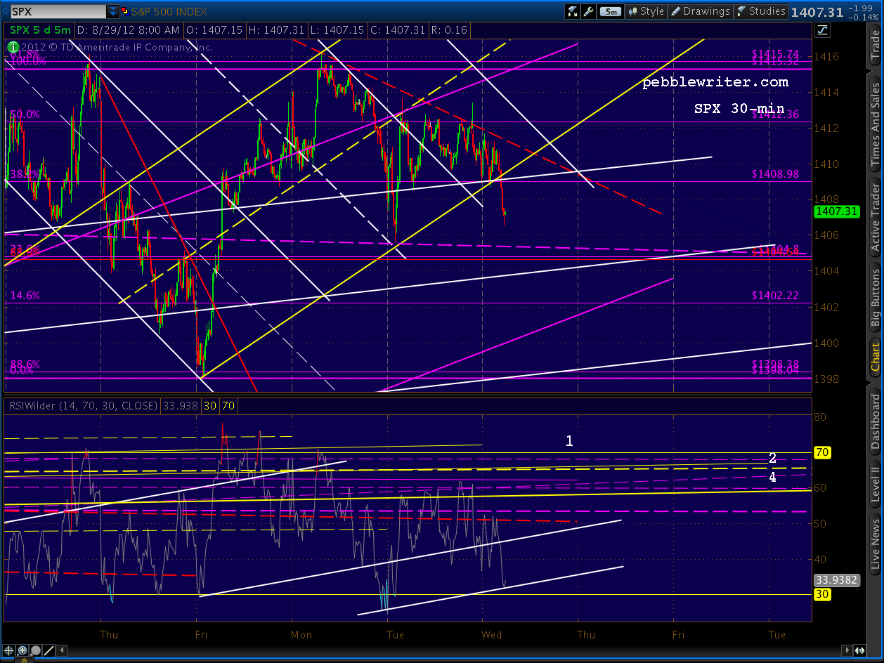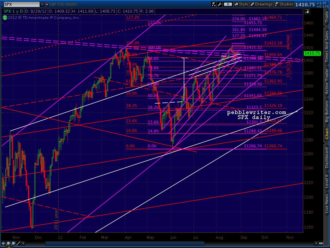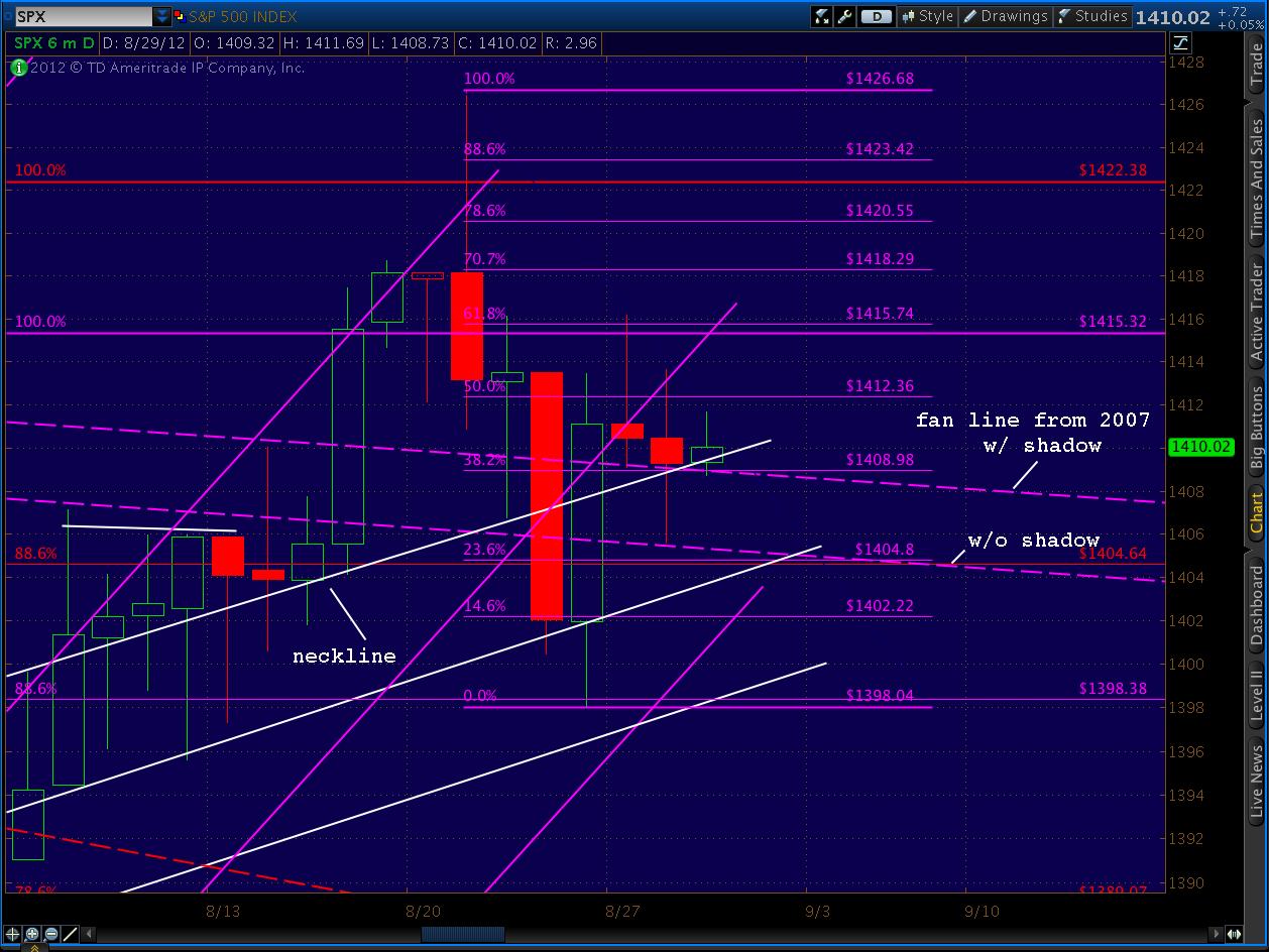 So, unless there’s a great straddle (currently 5.10 ATM on SPY) or volatility trade that makes sense, this is one of those times. I’m still long from 1409, with an objective of 1420-1422 and a stop at the fan line around 1405. I’ll continue to take stabs at the intra-day stuff for those who like to day trade. But, if nothing substantive happens in the next few days, I’ll be market neutral (and sleeping soundly) Thursday night.