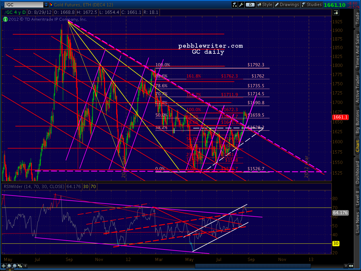 Like equities, gold will react to Bernanke’s statement on Friday. If it’s gold-positive, look for the climb to 1762 to resume. Obviously, there are degrees of positive, but that’s our medium-term goal.