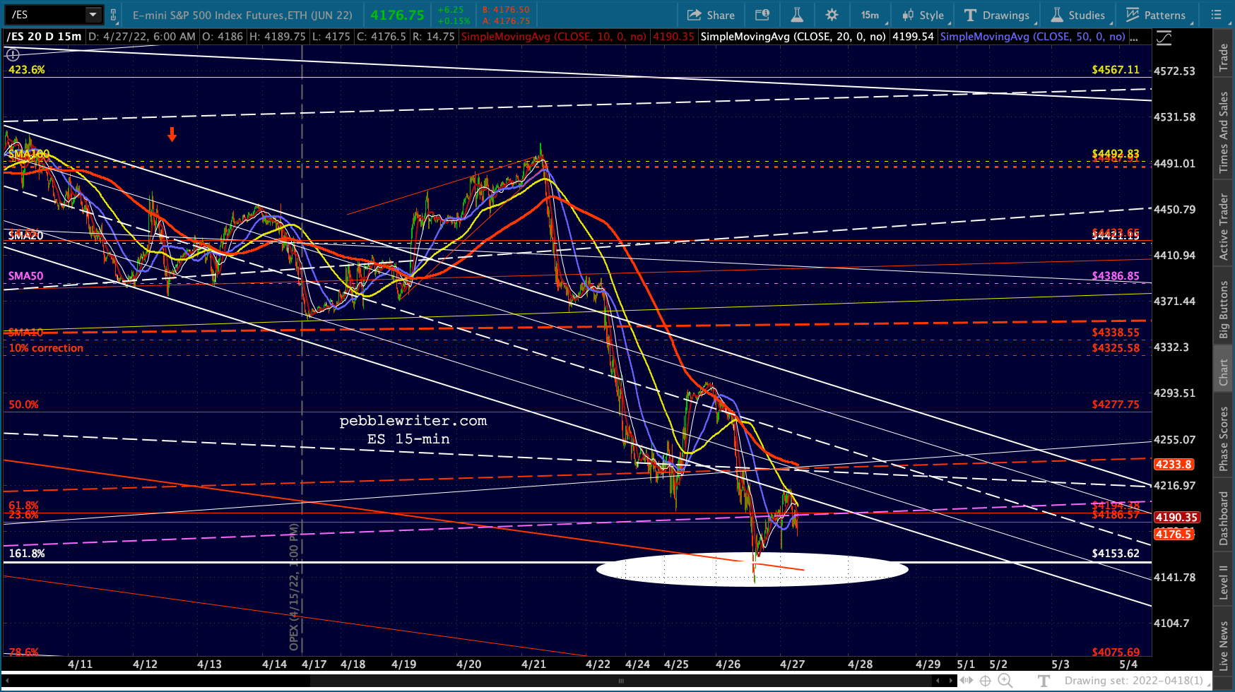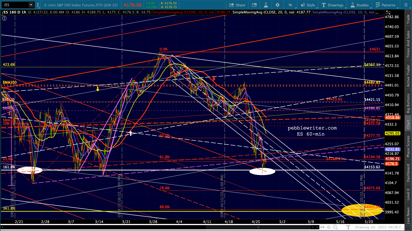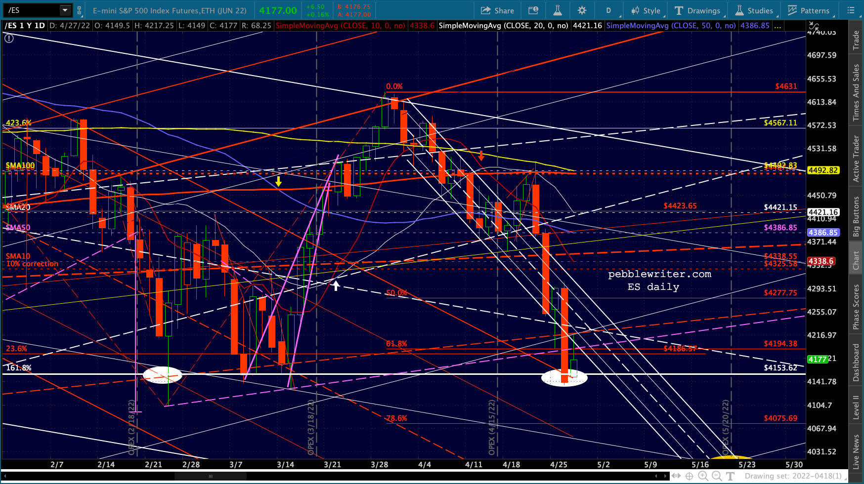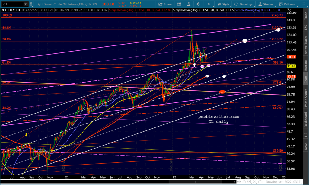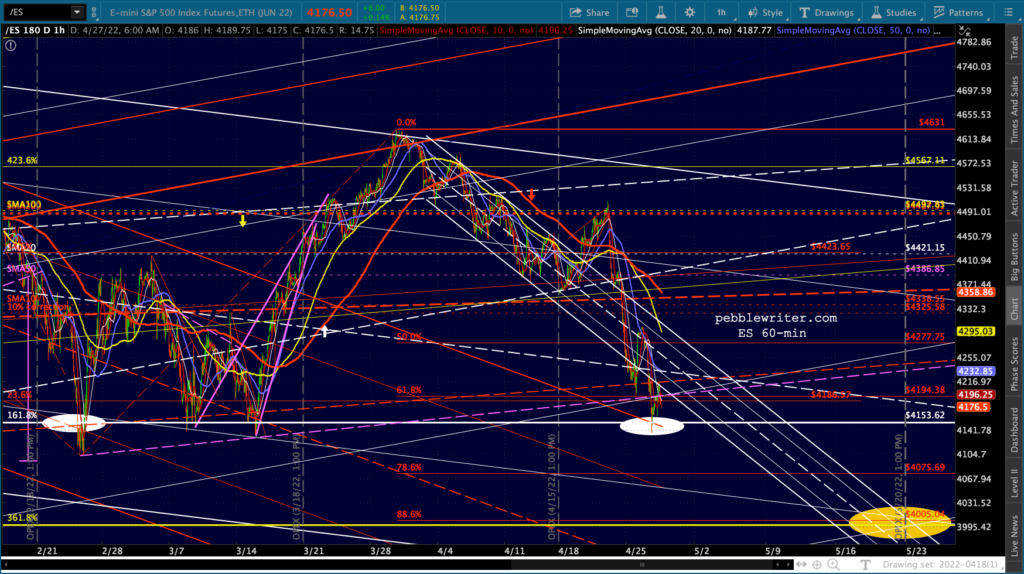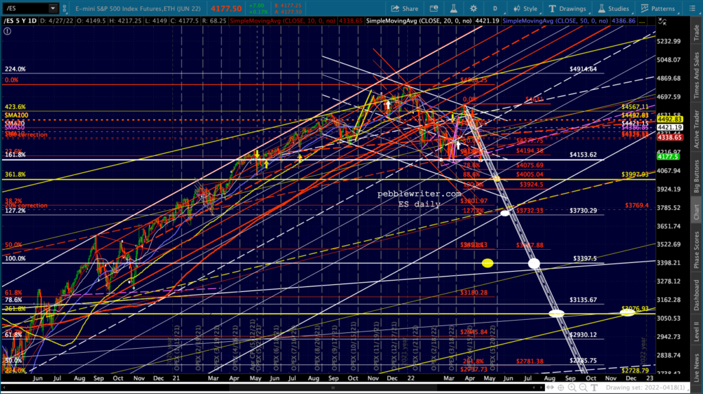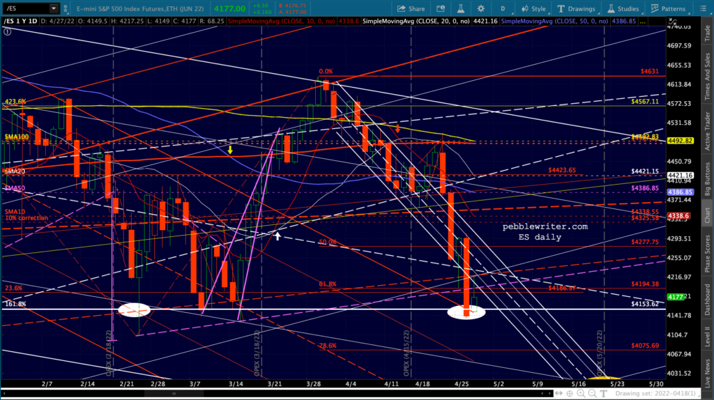 ES’ bounces at the 1.618 are hard to miss. Note that the channel doesn’t reach 4153 until May 2, so it’s entirely possible it’ll bounce around this range for another week.