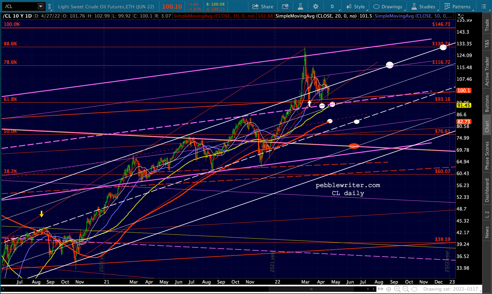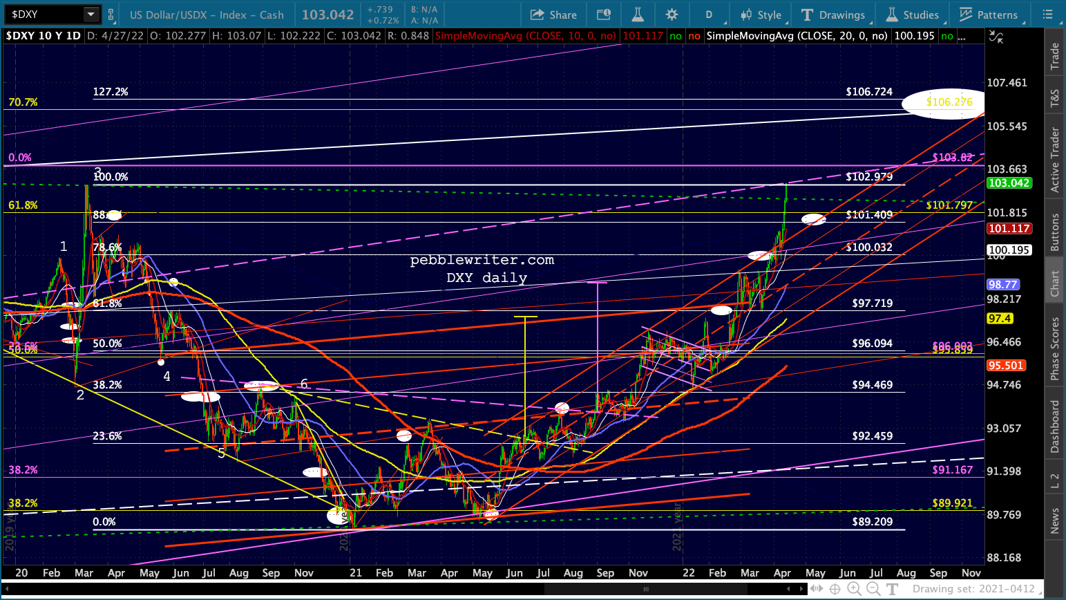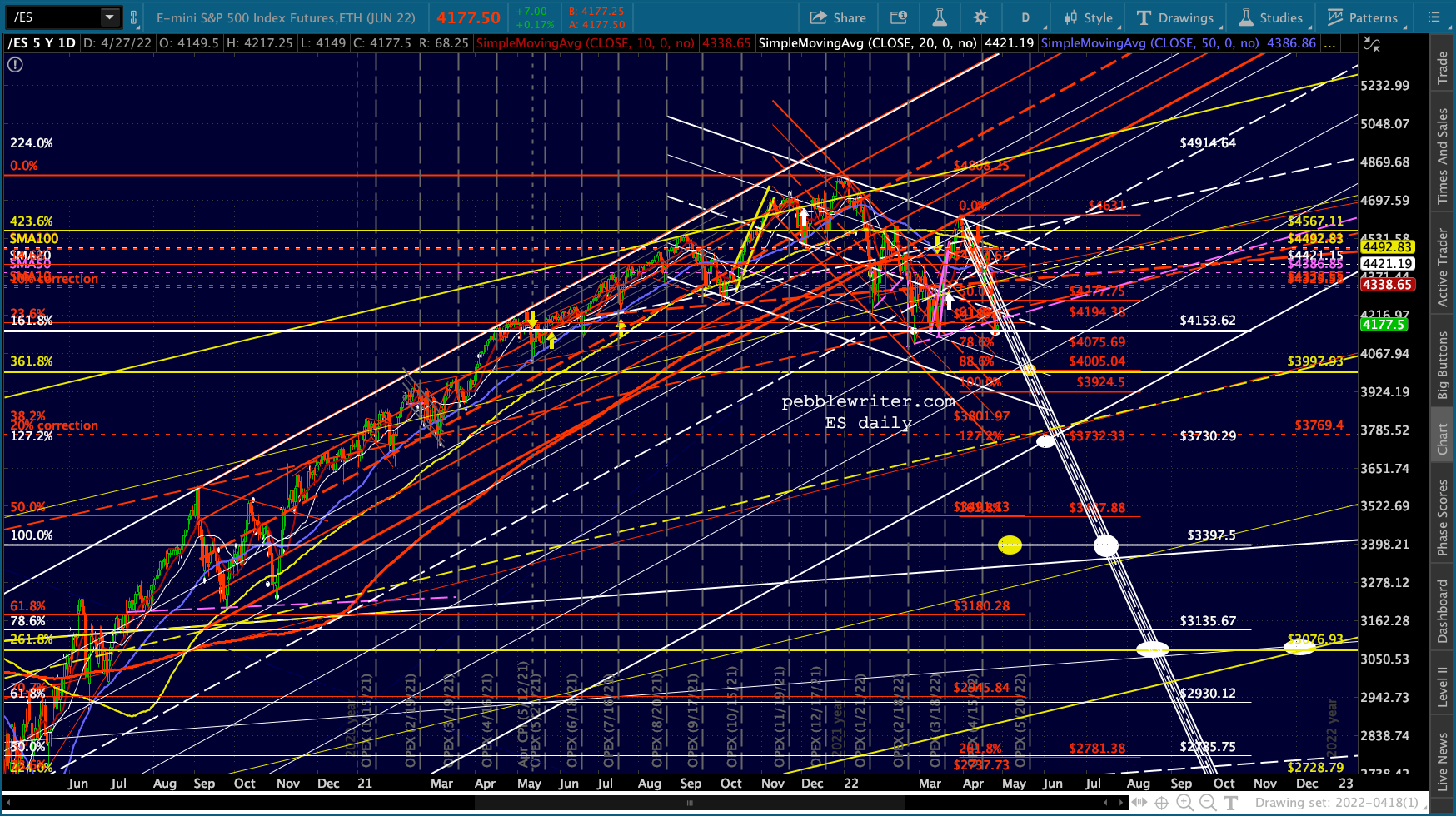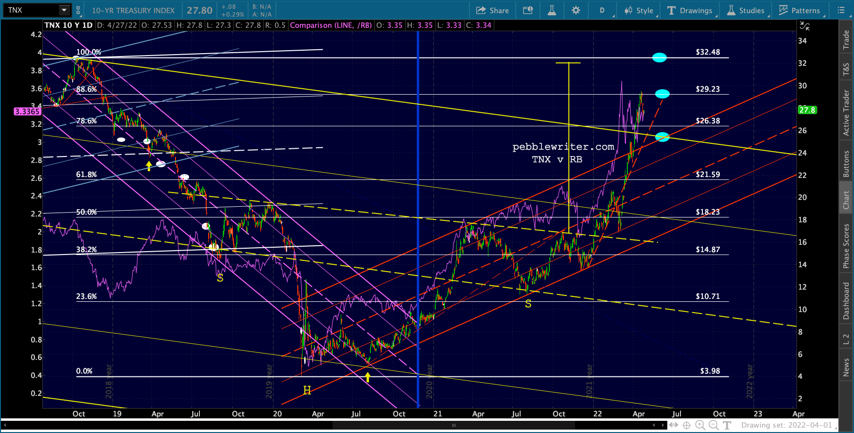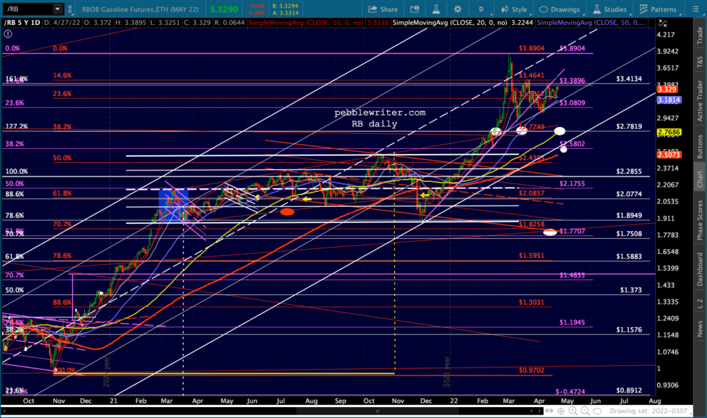 ES’ bounces at the 1.618 are hard to miss. Note that the channel doesn’t reach 4153 until May 2, so it’s entirely possible it’ll bounce around this range for another week.