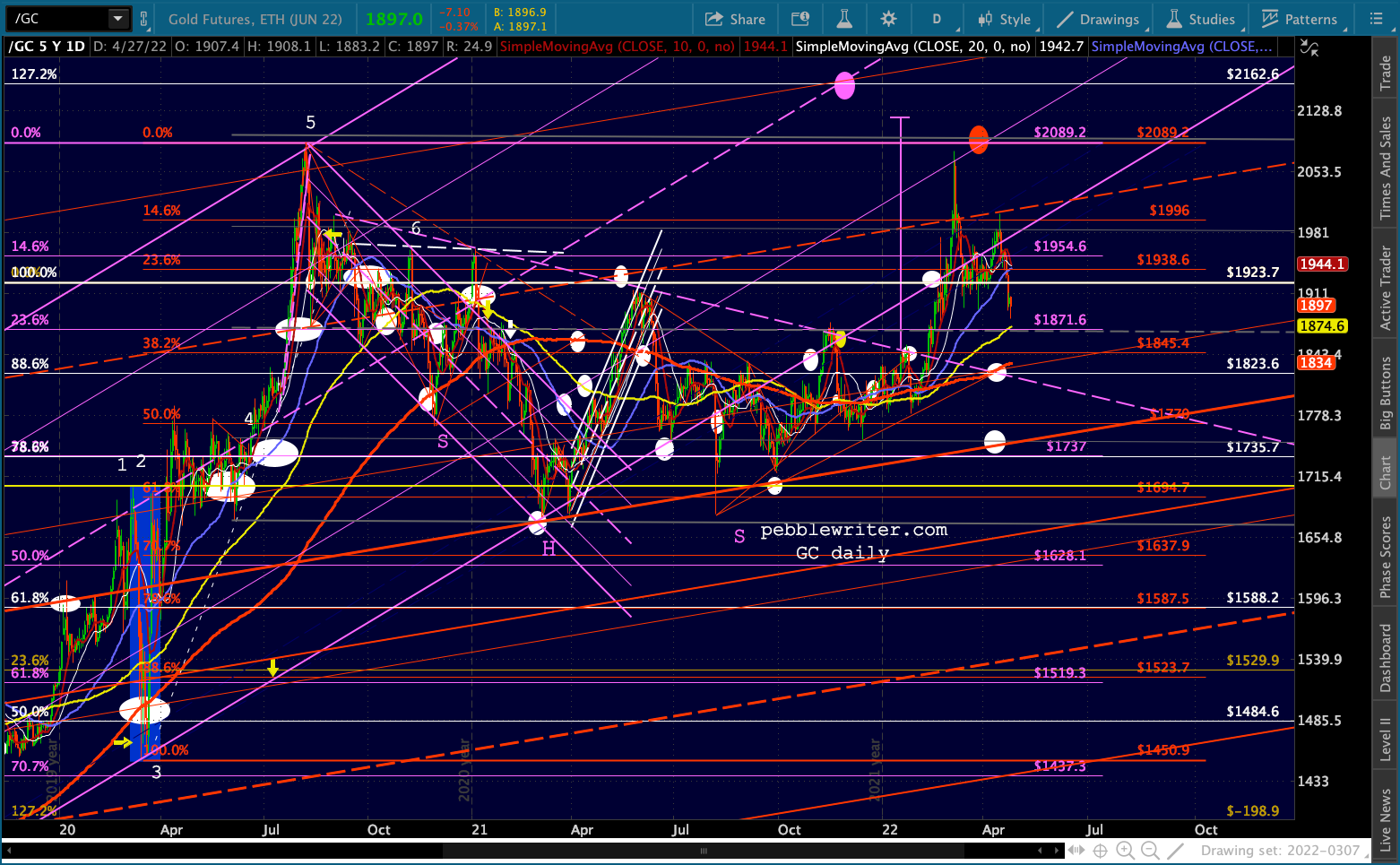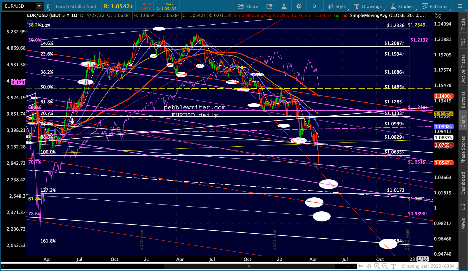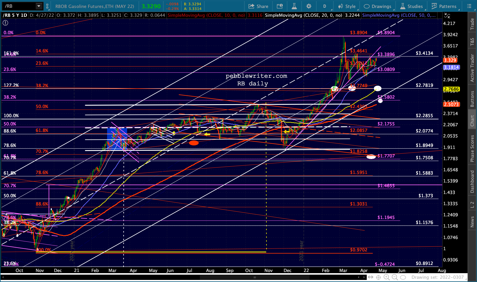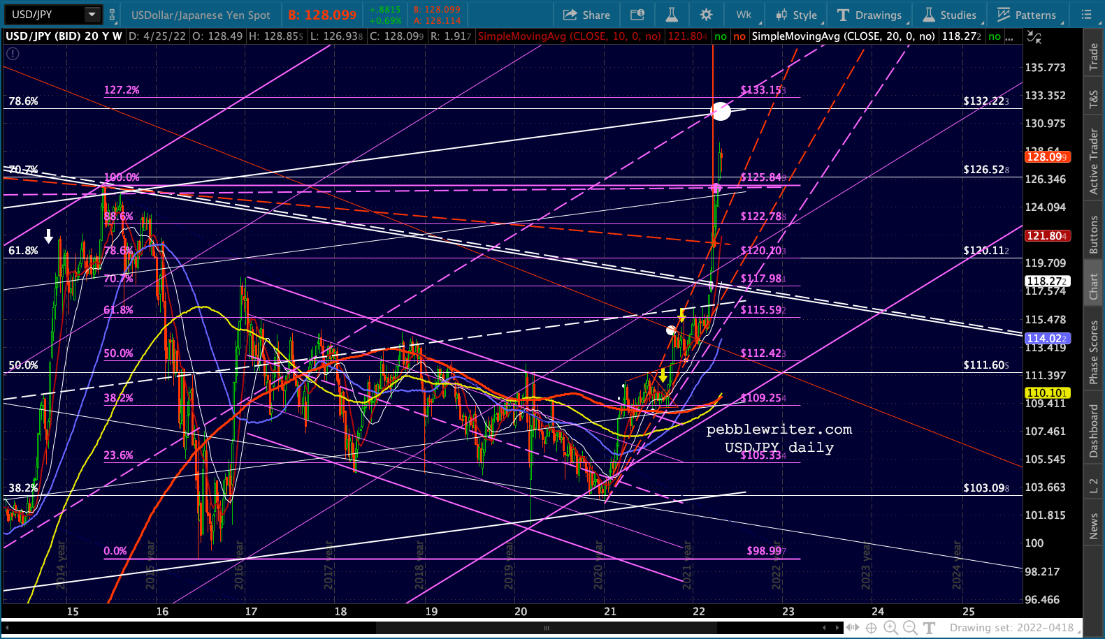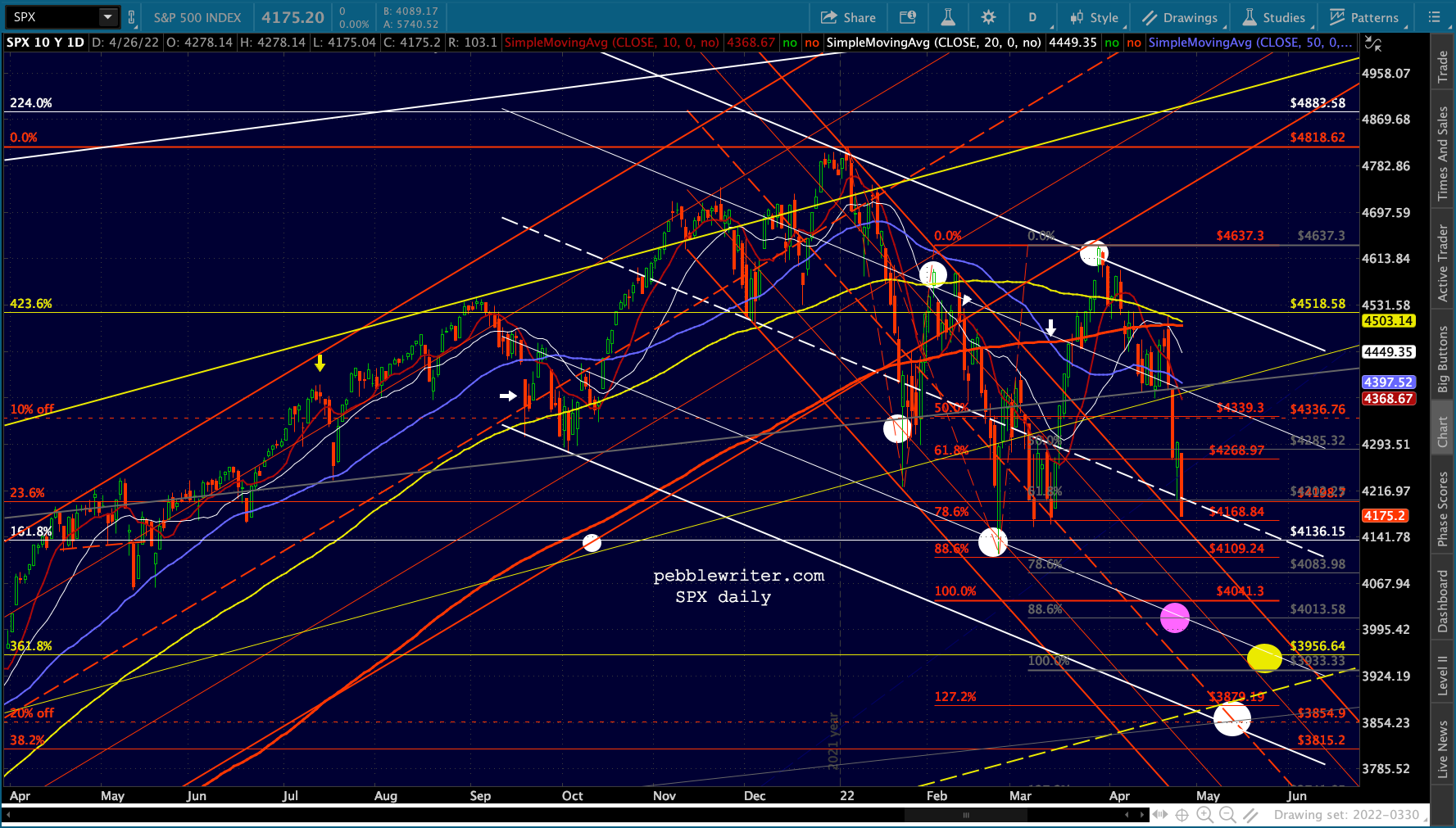 ES’ bounces at the 1.618 are hard to miss. Note that the channel doesn’t reach 4153 until May 2, so it’s entirely possible it’ll bounce around this range for another week.