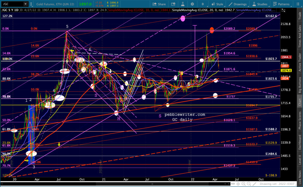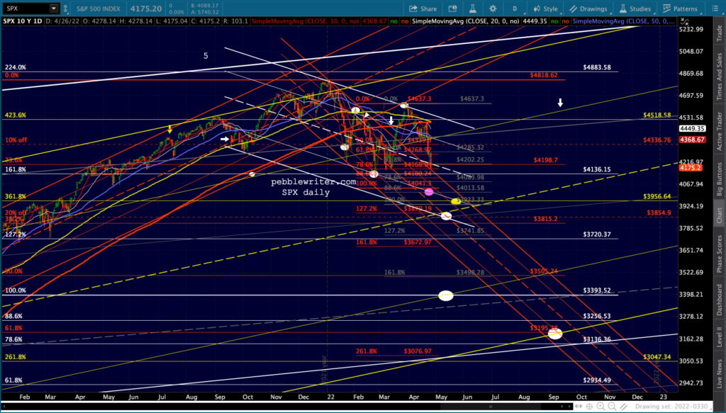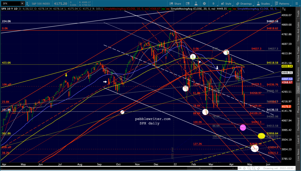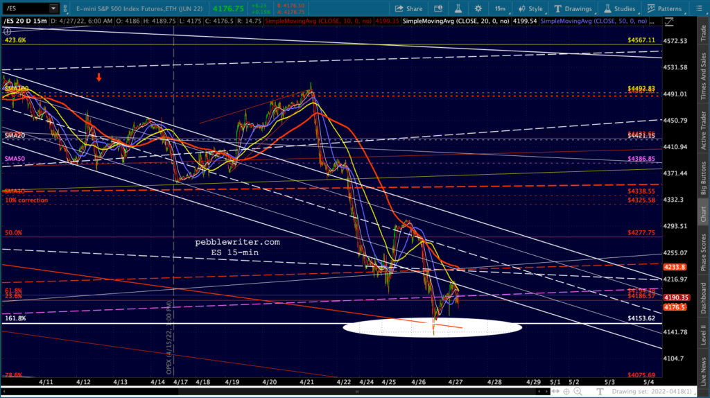 And, the ES version… Within another session or two the MAs will all be bearishly aligned: the 10,20, 50, 100, 200 – all in a row heading south. Note that yesterday’s move accomplished the broken red channel backtest.