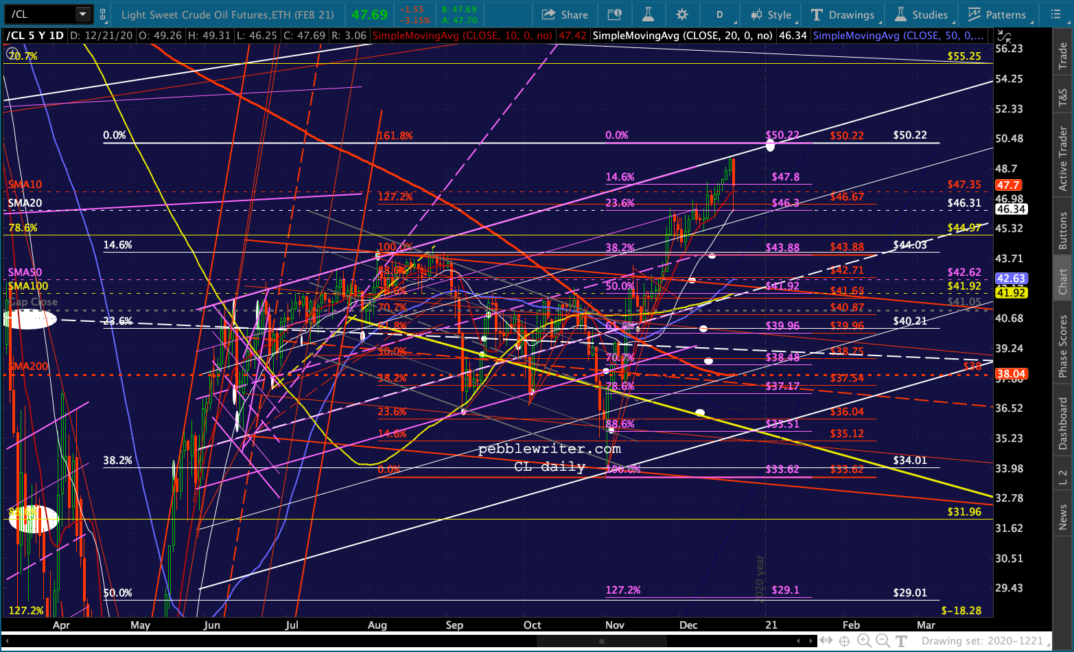 While CL came up 0.79 short of our channel top and 1.618 target at 50.22.