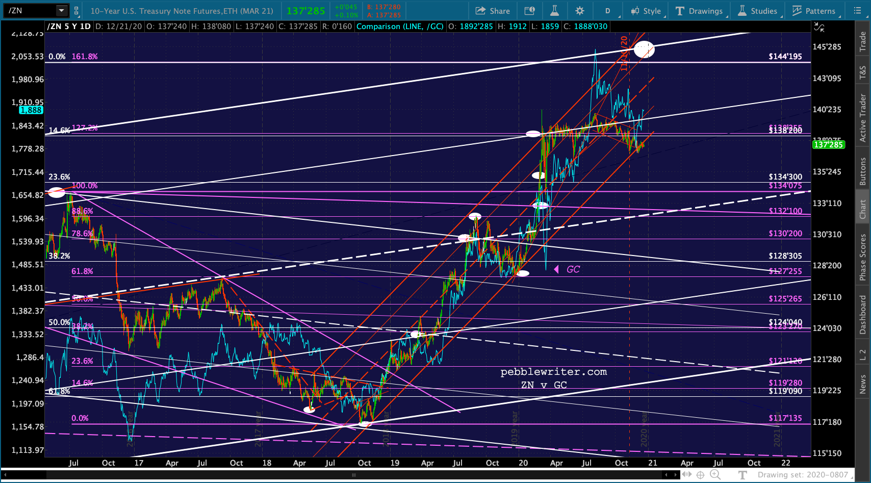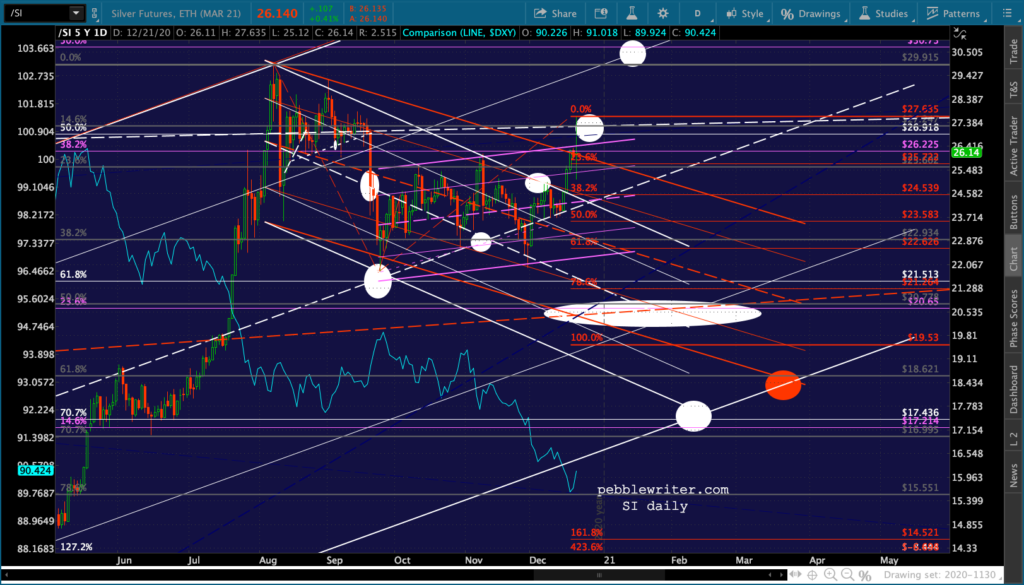 Last, for those following BTC, it officially tagged our target at the 1.272 Fib at 24165.89 pretty much on time with respect to our cycle chart. I believe it will struggle to break out of the rising blue channel and a pullback to backtest the broken rising pink channel is likely.