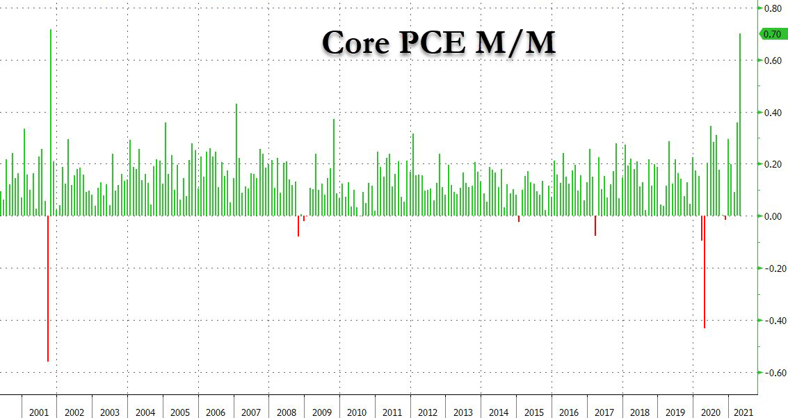 But that argument falls flat when you consider that MoM Core PCE, which is completely unaffected by the base effect, soared by a record 0.7%.