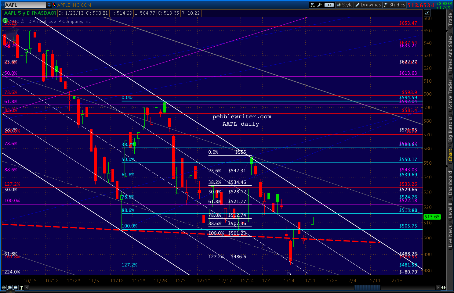 AAPL is up almost 9 points at the moment. A rally past 1426 would take it up out of the falling white channel it’s been in since last August.