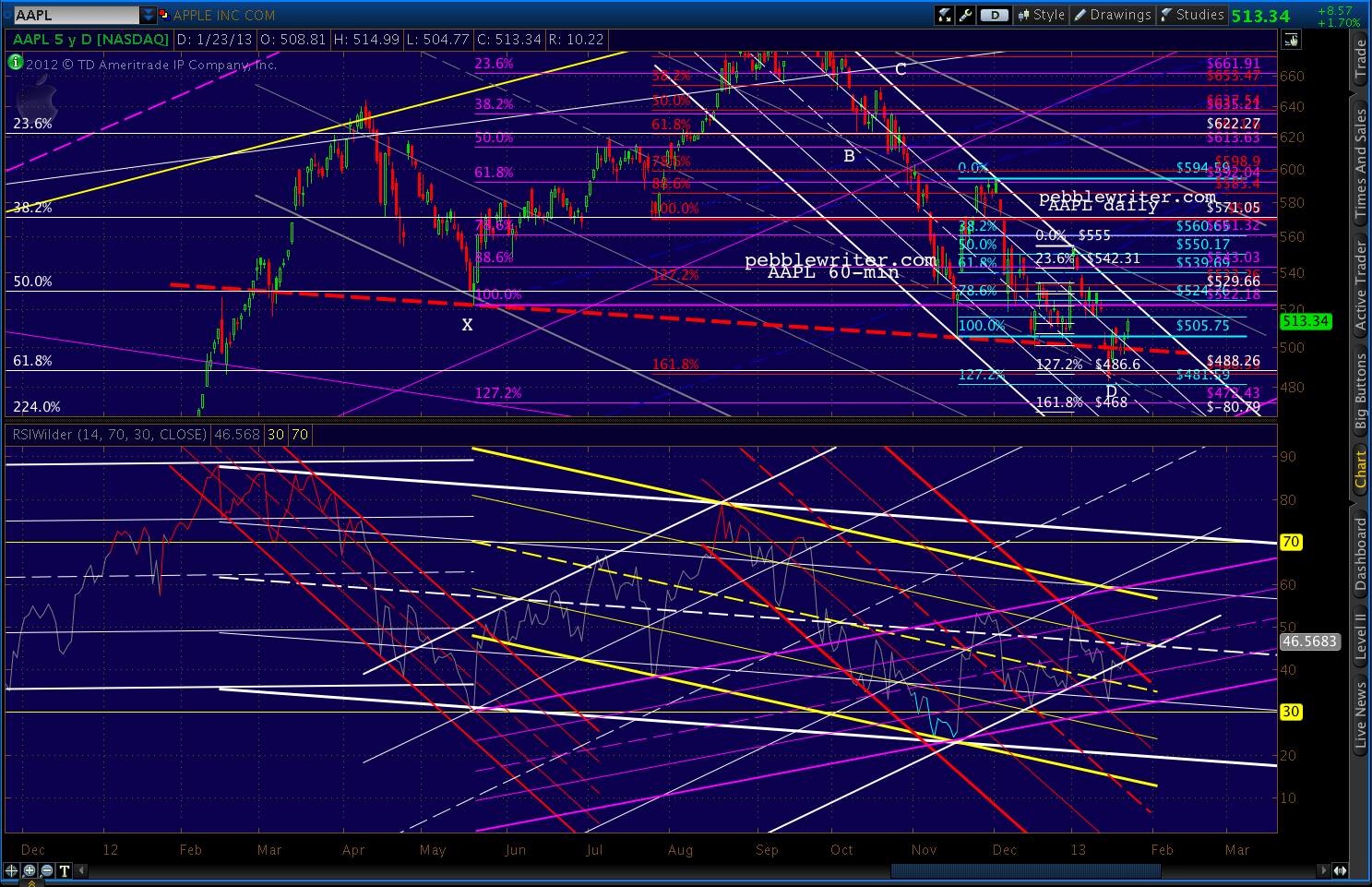 Anything over 515 would take RSI above the white and purple RSI channel midlines. So, as expected, much is riding on the earnings report and how it’s perceived.